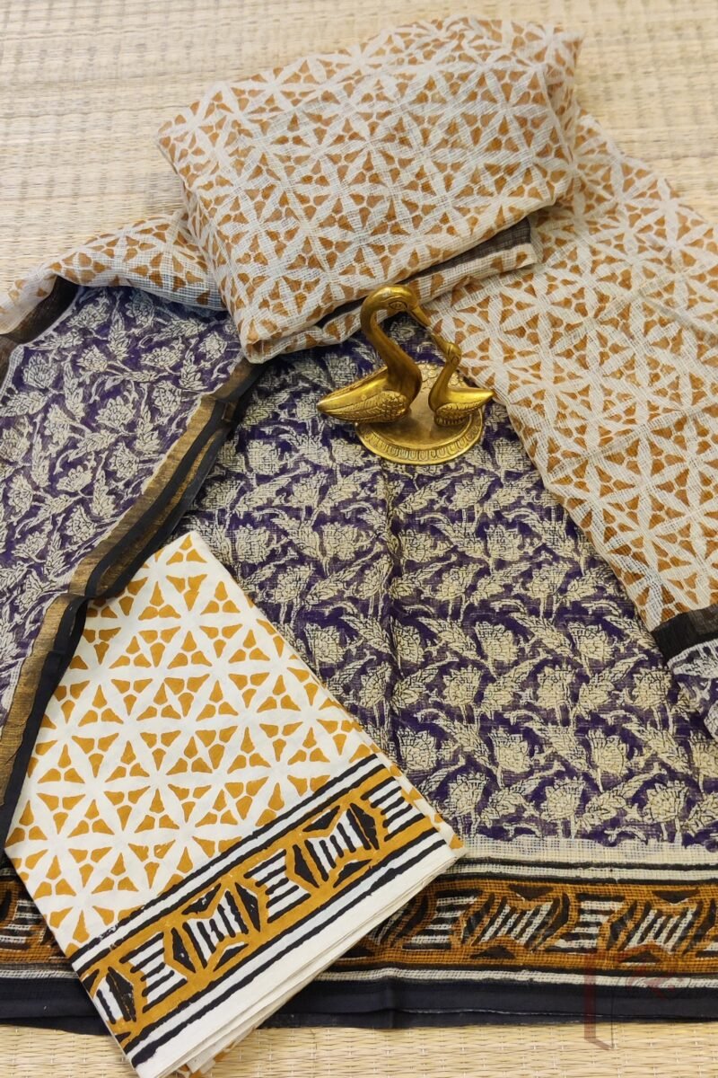 This ink blue Kota kurta showcases fawn floral and leaf motifs outlined in bold black, blending vibrancy with subtlety. The fawn mul cotton bottom carries mustard and black block patterns, lending the set a contemporary artistic touch. The Kota dupatta ties everything together with coordinated motifs, delivering an ensemble that feels light, breathable, and beautifully understated for everyday elegance.