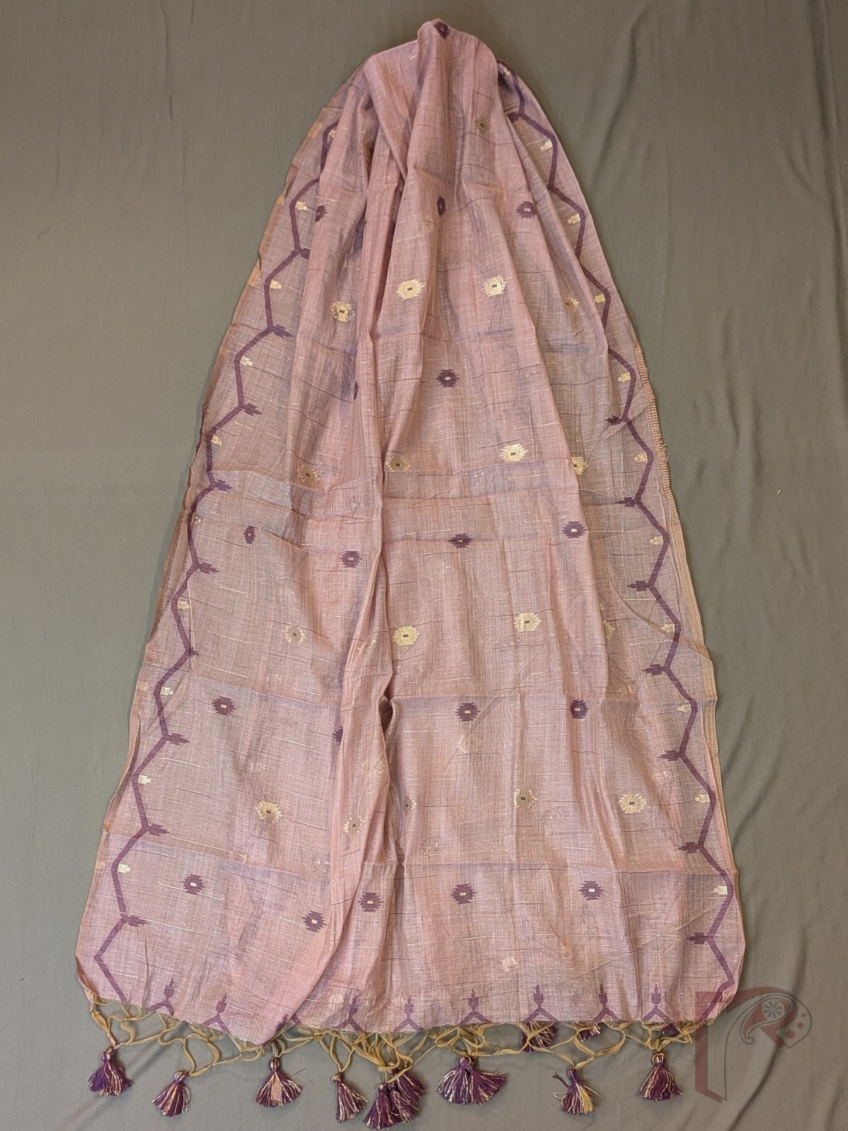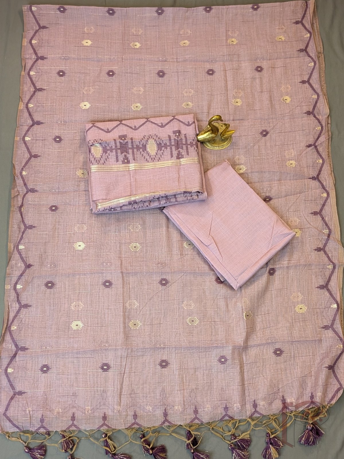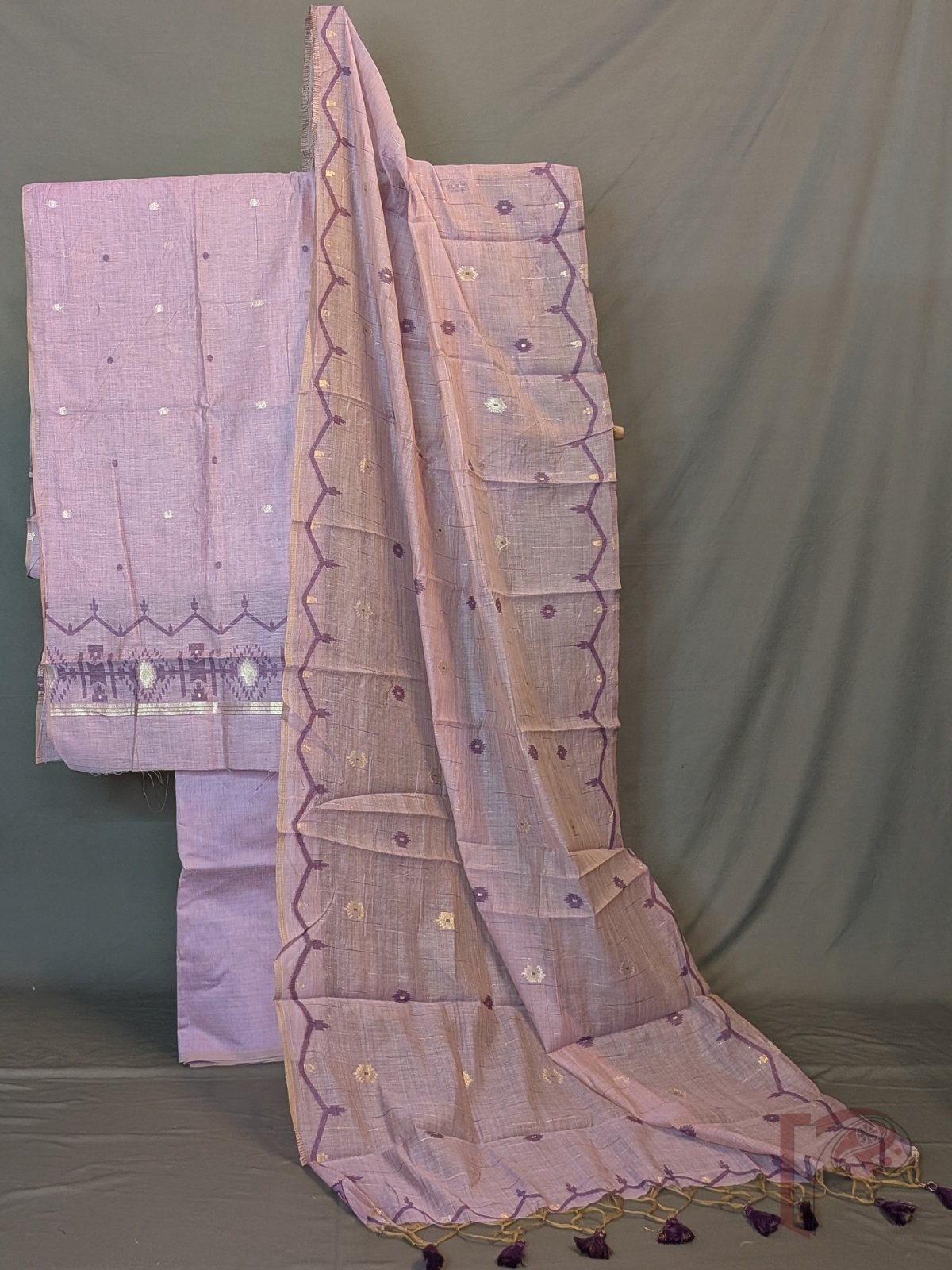 Suit Stories – Lavender Cotton Munga Jamdani Suit Set with Purple Gold Motifs and Tassel Dupatta