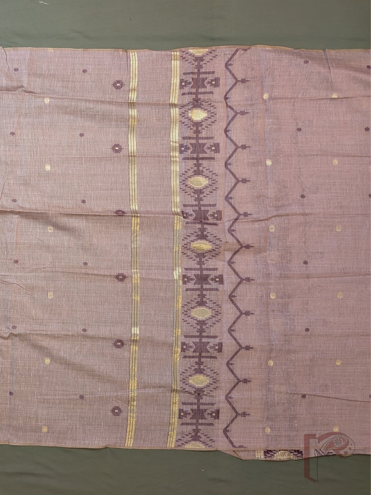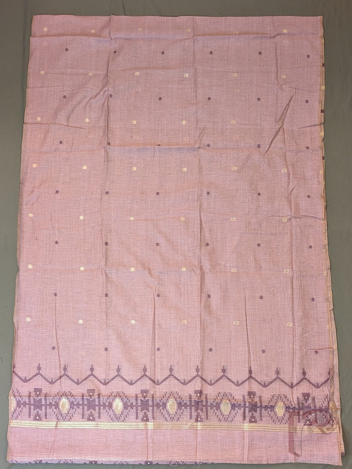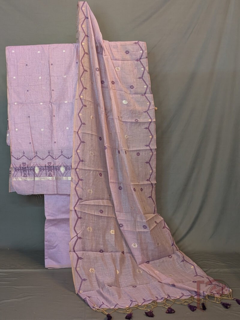 A soft and regal palette defines this suit set, showcasing a lavender cotton munga kurta enriched with traditional Jamdani motifs in deep purple and gold thread on the front panel. Delicate polka dot weaves add texture and charm, while the coordinated dupatta features woven borders and small motifs with purple tassels. Paired with a plain lavender bottom, this set offers a perfect blend of subtle shimmer, heritage weaving, and contemporary elegance.