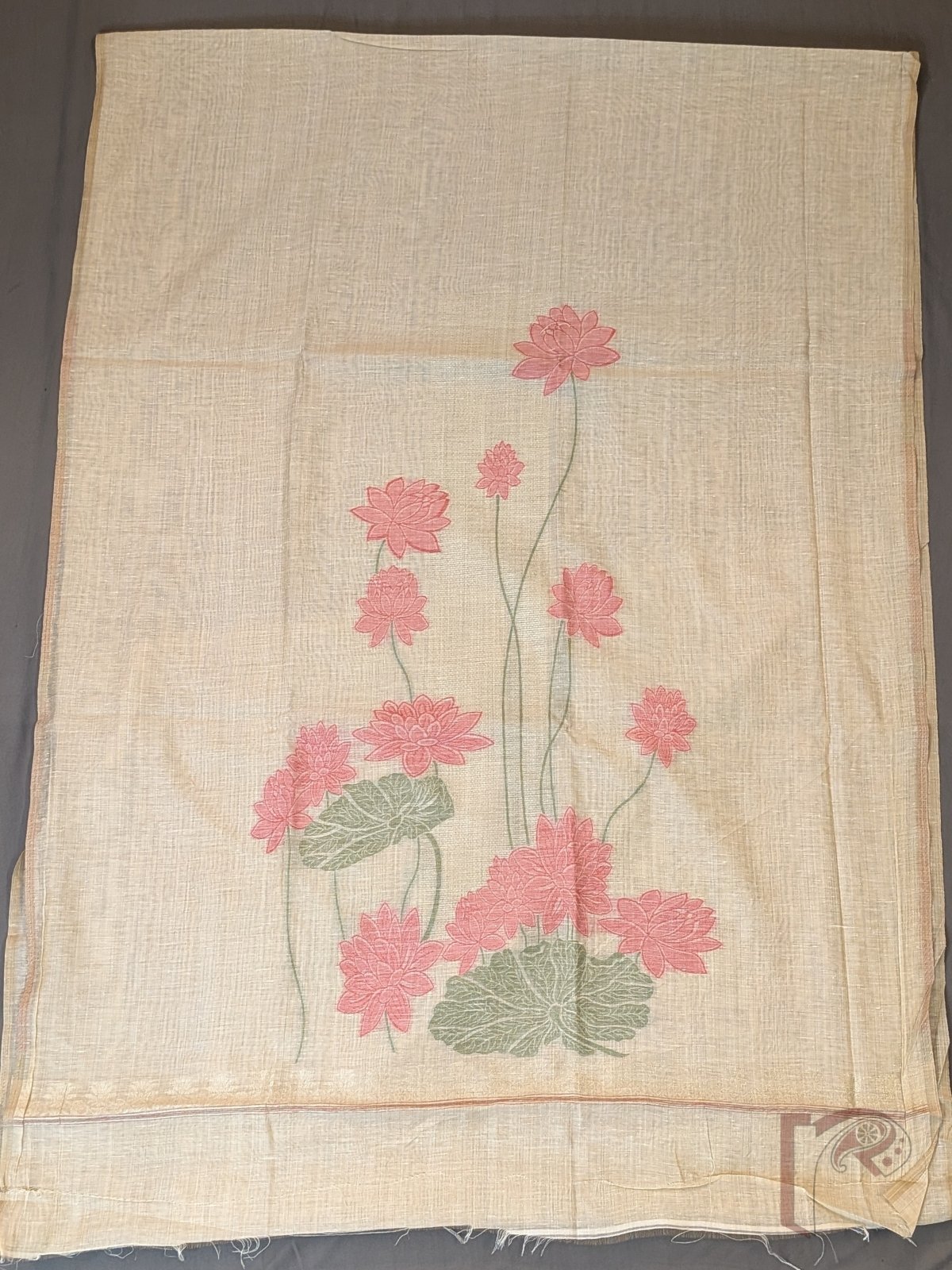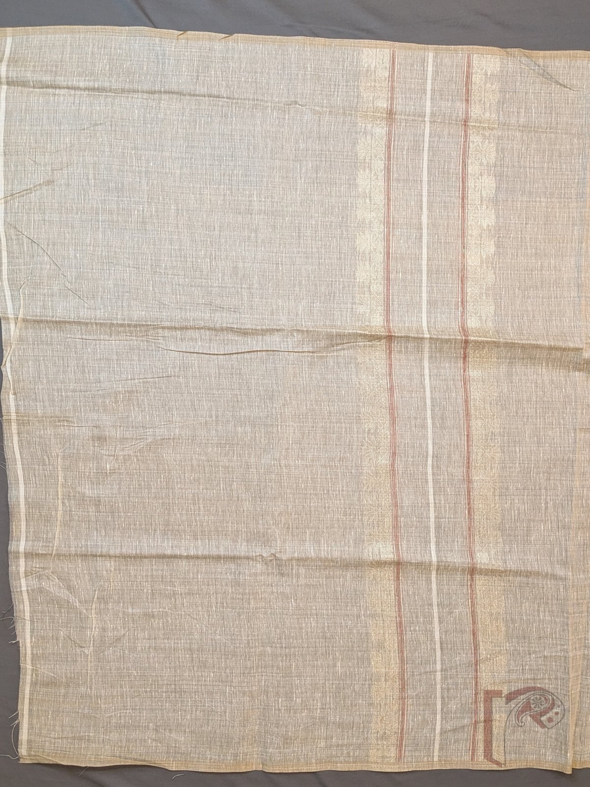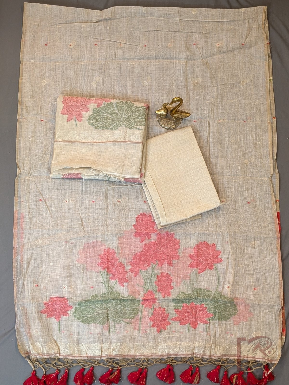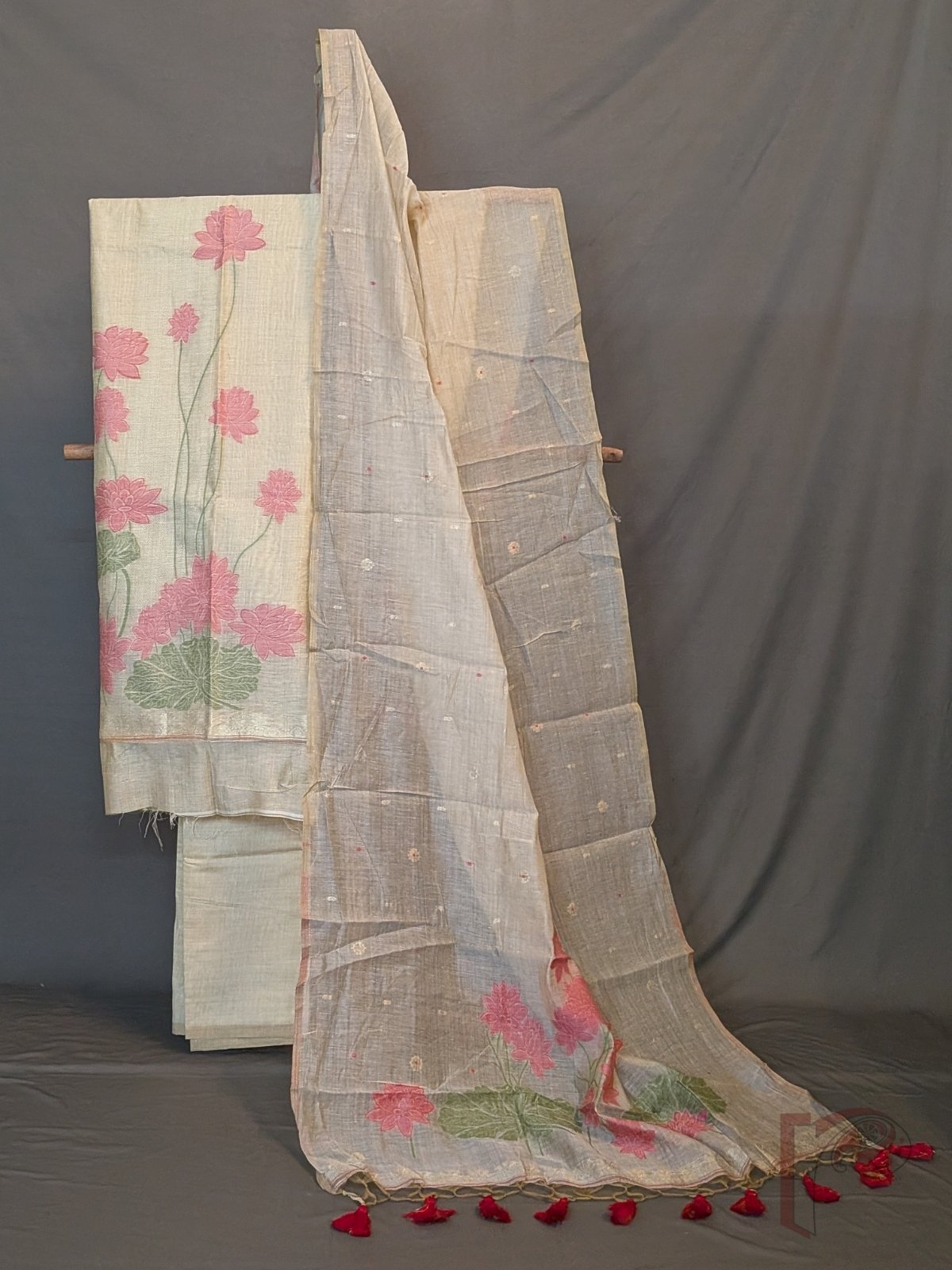 Suit Stories – Light Beige Cotton Munga Jamdani Suit Set with Pink Lotus Floral Weave and Red Tassel Dupatta