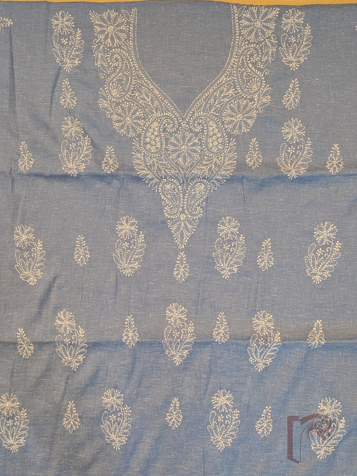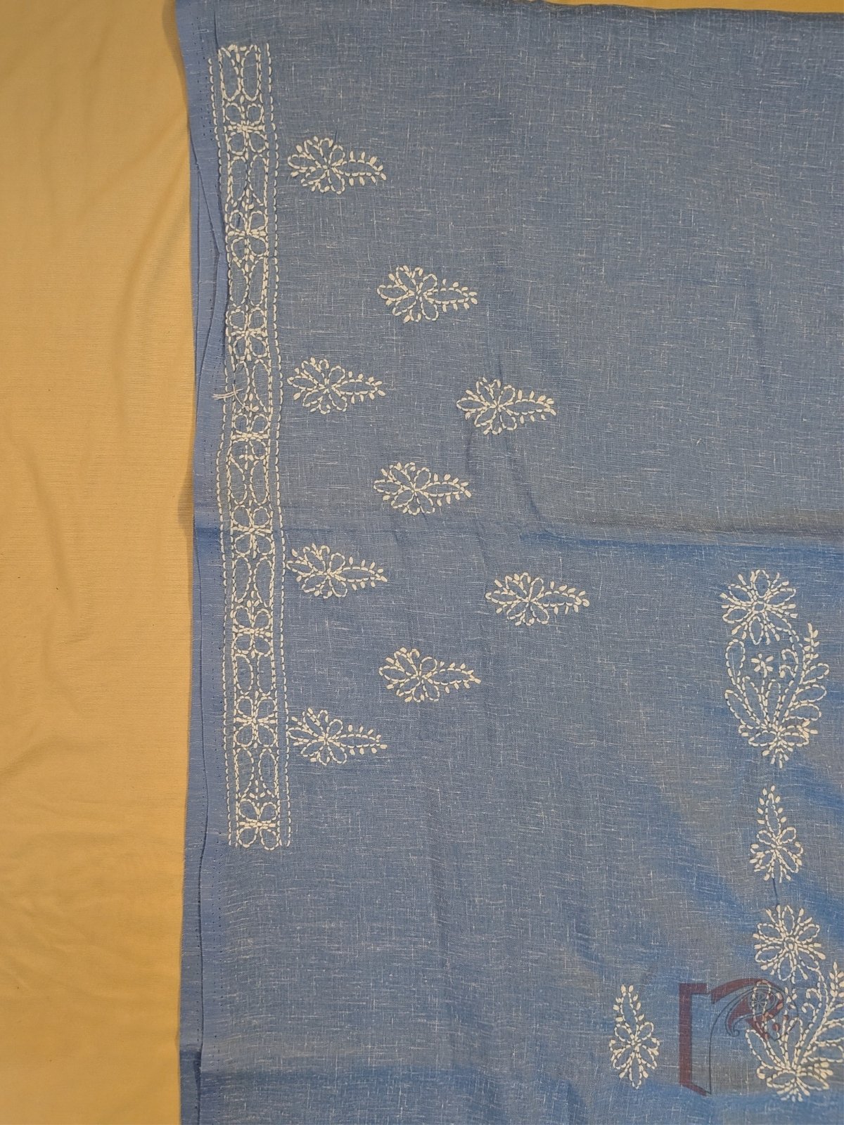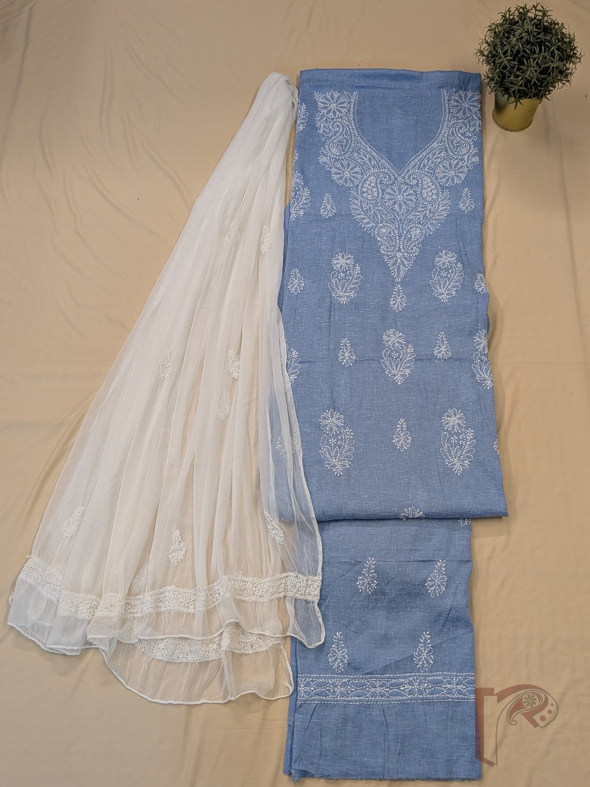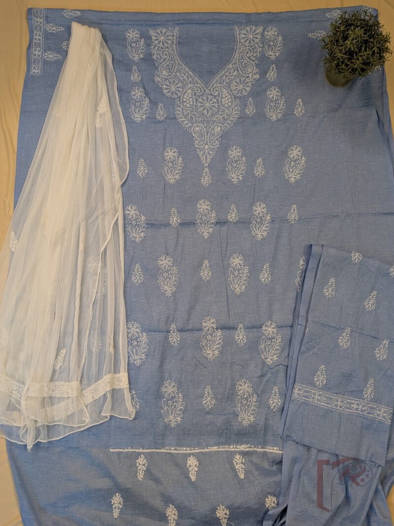Suit Stories – Light Blue Textured Khadi Cotton Lucknowi Chikan Embroidered Unstitched Suit with White Chiffon Dupatta and Embroidered Pant Border
