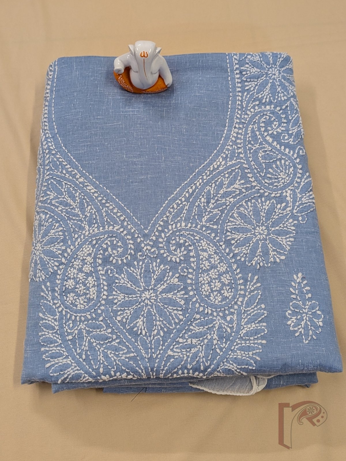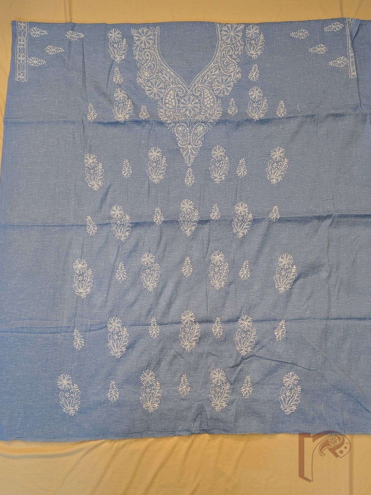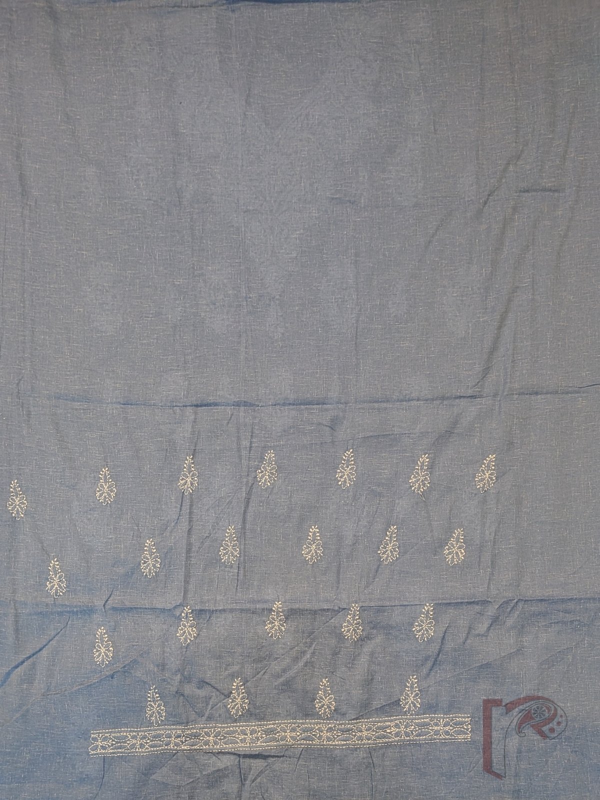Suit Stories – Light Blue Textured Khadi Cotton Lucknowi Chikan Embroidered Unstitched Suit with White Chiffon Dupatta and Embroidered Pant Border