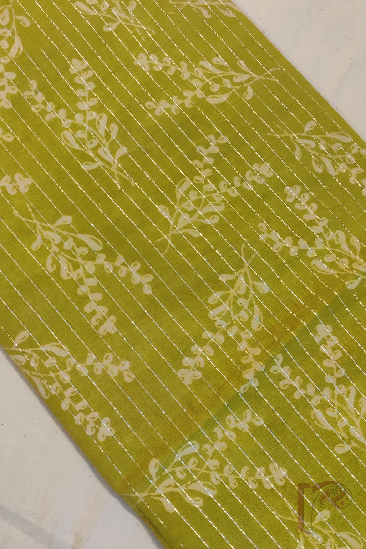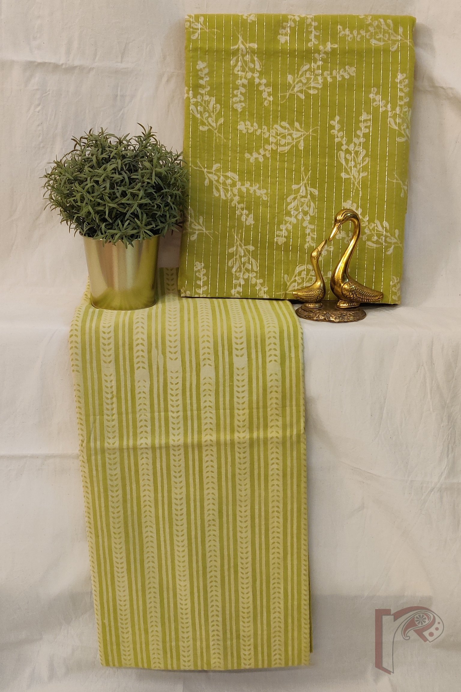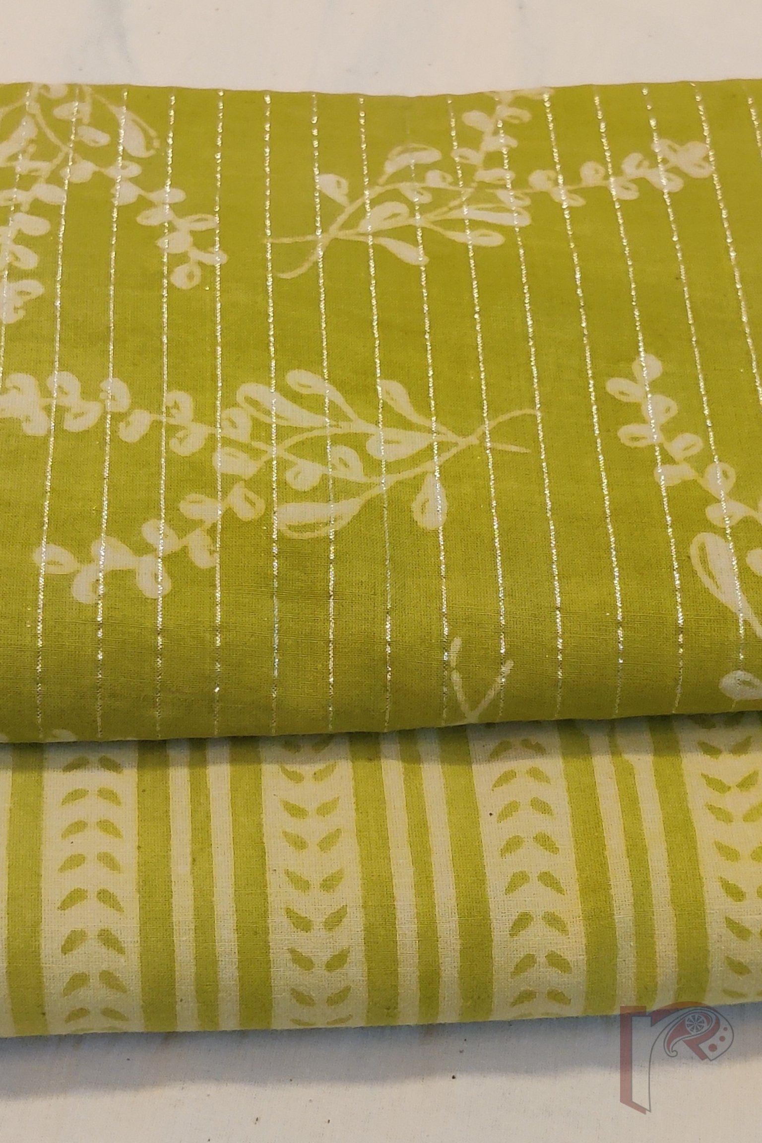Suit stories – Lime Green and Light Lime Mulmul Suit with Leaf Bunch Kurta and Stripe Bottom