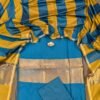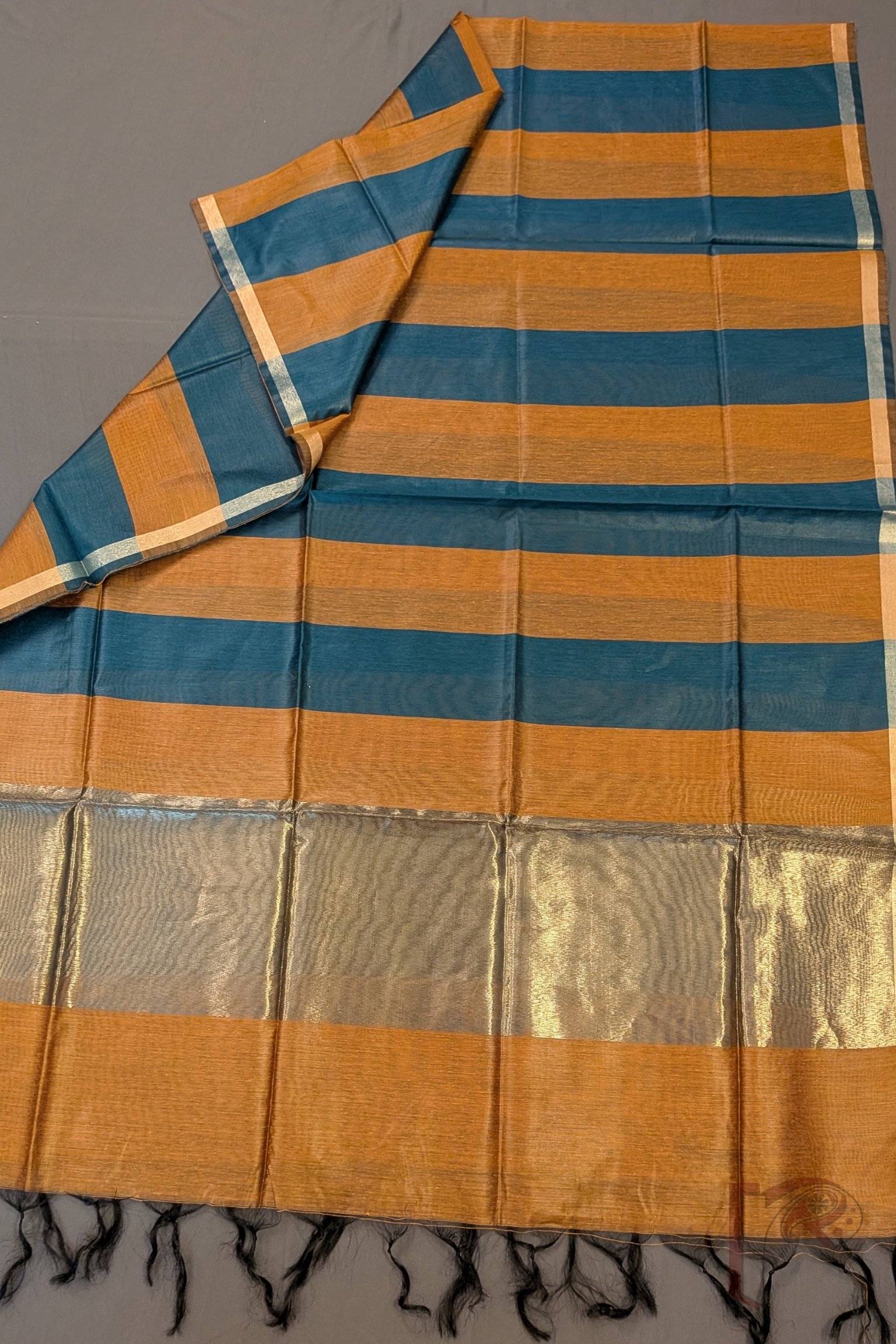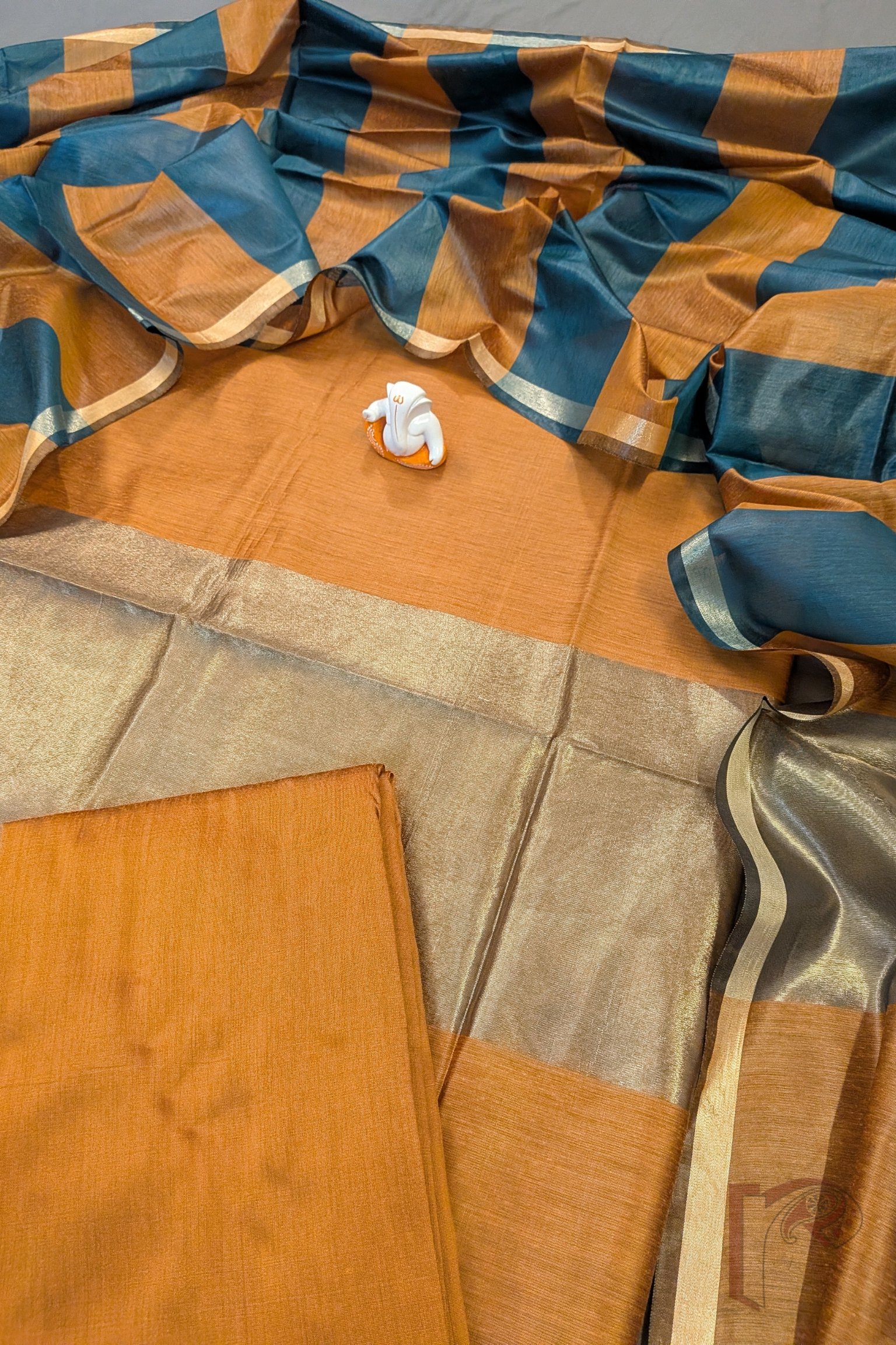 This mustard mercerised cotton Banarasi suit material exudes warm elegance with its beautifully woven gold 8-inch zari border that highlights the kurta’s base in a refined yet striking way. The dupatta features alternating mustard and rama green panel stripes, enhanced by a delicate zari edge that brings gentle shimmer and movement. Paired with a mustard bottom fabric that feels both traditional and stylish. The mercerised cotton gives the set a luxurious sheen and soft structured drape, making it an ideal pick for festive gatherings, cultural events, or graceful daywear.