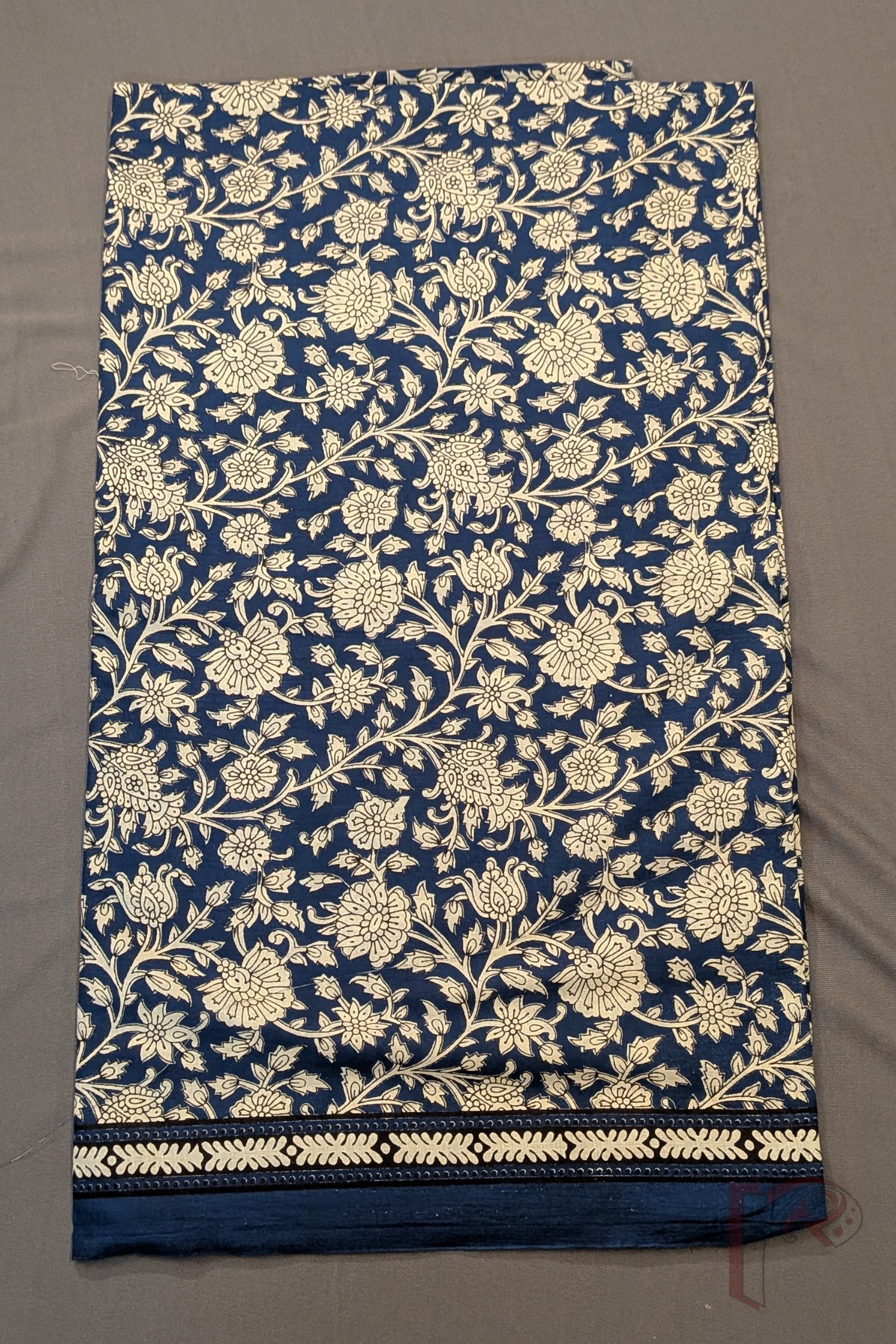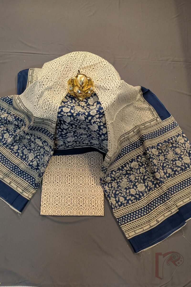 Suit stories – Navy Blue & Cream Kalamkari Floral Soft Mul Cotton Suit Material Set with Abstract Print Bottom & Blue Border Dupatta