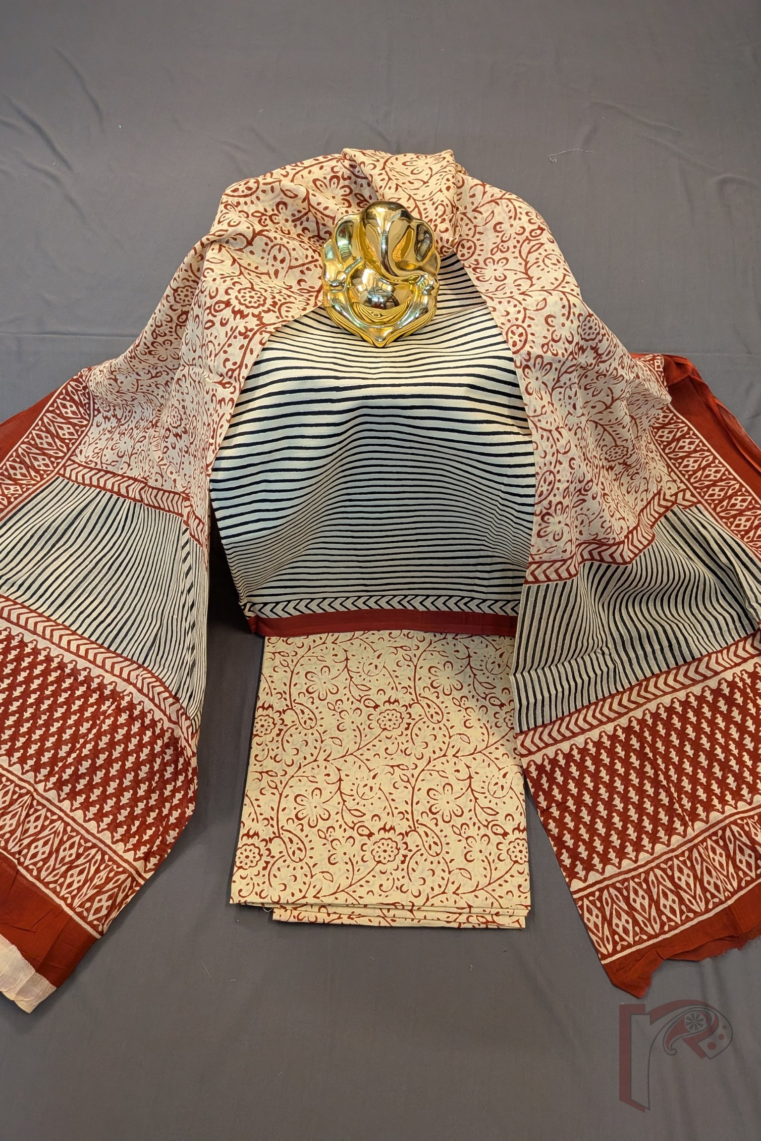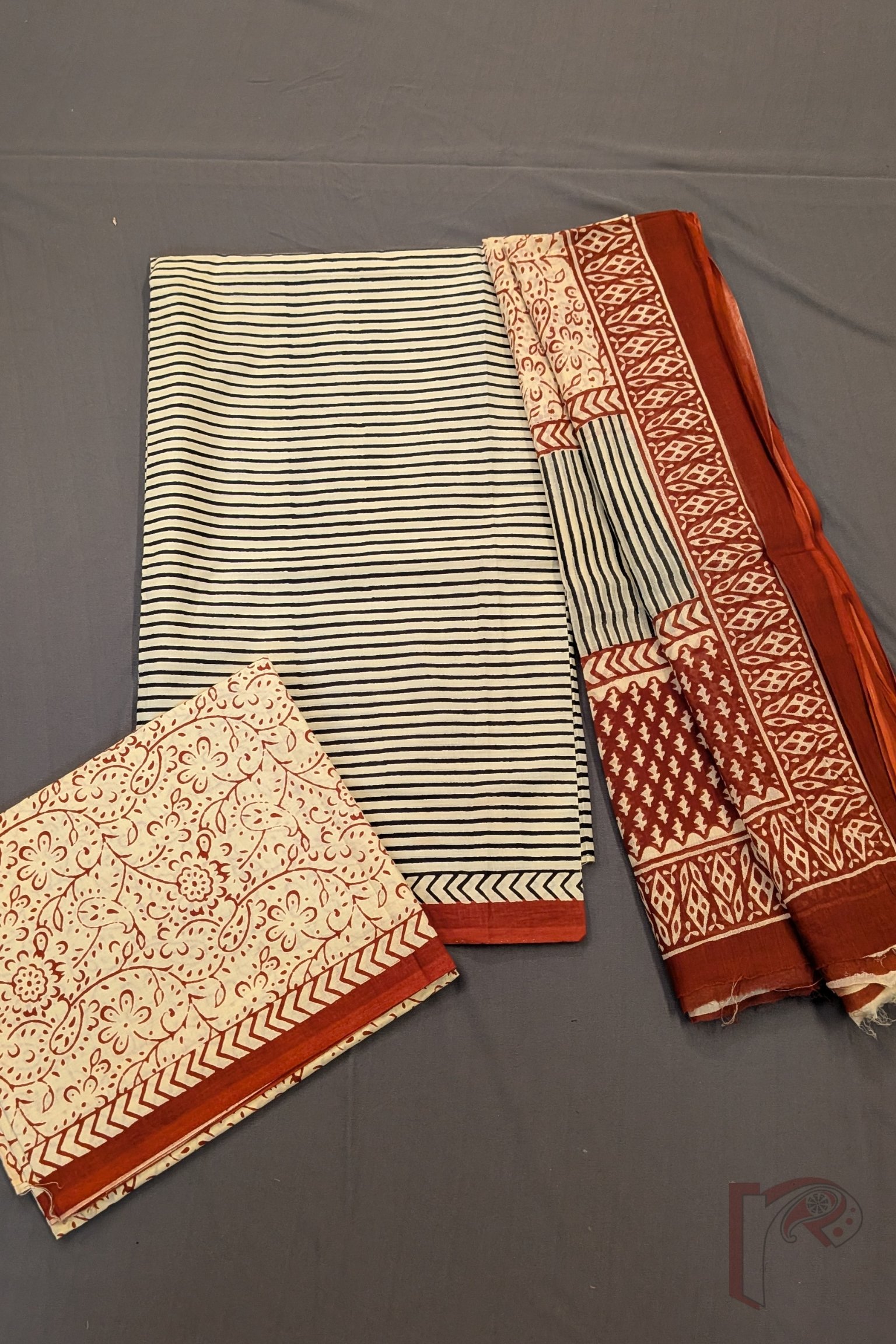 Suit stories – Offwhite & Black Pin Stripe Mul Cotton Suit Set with Rust Orange Floral & Herringbone Accents