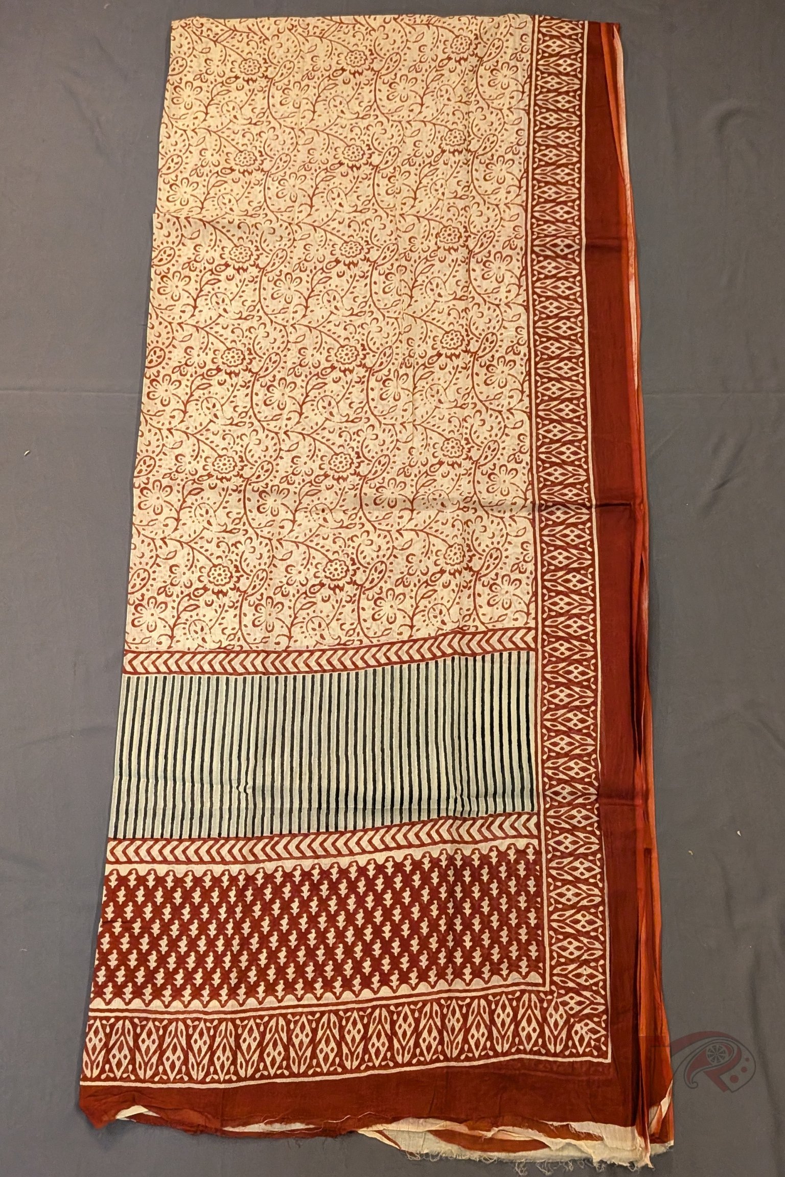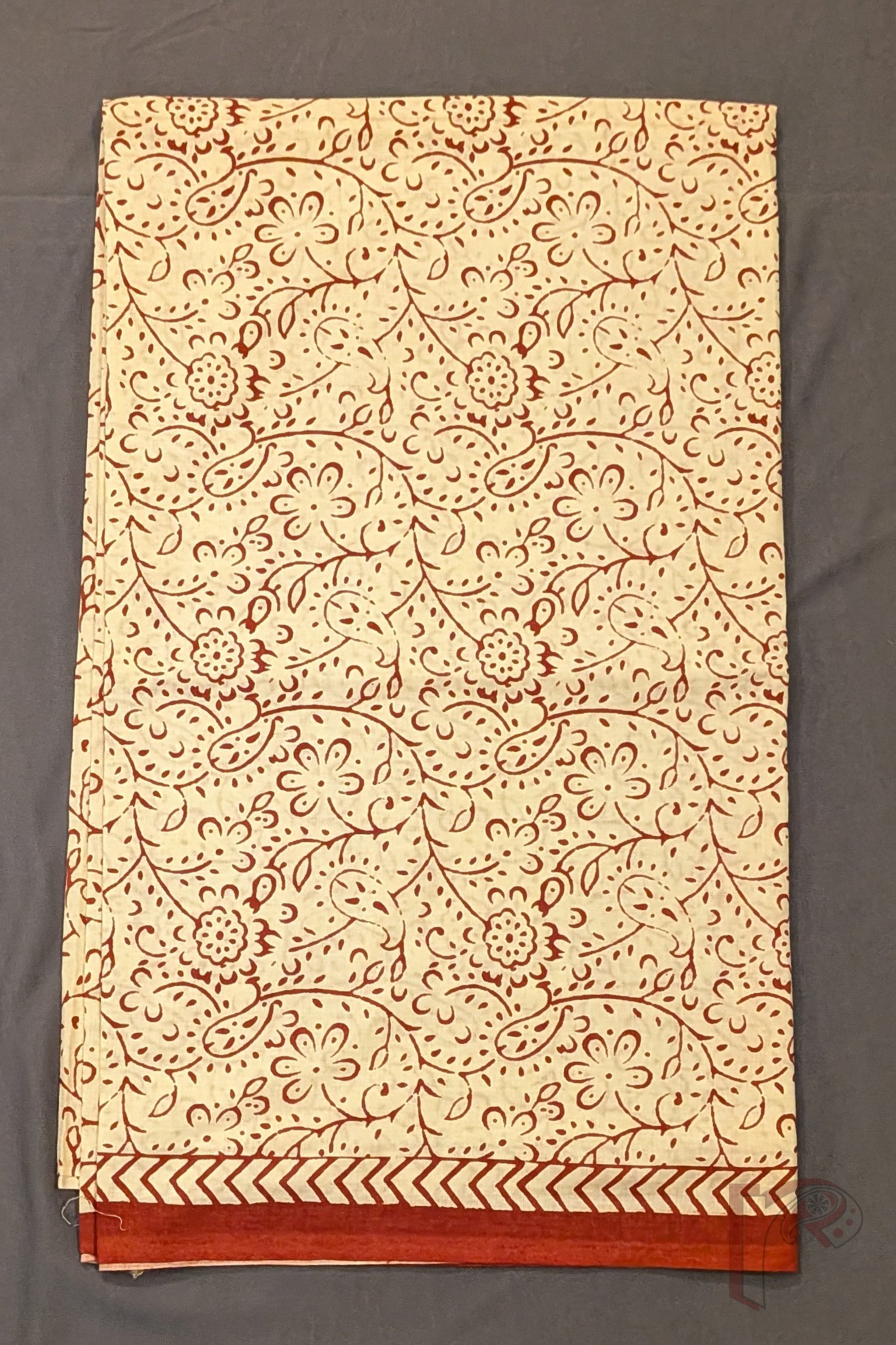 Sophisticated and contemporary, this Offwhite & Black Pin Stripe Mul Cotton Suit Set blends minimal design with vibrant accents. The kurta features sleek black pin stripes enhanced by a single herringbone detail and a 1-inch rust orange selvage border, creating a sharp tailored effect. The cream bottom fabric carries rust orange floral and kairi leaf motifs, adding warmth and traditional charm. The dupatta beautifully combines classic rust floral prints with black pin stripes, finishing with a bold 10-inch rust border on both ends for a striking statement. Crafted in breathable mul cotton, this set is refined yet lively.