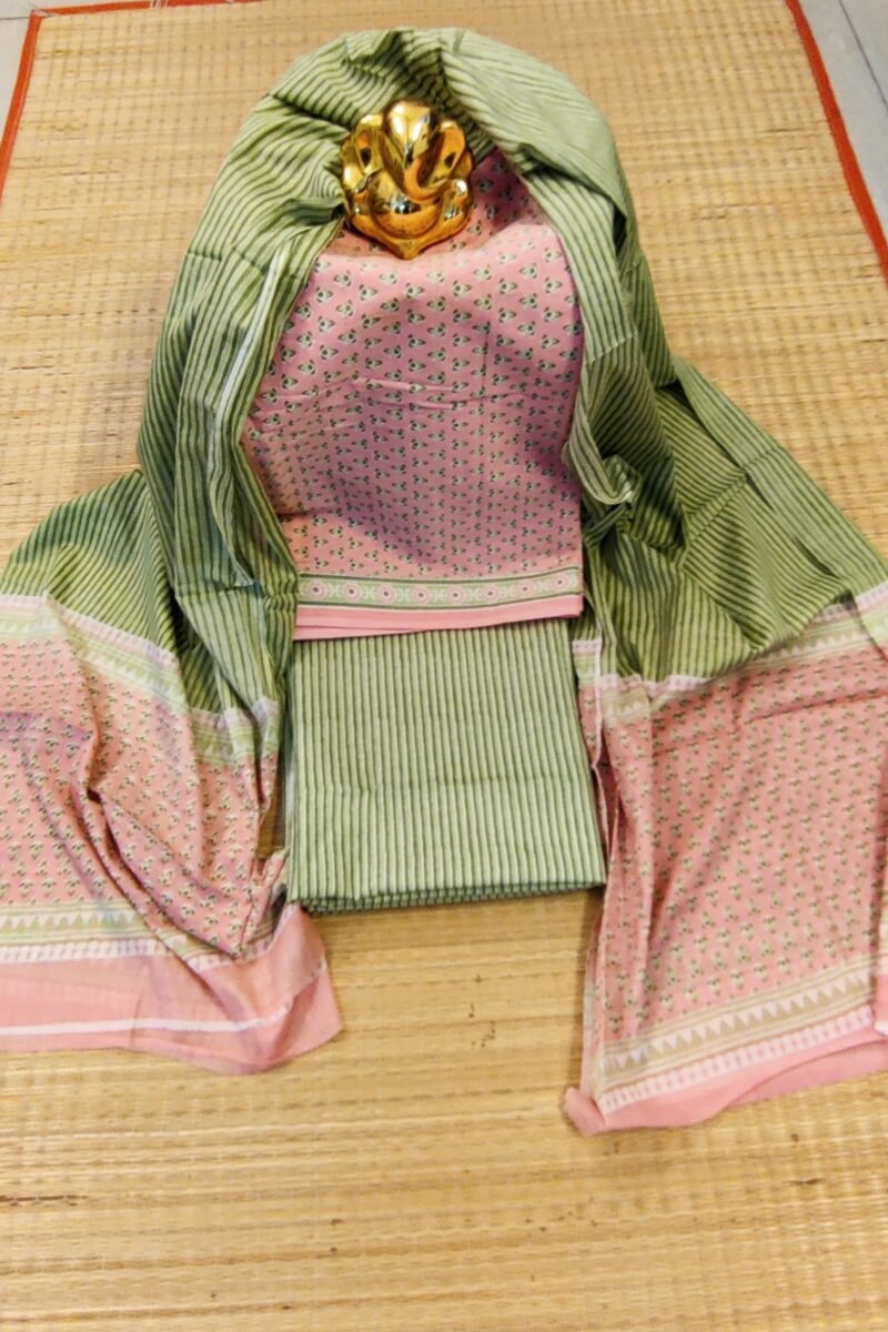 Suit stories – Pink with Olive Green Buds Mulmul Cotton Suit Set