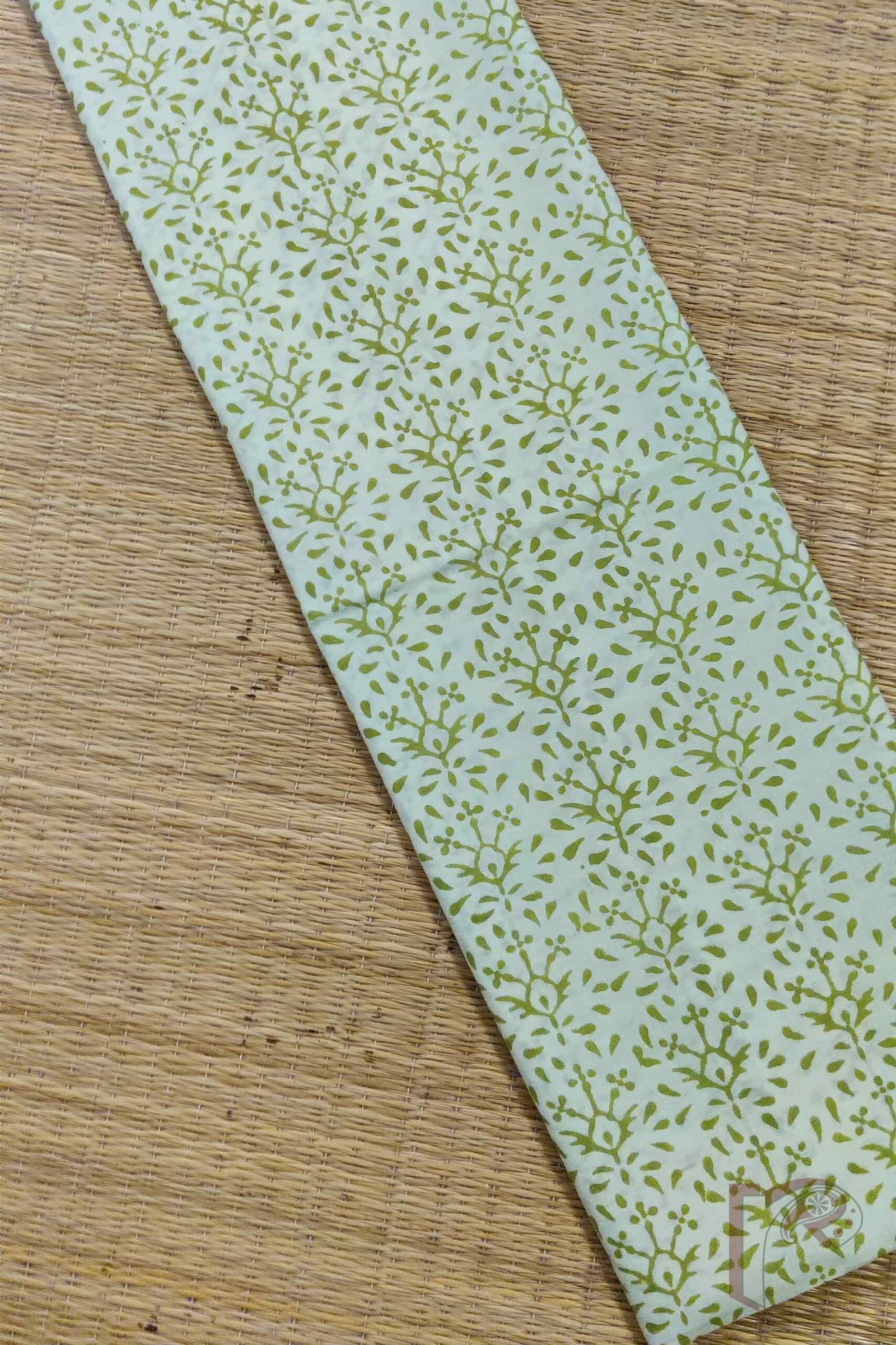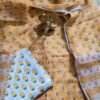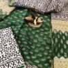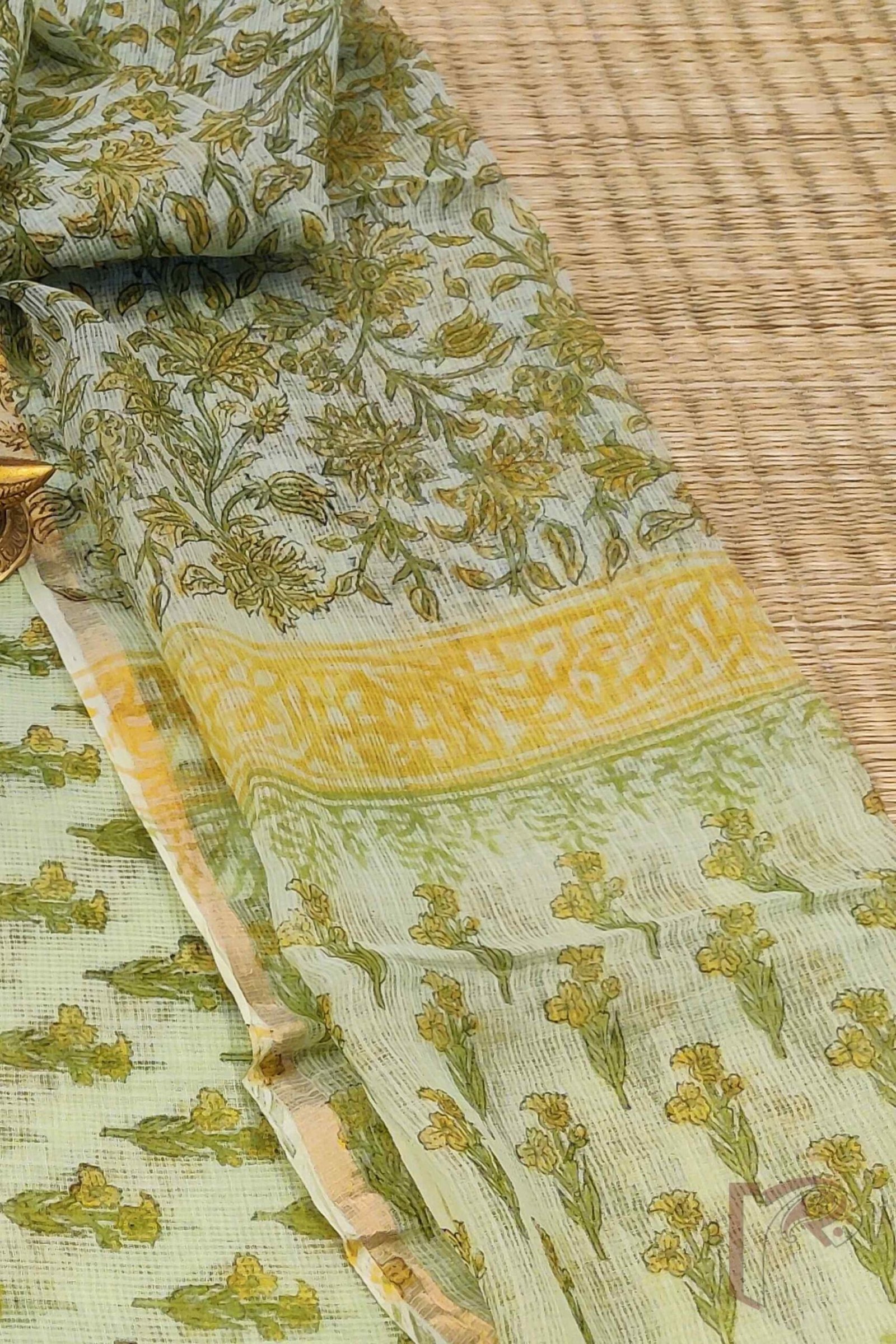 This pista green Kota kurta carries small yellow flowers with gentle green stalks, radiating freshness. Paired with a pista cotton bottom featuring dark green all-over prints, and a matching dupatta with dual block designs, the set feels soft, breezy, and naturally graceful.