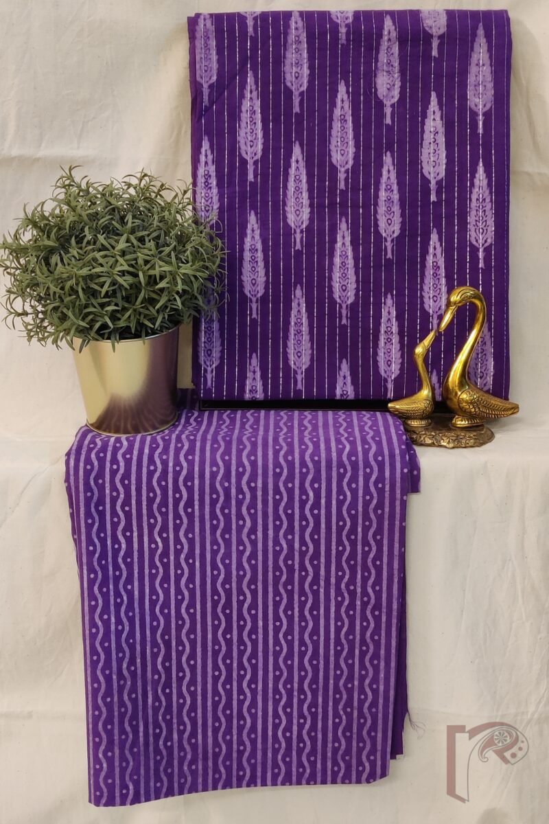 This delightful purple mulmul suit carries elongated off-white leaf motifs cascading vertically across the kurta. The bottom fabric adds flair with its mix of vertical straight and wavy lines dotted with miniature polka accents. Comfortable, feather-light, and artistic, this suit is perfect for those who enjoy bold colour paired with unique handcrafted charm.