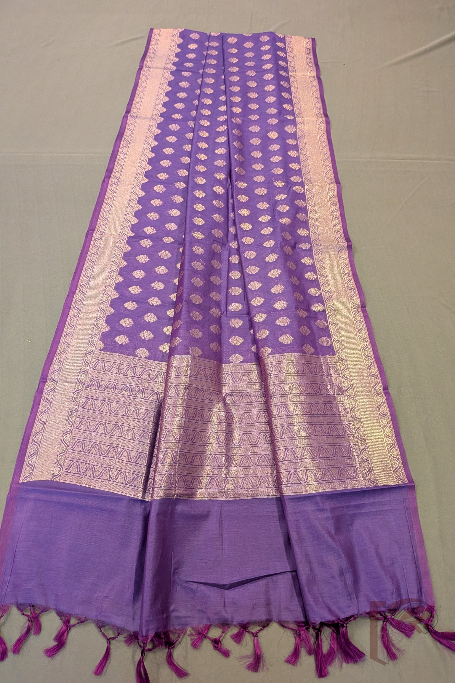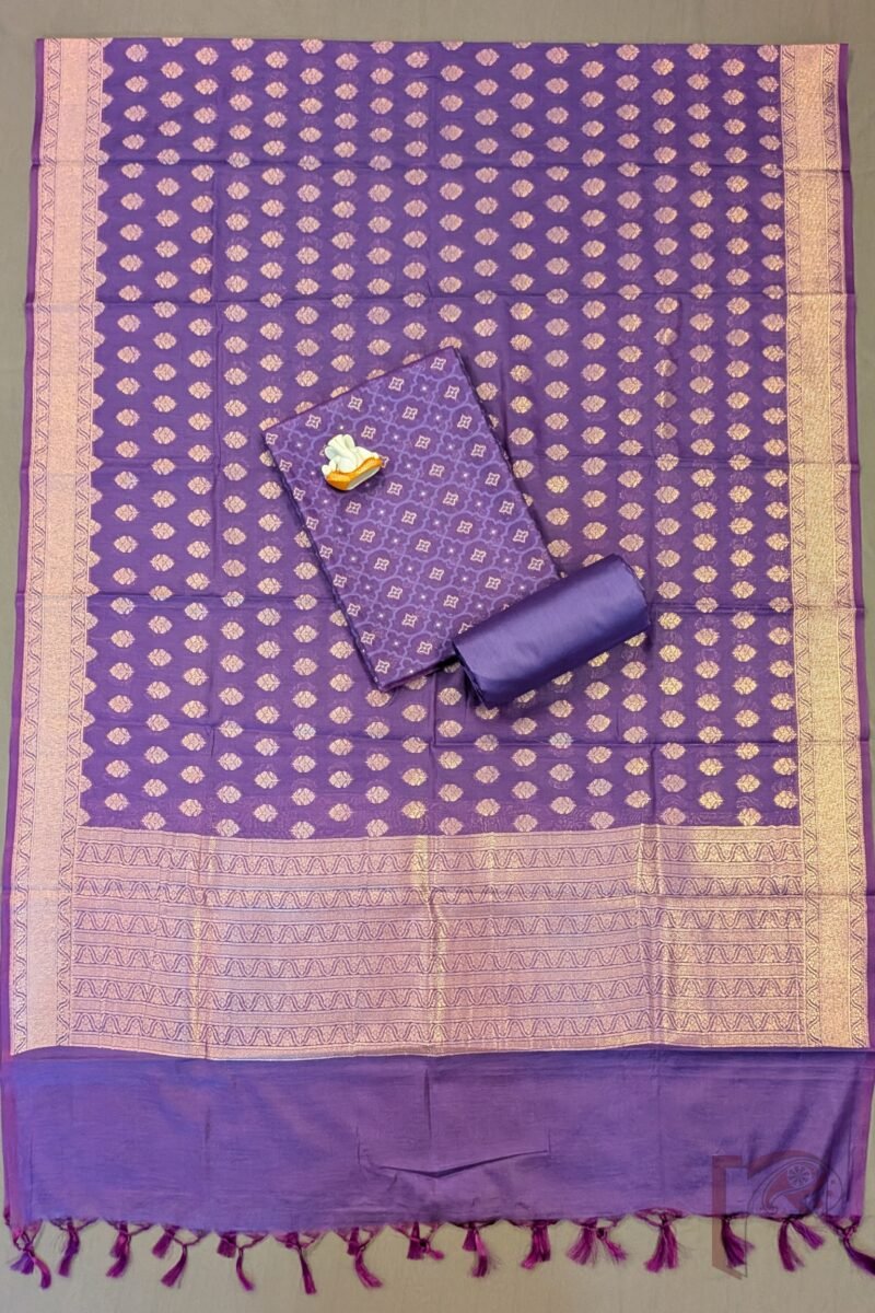 This luxurious purple Banarasi cotton silk suit showcases a kurta adorned with self-woven jal motifs accompanied by elongated four-petal gold flowers, bringing depth and refinement to the design. The plain purple bottom maintains a cohesive elegance, while the dupatta is enriched with gold-woven flower-on-stem motifs and bordered grandly with zari on both sides. The soft cotton-silk base ensures comfort while providing a rich, regal drape, making it ideal for festive evenings and celebratory events.