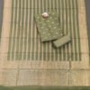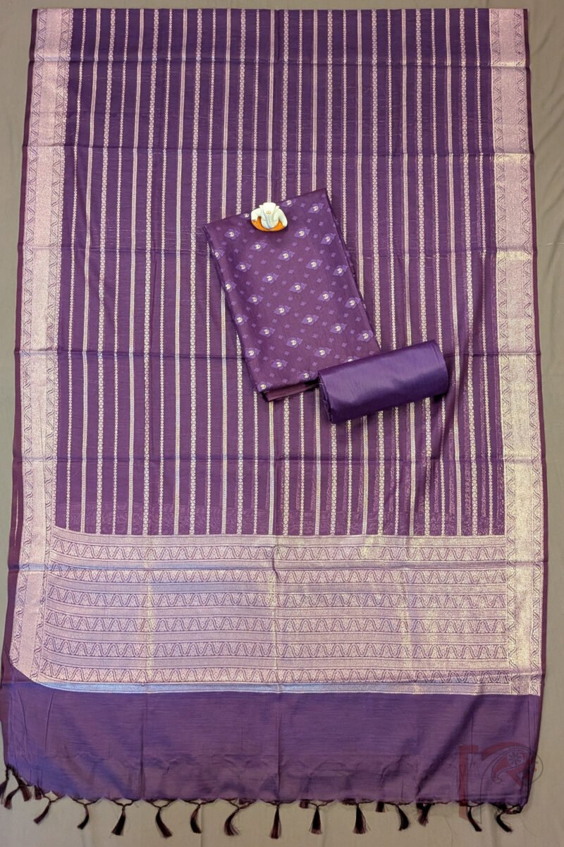 This pretty purple cotton silk Banarasi suit material showcases a kurta piece adorned with self-colour woven medium and small leaf motifs, accented with delicate gold leaf bunches, creating a soft yet intricate texture that enriches the deep purple tone. Paired with a plain purple cotton silk bottom, the ensemble maintains a regal and harmonious aesthetic. The dupatta elevates the look with straight lines of small abstract shapes, a 2″ Paithani-inspired border, and broad gold zari edges featuring meandering line patterns, blending traditional craftsmanship with artistic flair. Crafted from smooth, breathable cotton silk with authentic Banarasi weaving, this suit material offers a luxurious drape, refined elegance, and a striking yet tasteful presence—perfect for festive celebrations, special occasions, and timeless traditional styling.