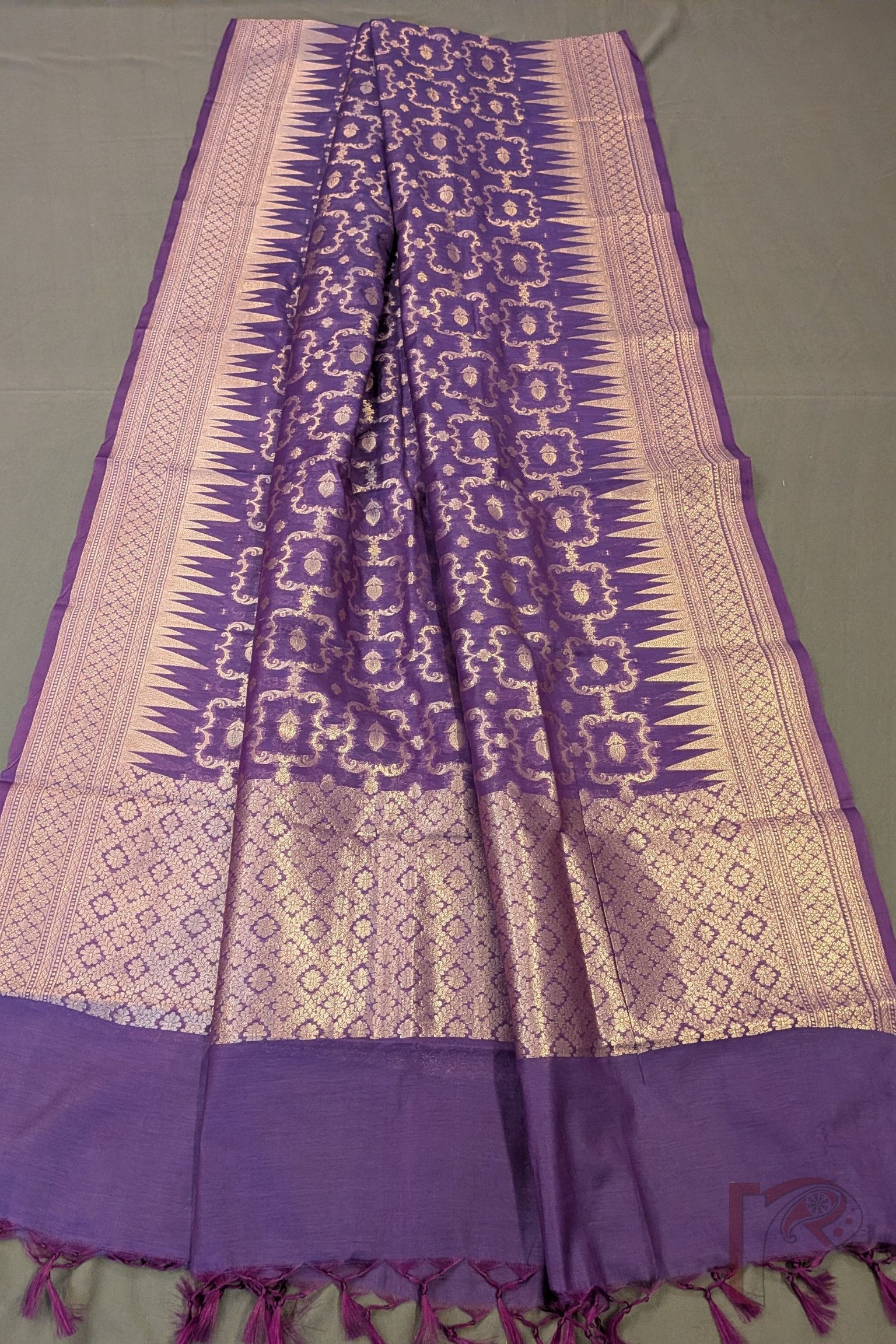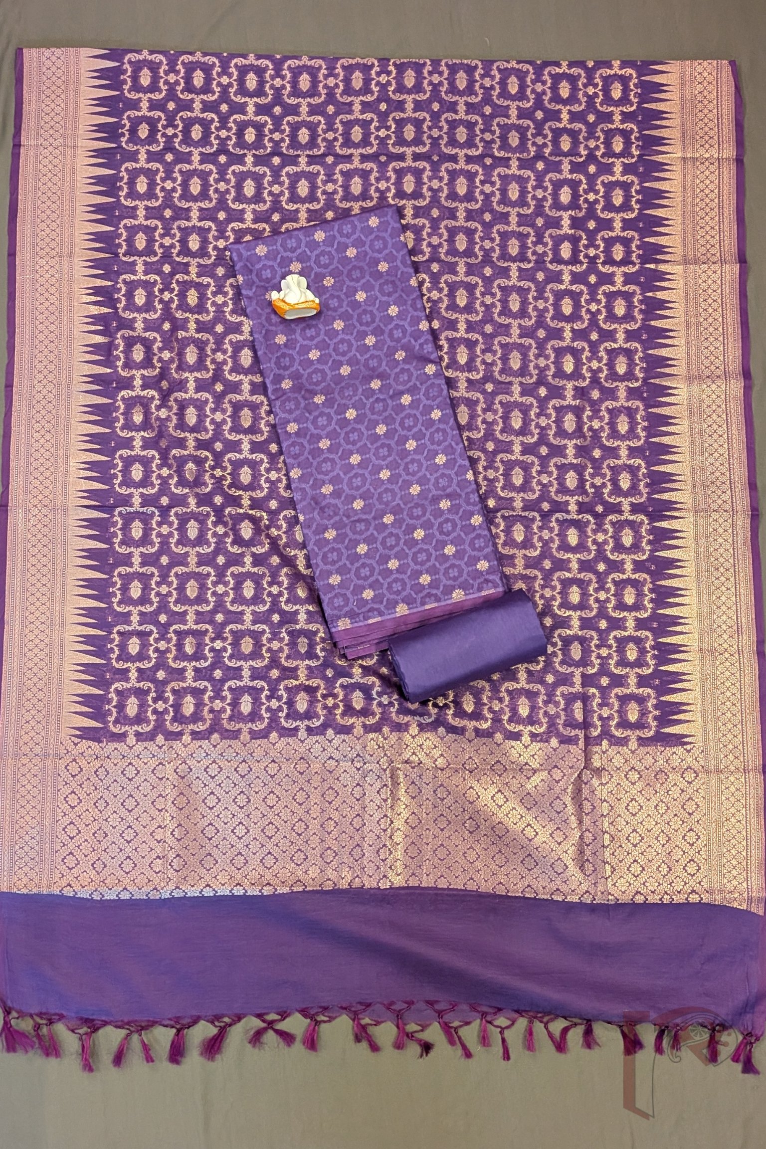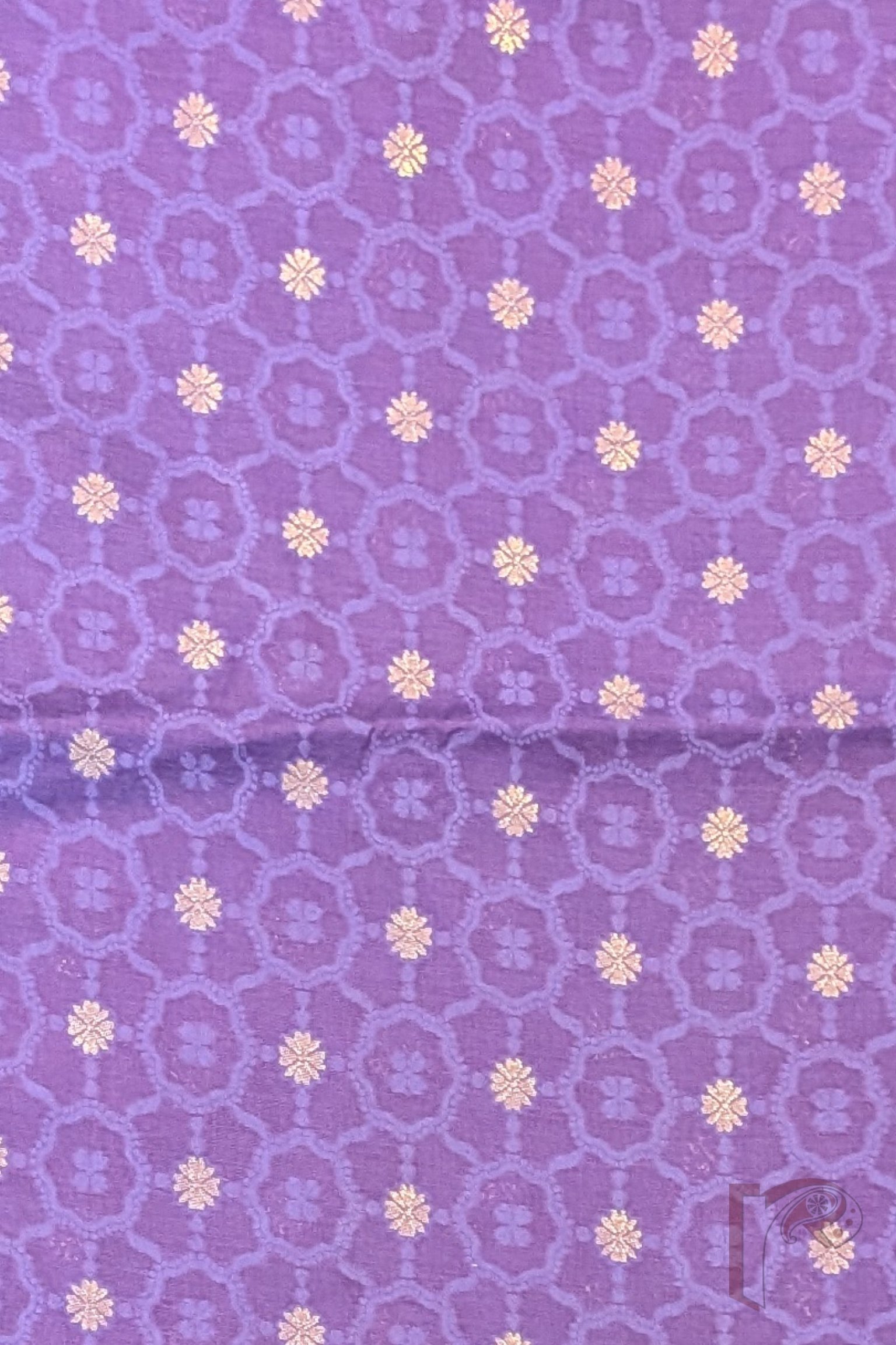 This elegant purple Banarasi cotton silk suit highlights a beautifully detailed honeycomb-like self weave interspersed with fine gold flower motifs, creating a refined and artistic kurta surface. Paired with a plain purple bottom, the set maintains a regal tone. The dupatta steals attention with its box-shaped motifs containing tiny bud-and-leaf designs woven in gold, bordered by a grand zari frame. Soft, traditional, and richly designed, this suit offers a majestic yet easy drape, perfect for timeless festive wear.