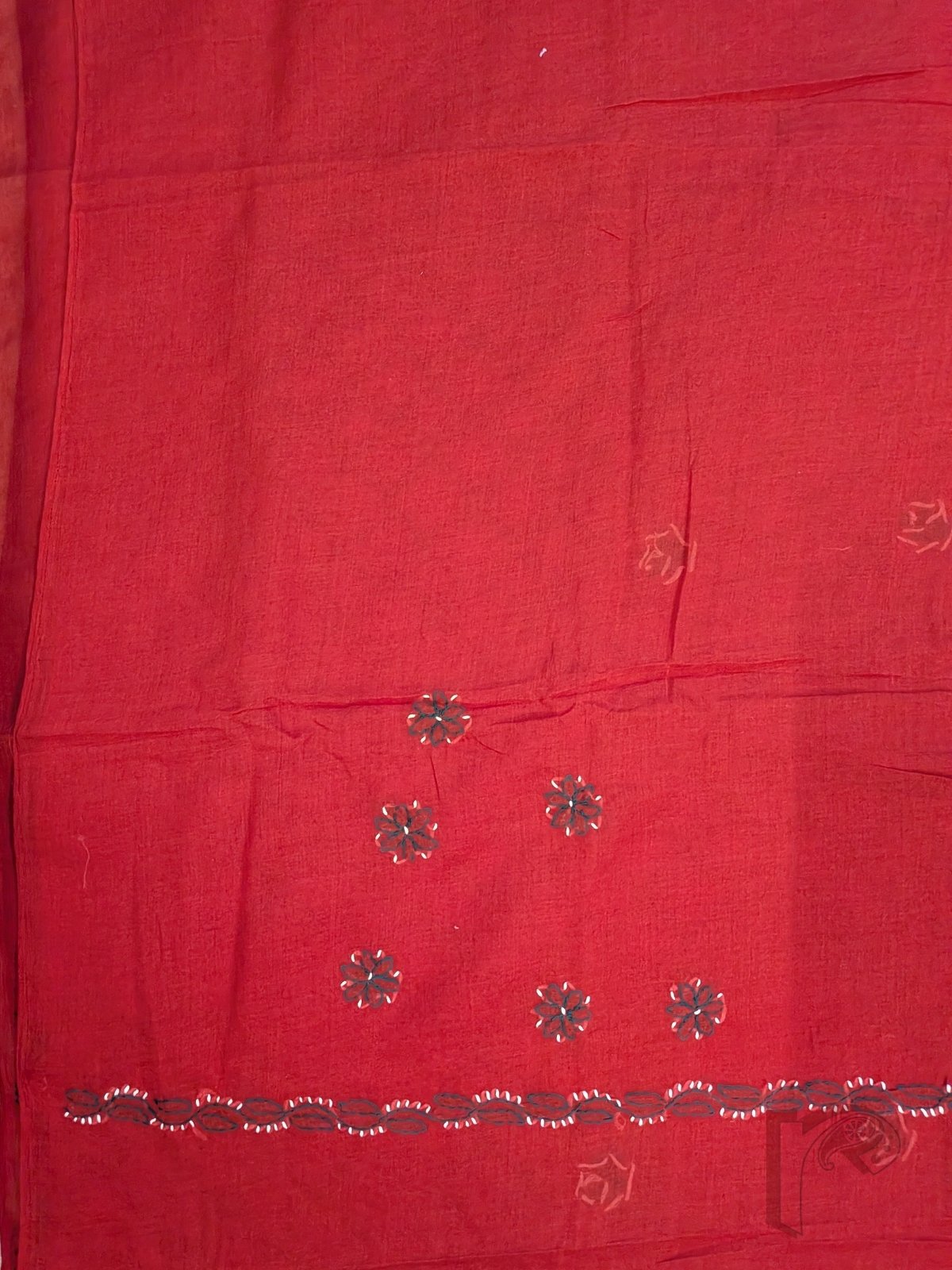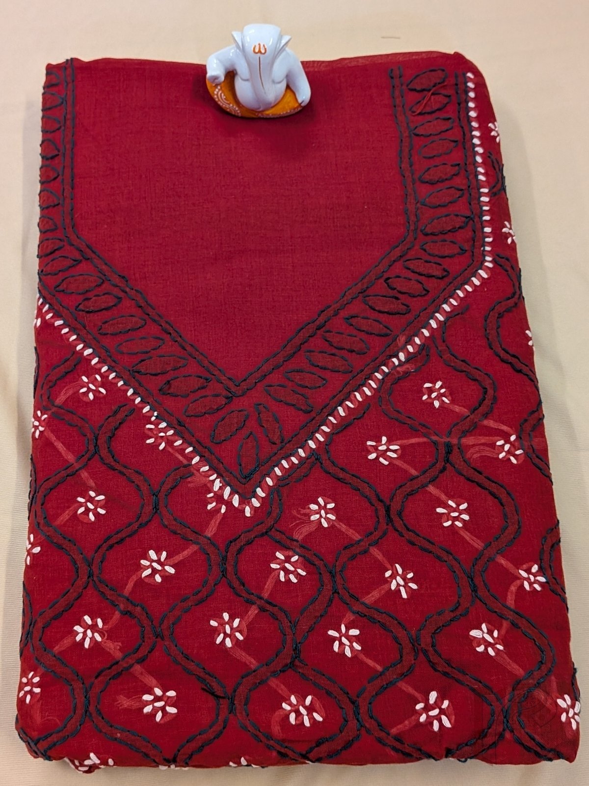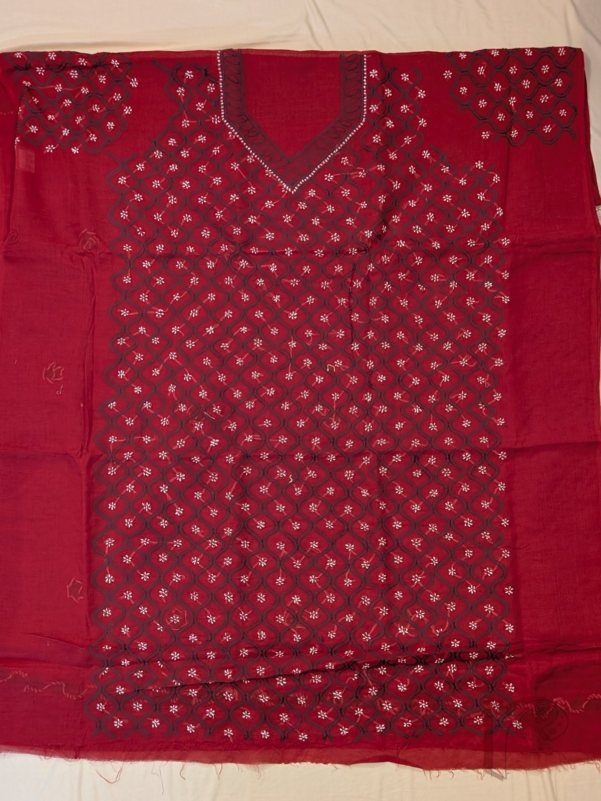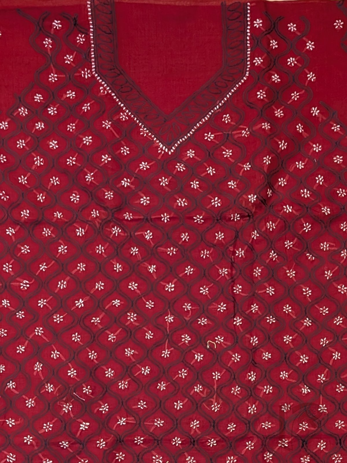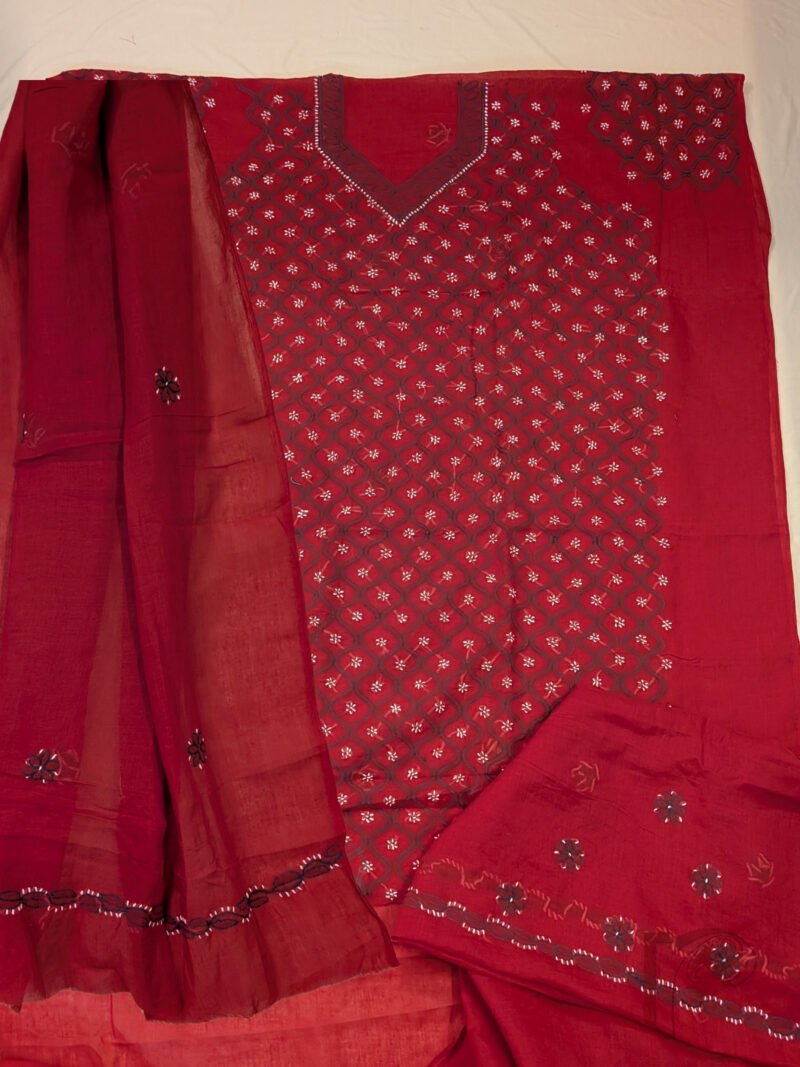 Suit Stories – Red Cotton Lucknowi Chikankari Jal Embroidered Unstitched Suit with Olive Green and White Wavy Line Floral Work and Cotton Dupatta
