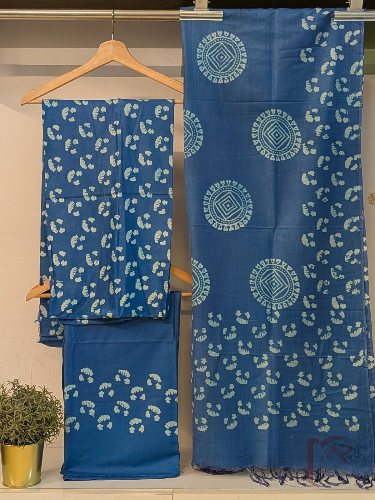 What truly sets this collection apart is the intricate handblock printing technique, where skilled artisans meticulously imprint delicate motifs using hand-carved wooden blocks. From floral patterns to nature-inspired elements, every design tells a story of artistry and patience. The harmonious play of soft offwhite motifs against vibrant and earthy base colors enhances the overall charm, creating ensembles that are both understated and striking. The thoughtfully designed sets include a beautifully printed kurta fabric, a complementing solid pant with accent block prints, and a coordinated dupatta, making them perfect for effortless styling.