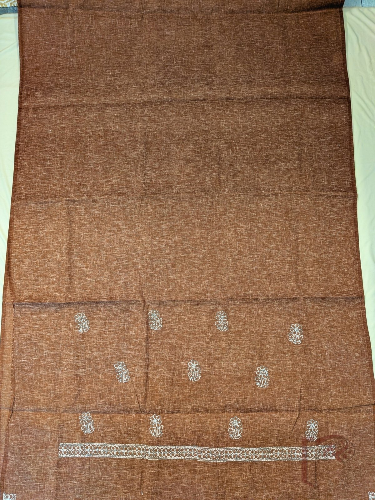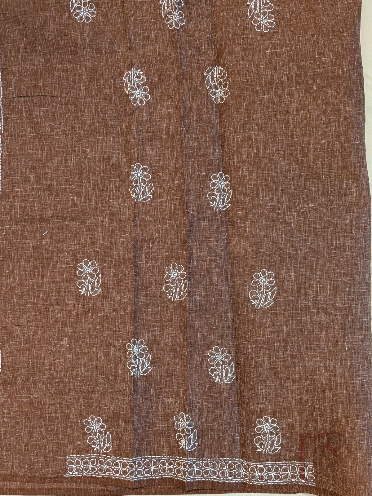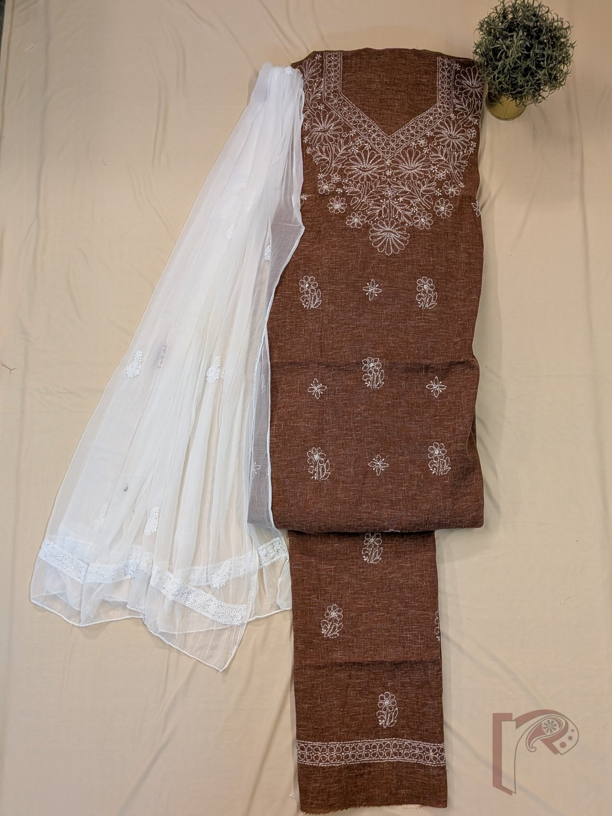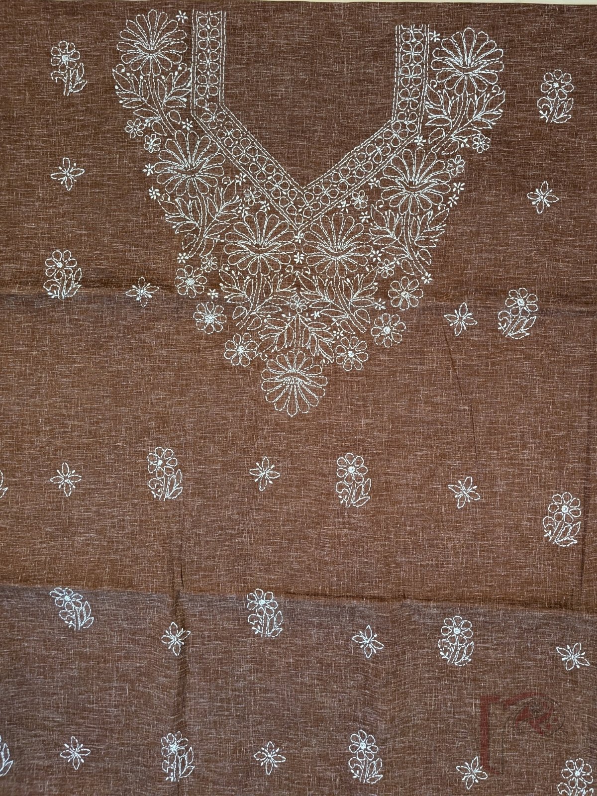 Suit Stories – Shaded Brown Khadi Cotton Lucknowi Chikan Embroidered Unstitched Suit with White Chiffon Dupatta and White Floral Thread Work