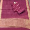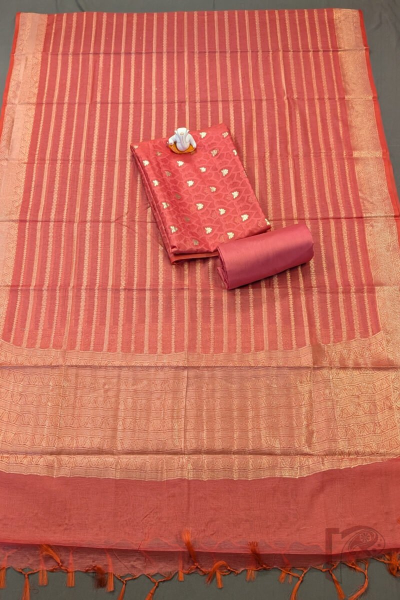 This pretty tomato pink cotton silk Banarasi suit material exudes understated elegance with its kurta piece featuring self-colour thread weave enhanced with delicate gold leaf motifs, adding subtle shimmer and intricate texture. The plain tomato pink cotton silk bottom perfectly complements the kurta, creating a harmonious and refined ensemble. The dupatta elevates the look with its matching tomato pink fabric adorned with parallel geometric gold lines and broad gold borders on both sides, blending traditional Banarasi craftsmanship with graceful festive appeal. Made from smooth, lightweight cotton silk with authentic Banarasi weaving, this suit material offers a luxurious drape, comfortable wear, and timeless elegance, ideal for daytime celebrations, festive occasions, and elegant traditional gatherings.