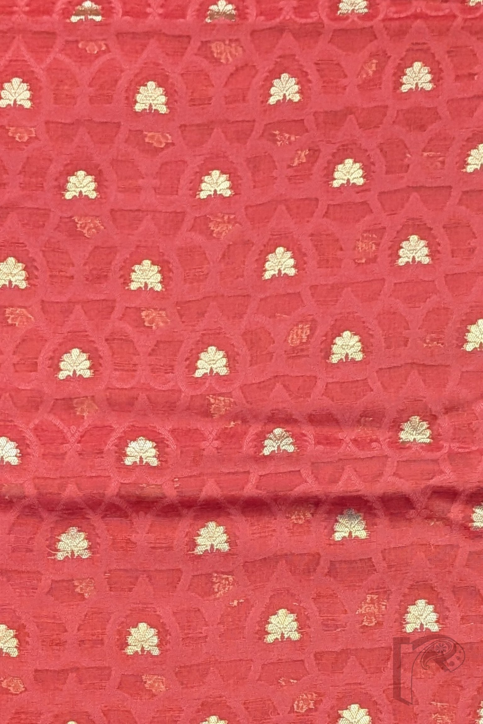 Suit Stories – Tomato Pink Cotton Silk Banarasi Suit Material with Gold Leaf Motifs & Geometric Gold Line Dupatta