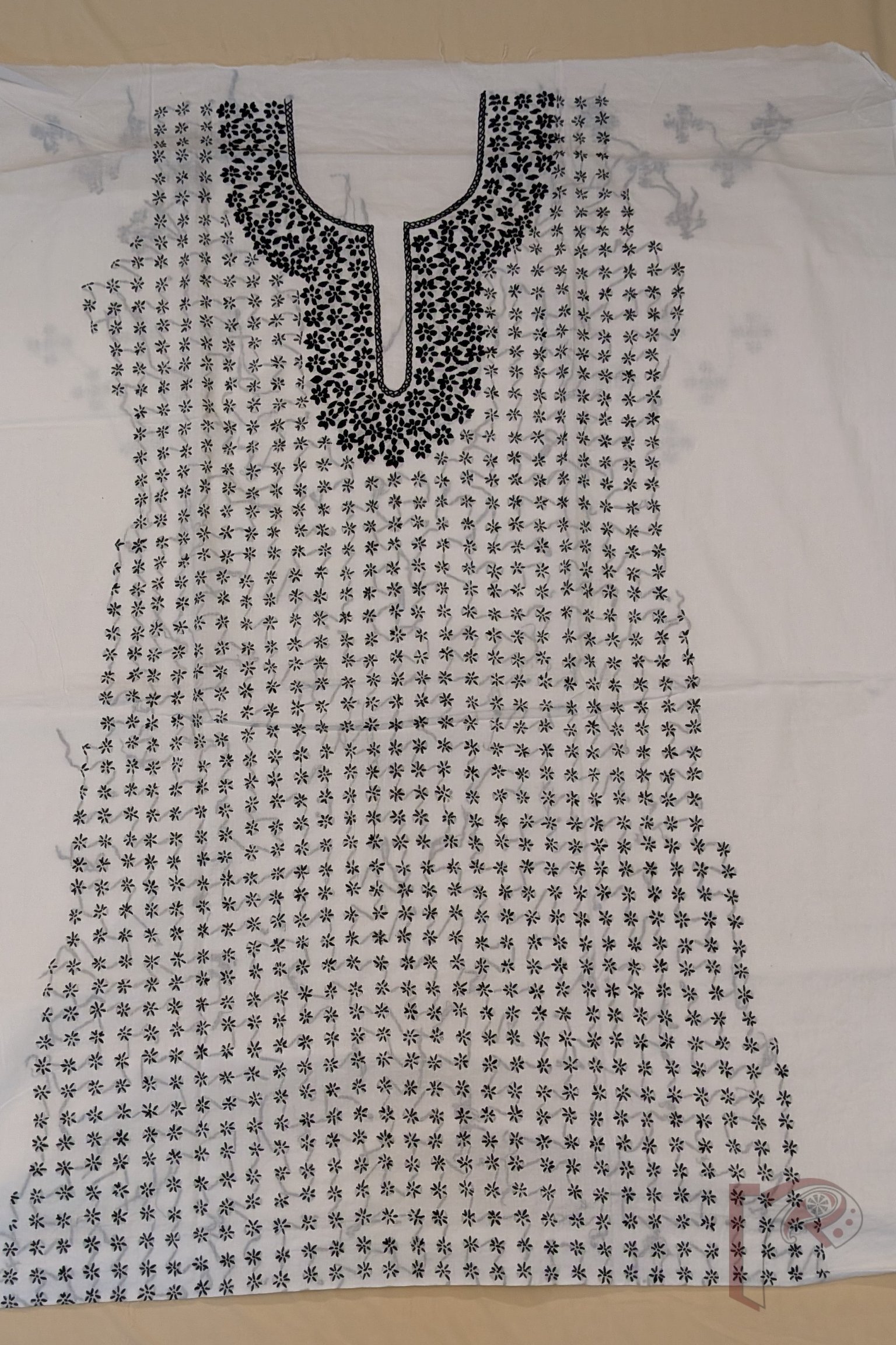 Suit stories – White Cotton Kantha Embroidered Stick Flower Pattern Suit Set with Black Thread Work and Voile Dupatta
