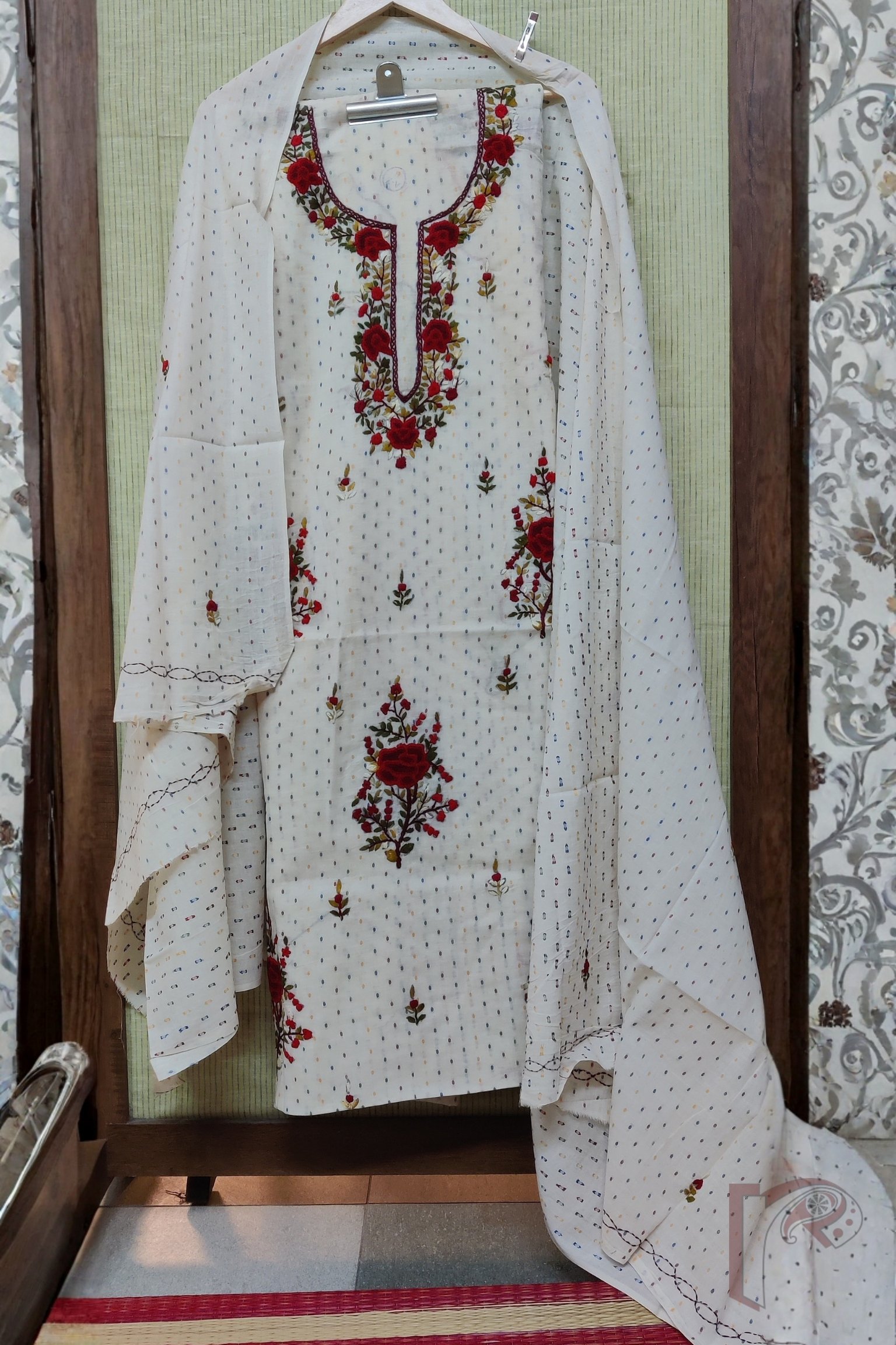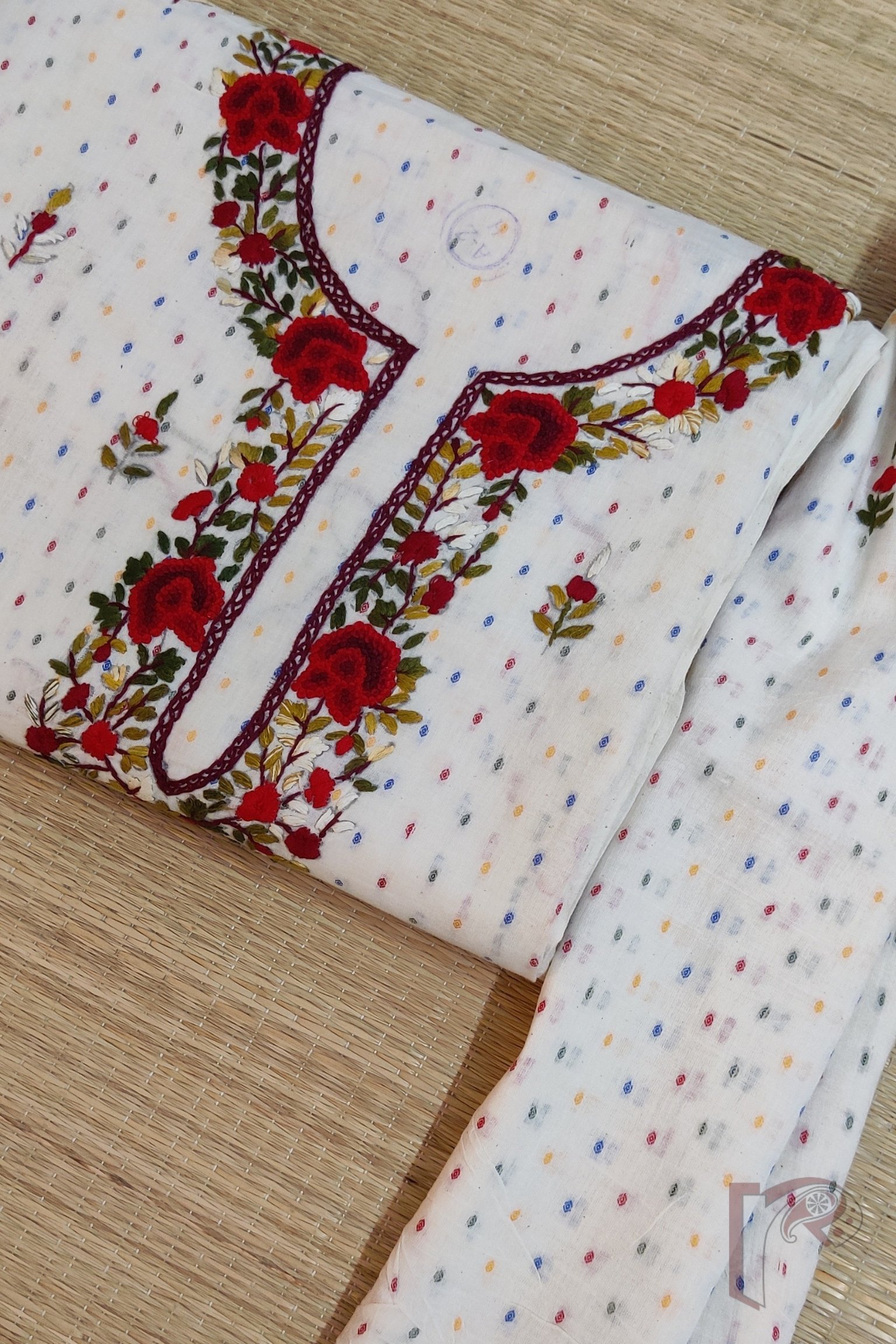 Suit stories – White Cotton Multicolor Booti Fabric Suit Set with Red Green White Floral French Knot Embroidery