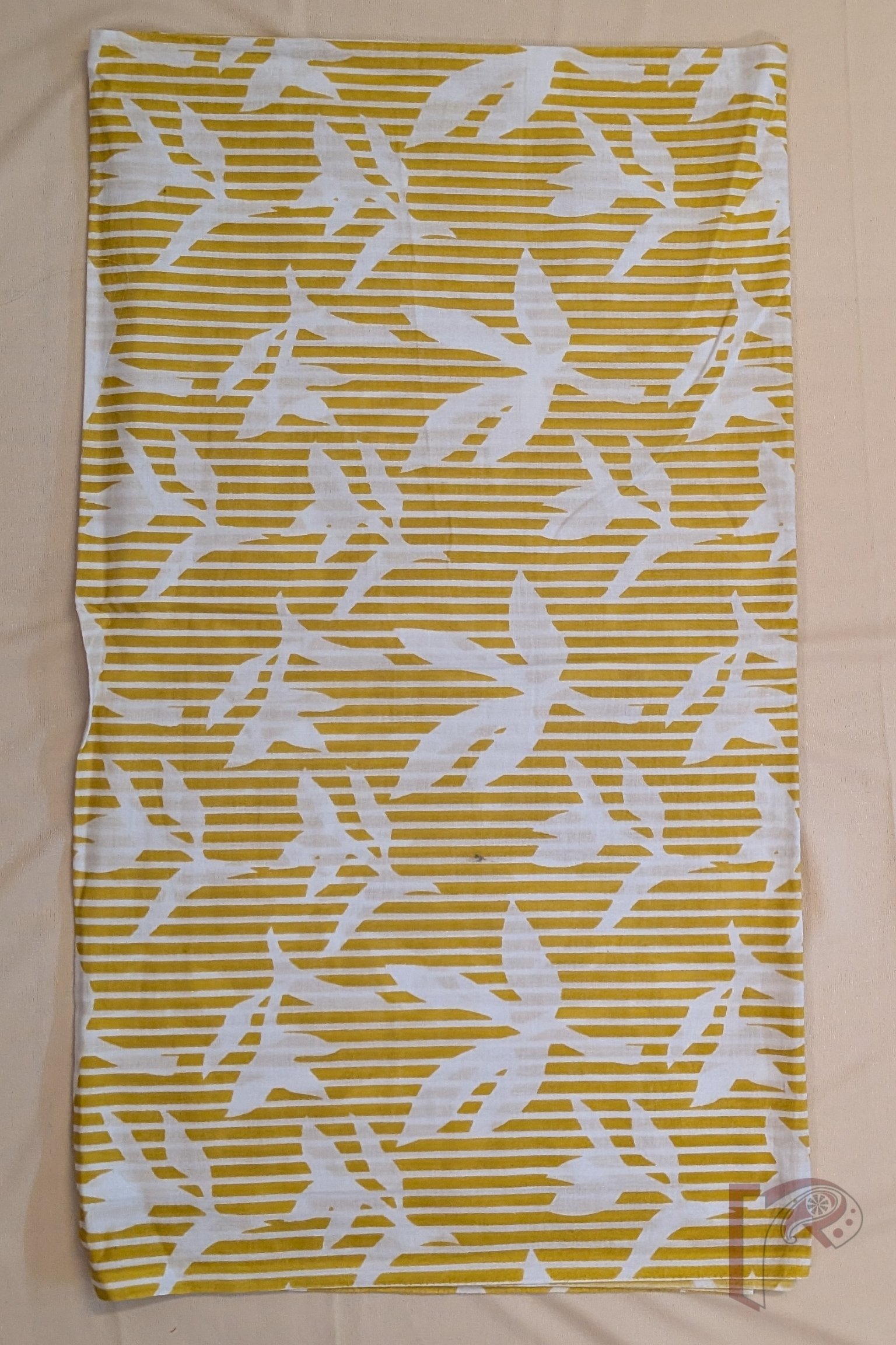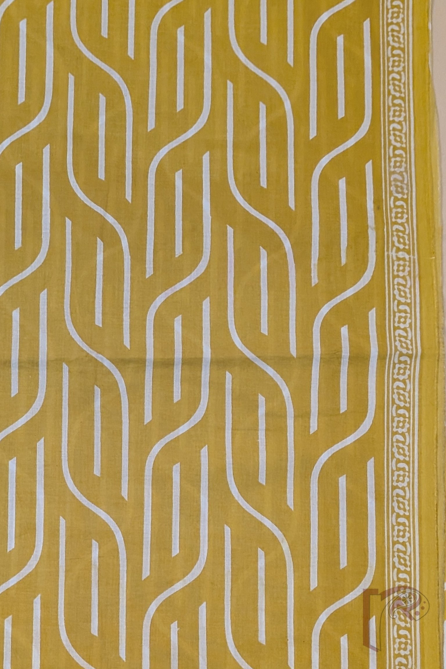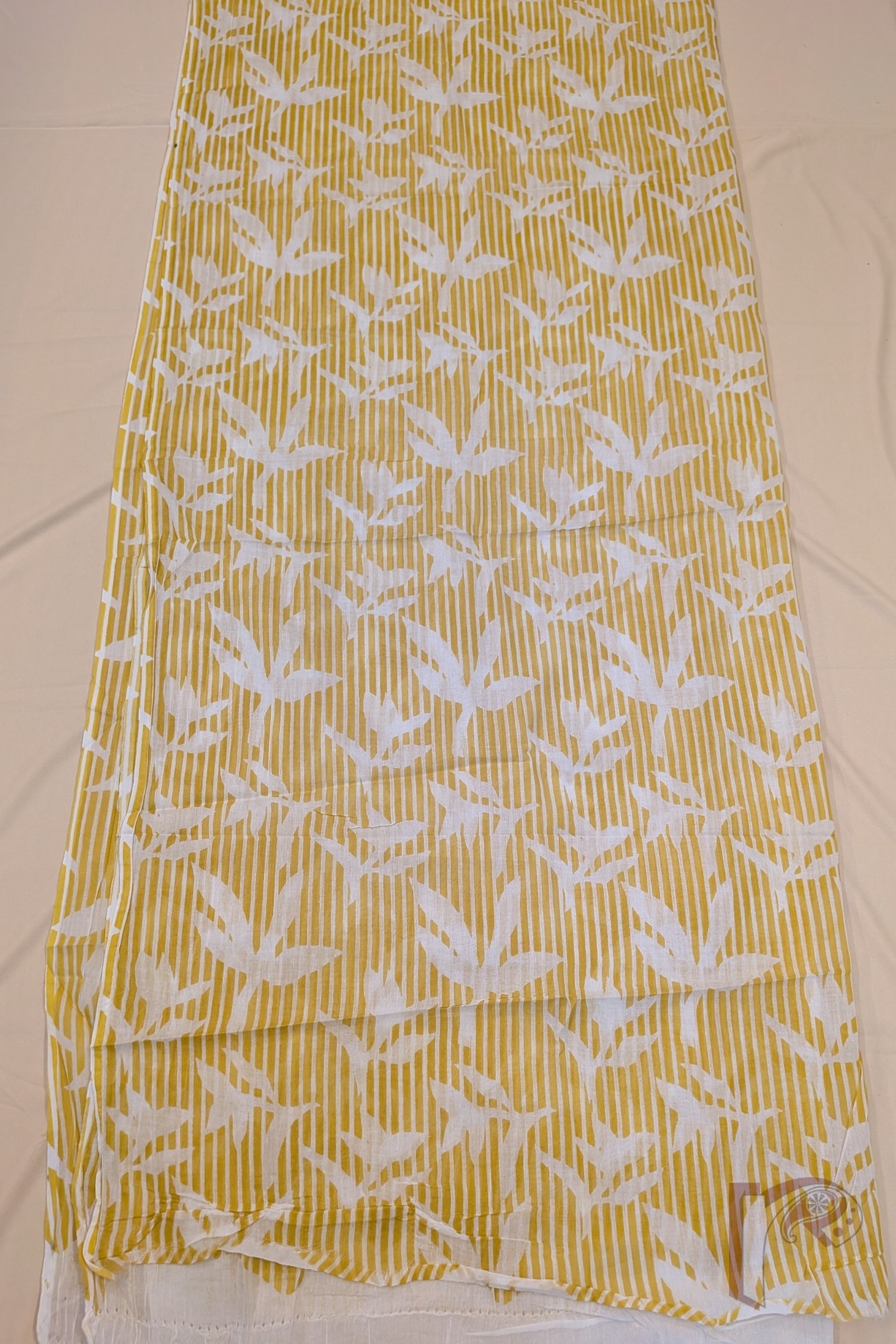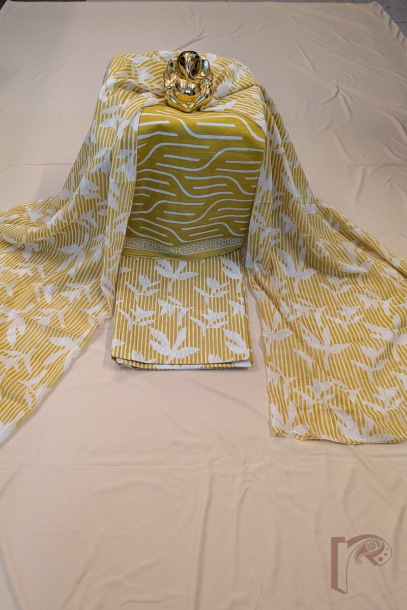 This cheerful yellow and offwhite mulmul cotton suit stands out with its kurta featuring abstract linear prints and a subtle 1-inch border, adding a modern touch to traditional handblock art. The bottom fabric combines thin stripes with free-flowing leaf bunch motifs, lending an organic and relaxed feel. Paired with a matching dupatta, this suit offers breathable comfort, visual balance, and effortless everyday elegance.