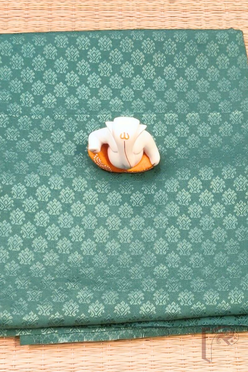 This serene teal green blouse piece features self-colored artistic motifs created through silk thread machine weaving. It exudes subtlety and depth, making it an elegant choice for refined draping.