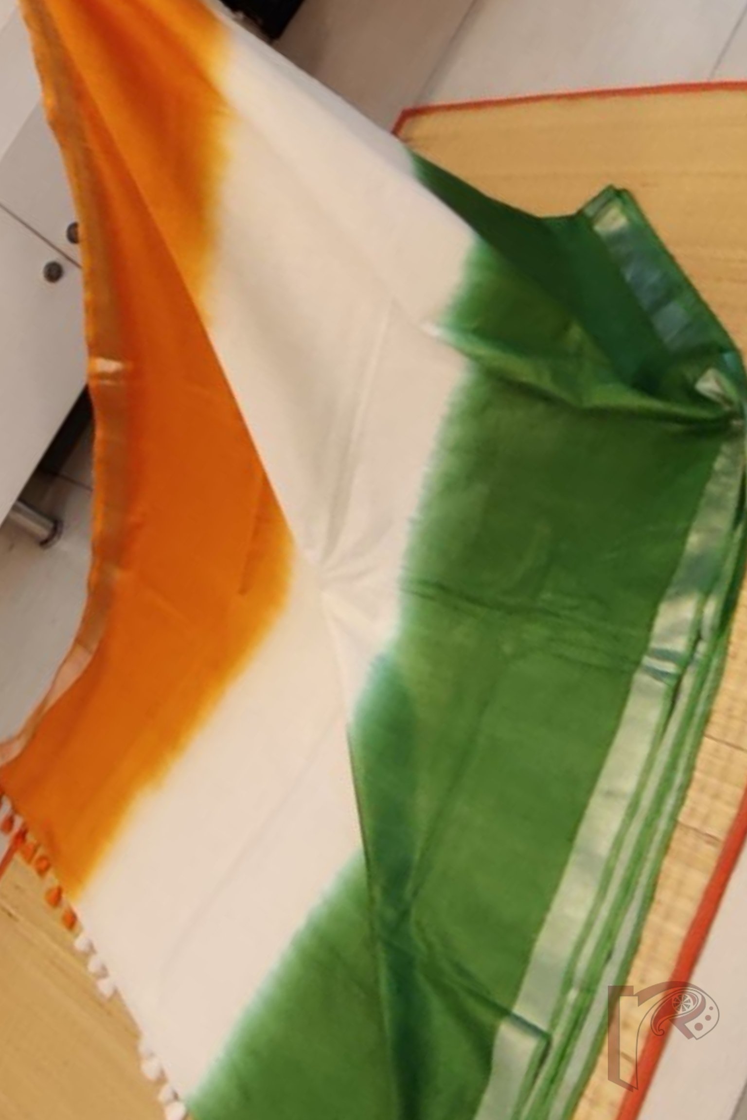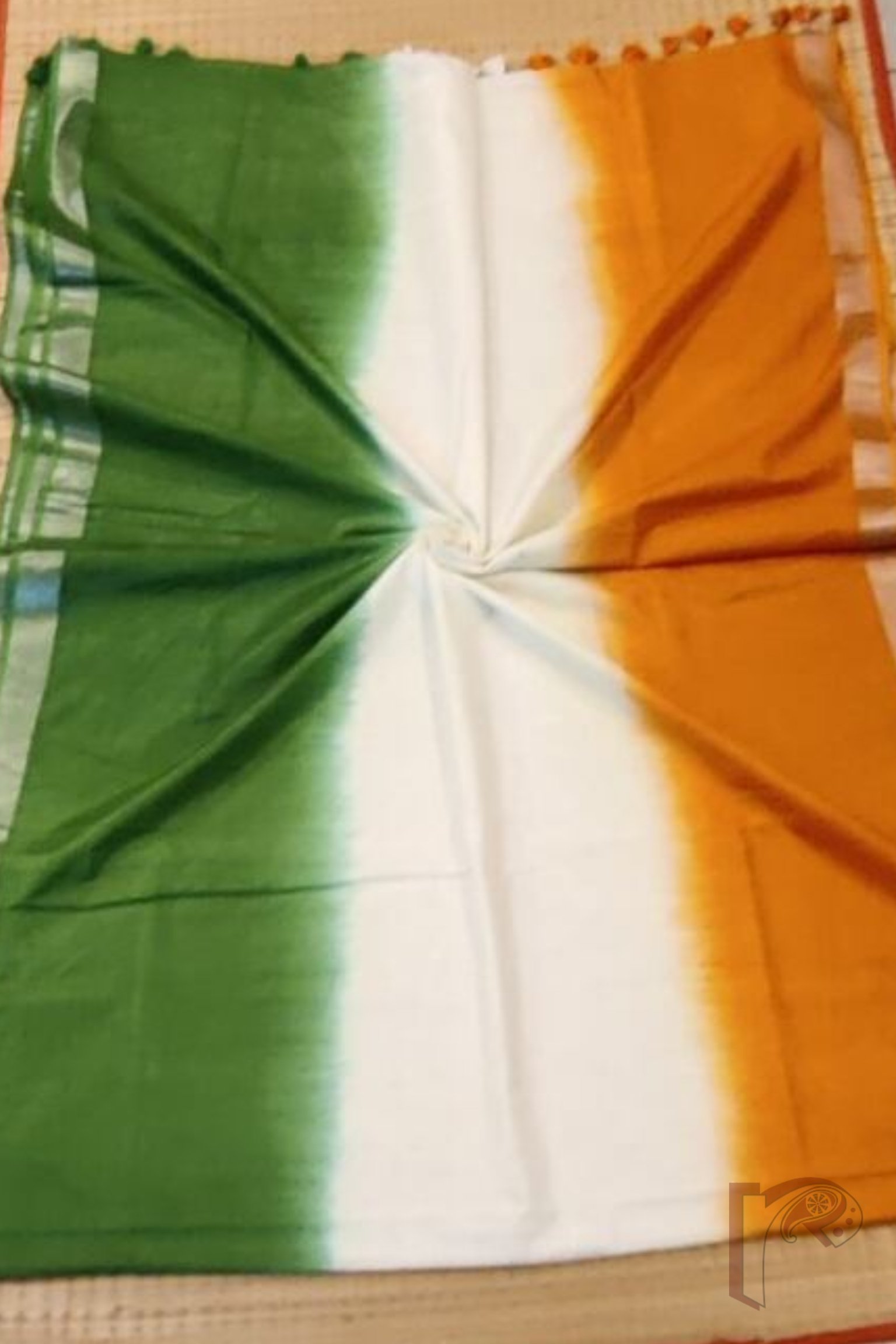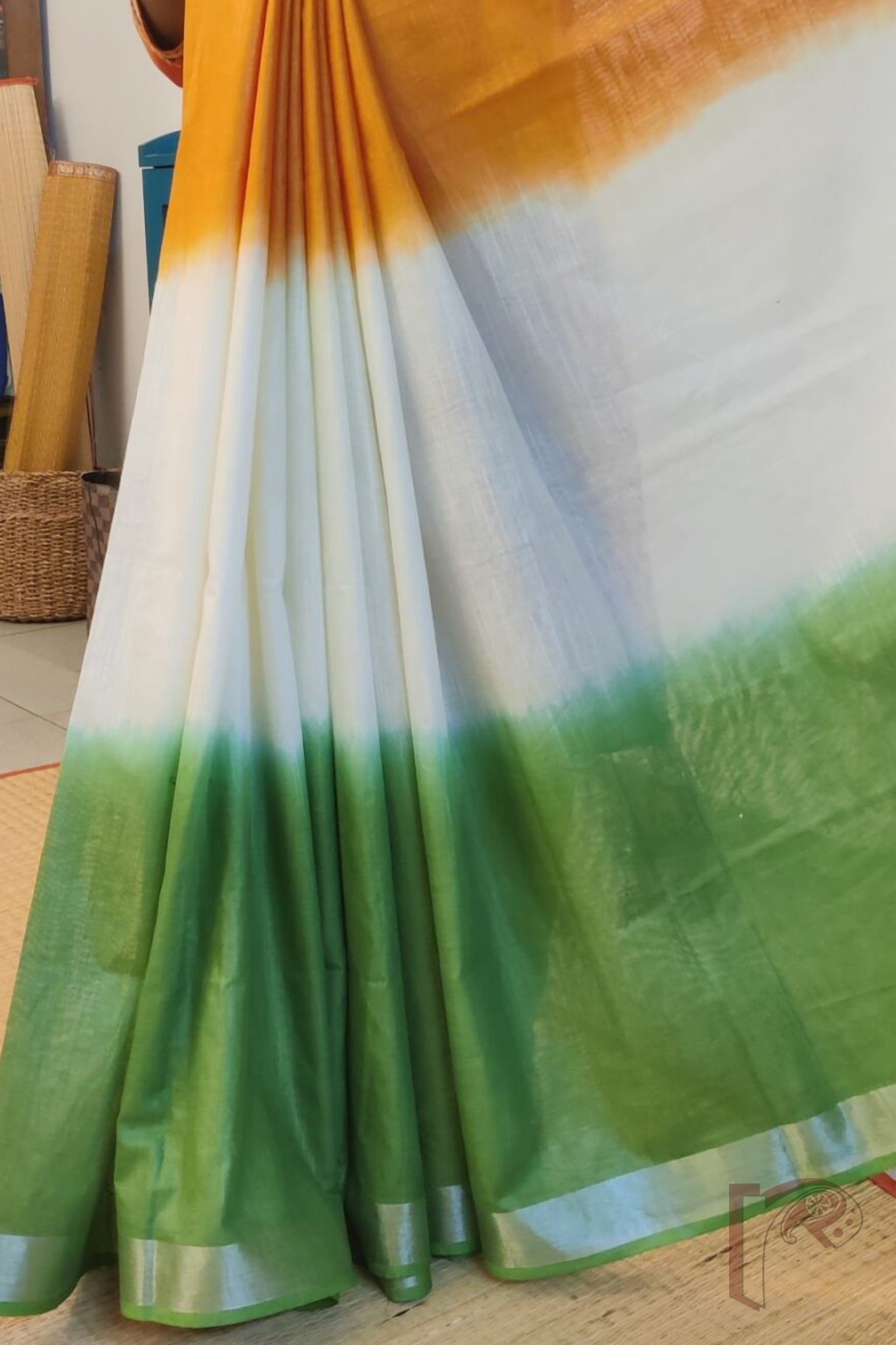 Tricolor Treasure – Saffron White Green Tricolor Cotton Linen Saree with Running Blouse Piece