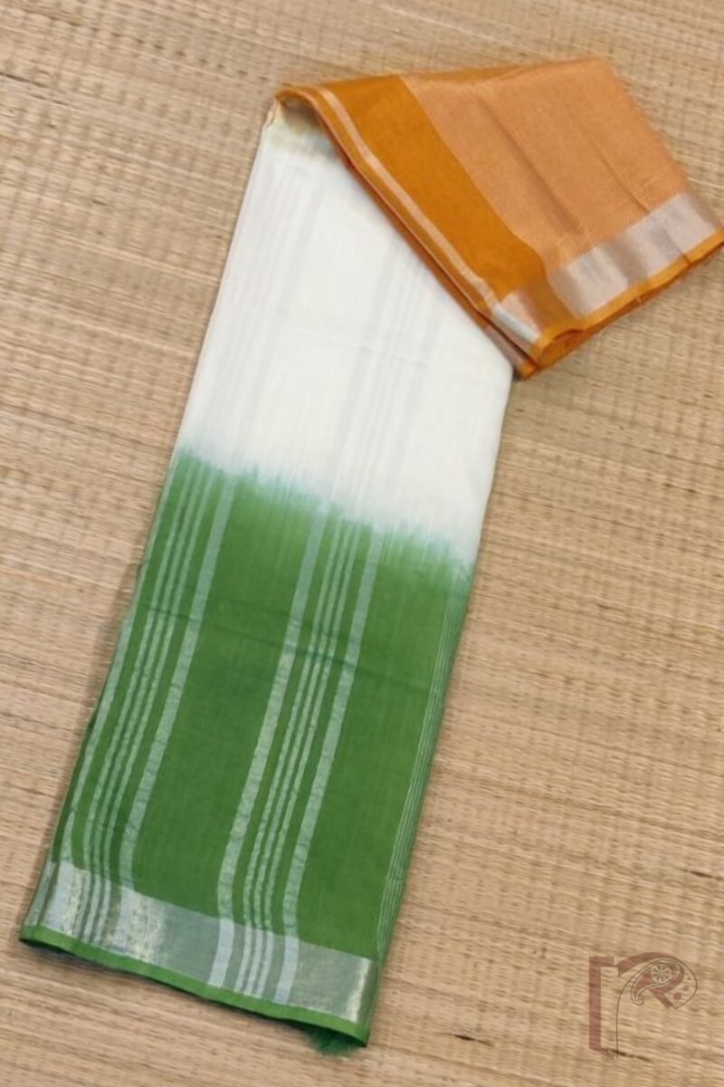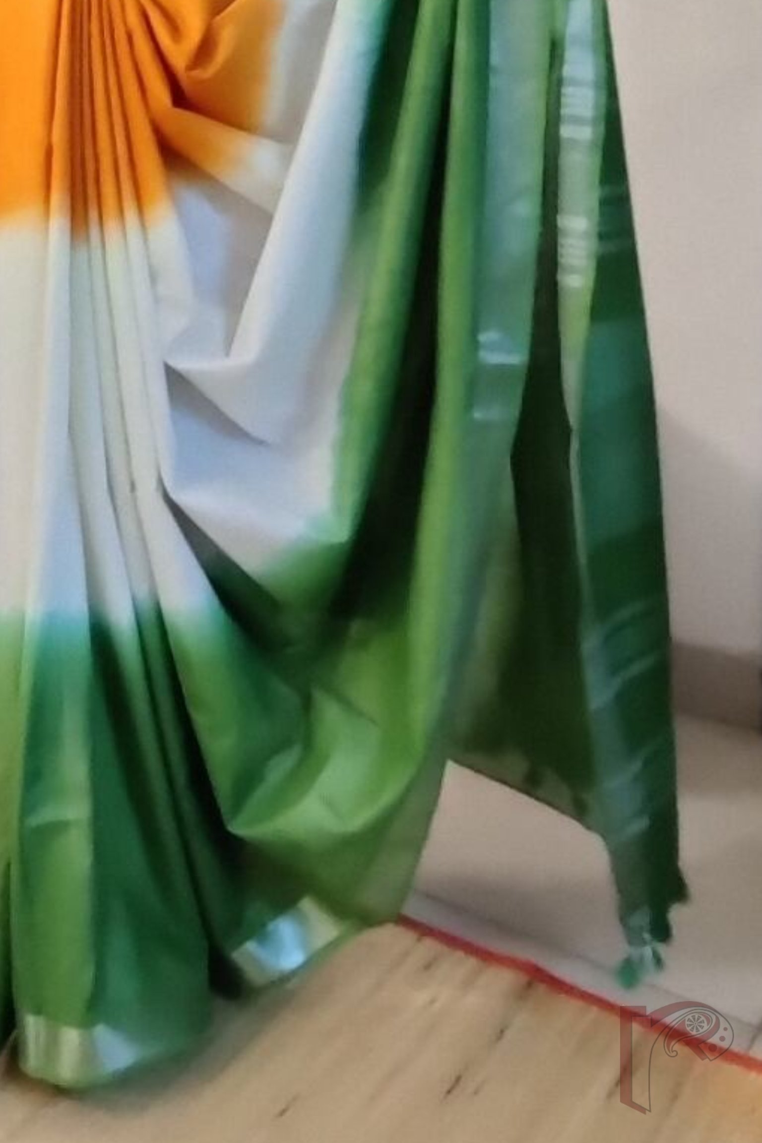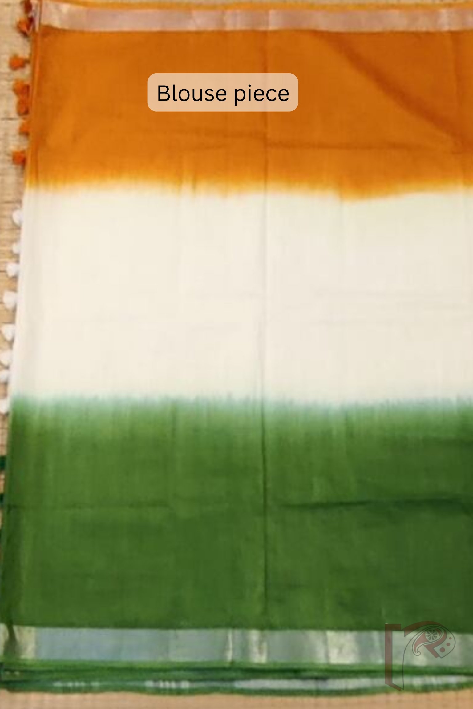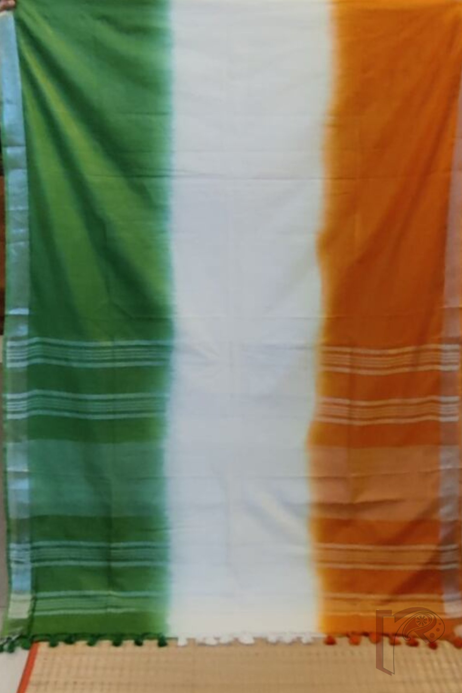Tricolor Treasure – Saffron White Green Tricolor Cotton Linen Saree with Running Blouse Piece