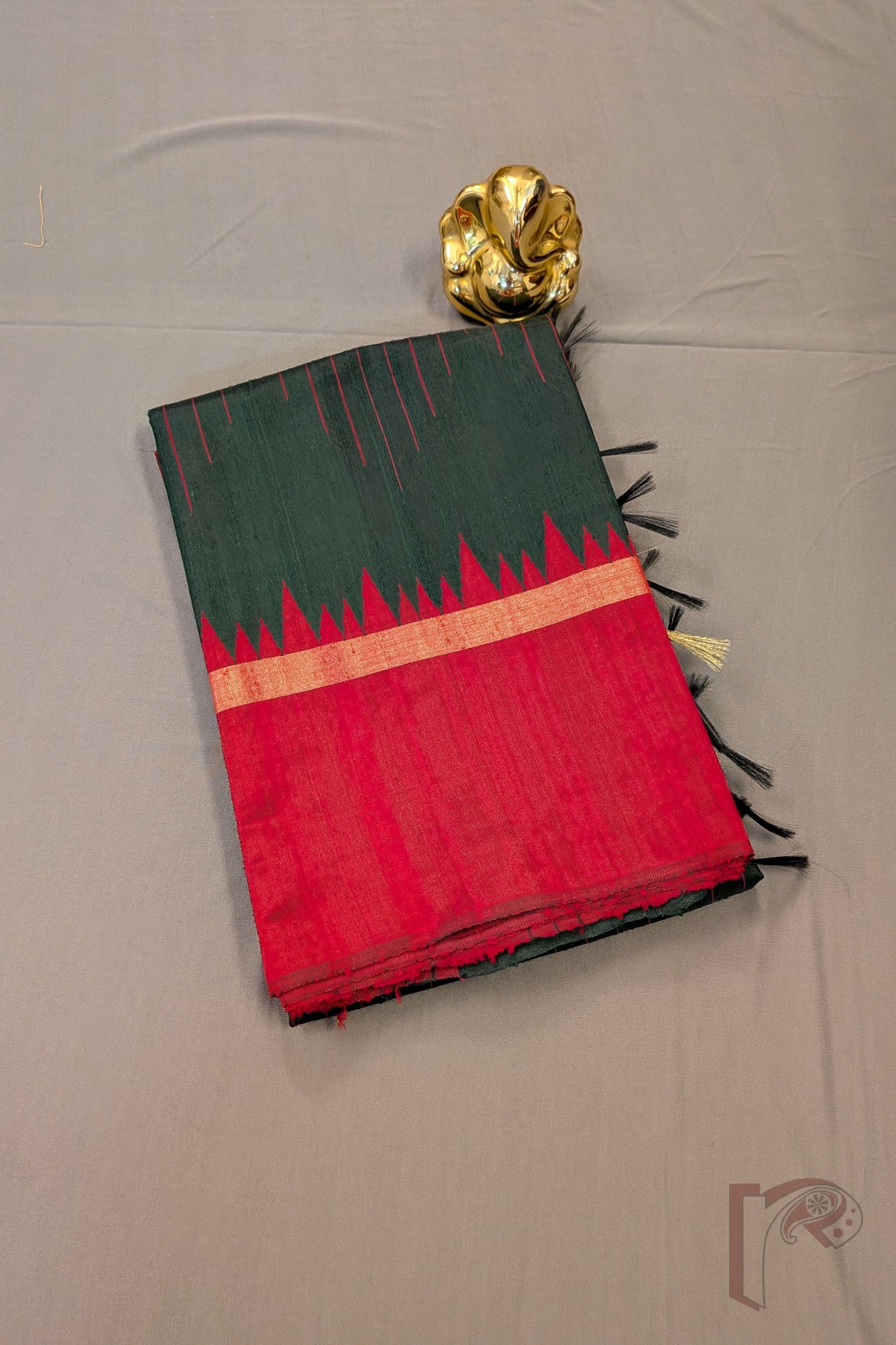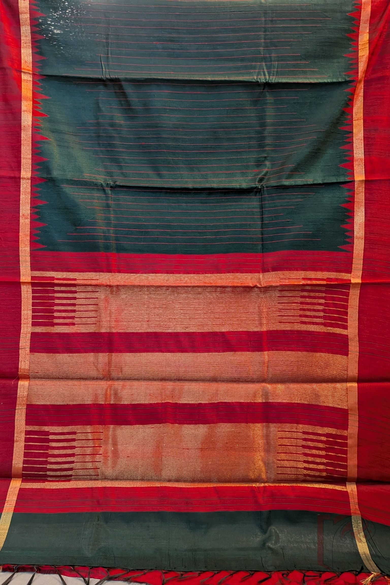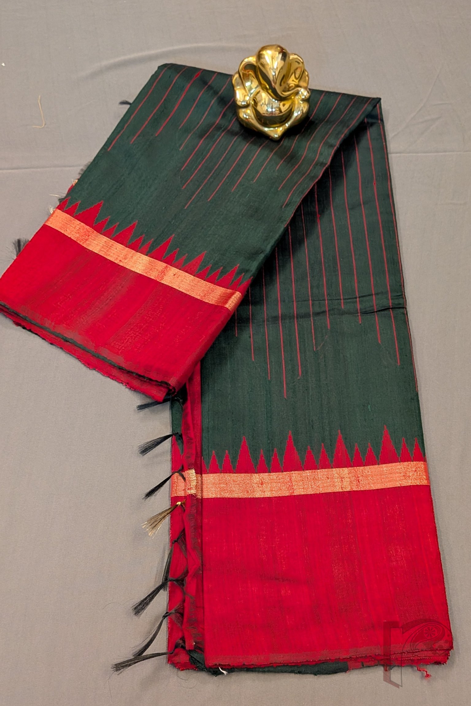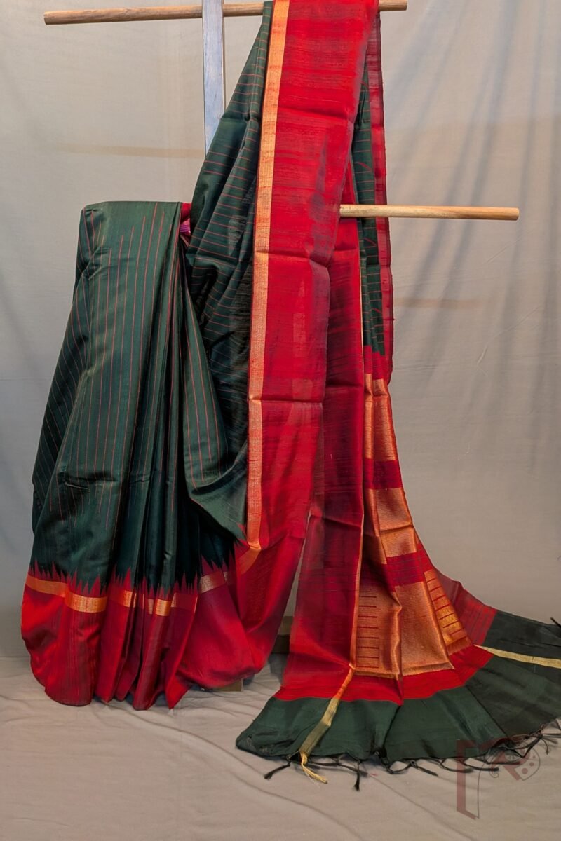This deep bottle green handwoven raw silk tussar saree exudes a regal charm accentuated by a rich maroon temple weave border that frames the drape beautifully. The body is subtly enriched with maroon thread-woven stripes, adding texture and depth to the silk without overpowering its elegance. A delicate 1″ gold zari border runs throughout the saree, lending a refined festive touch. The pallu mirrors the maroon border and is elevated with heavy gold thread weaving, creating a graceful shimmer as you move. Paired with a plain maroon blouse, this saree is ideal for temple ceremonies, weddings, and traditional celebrations.
