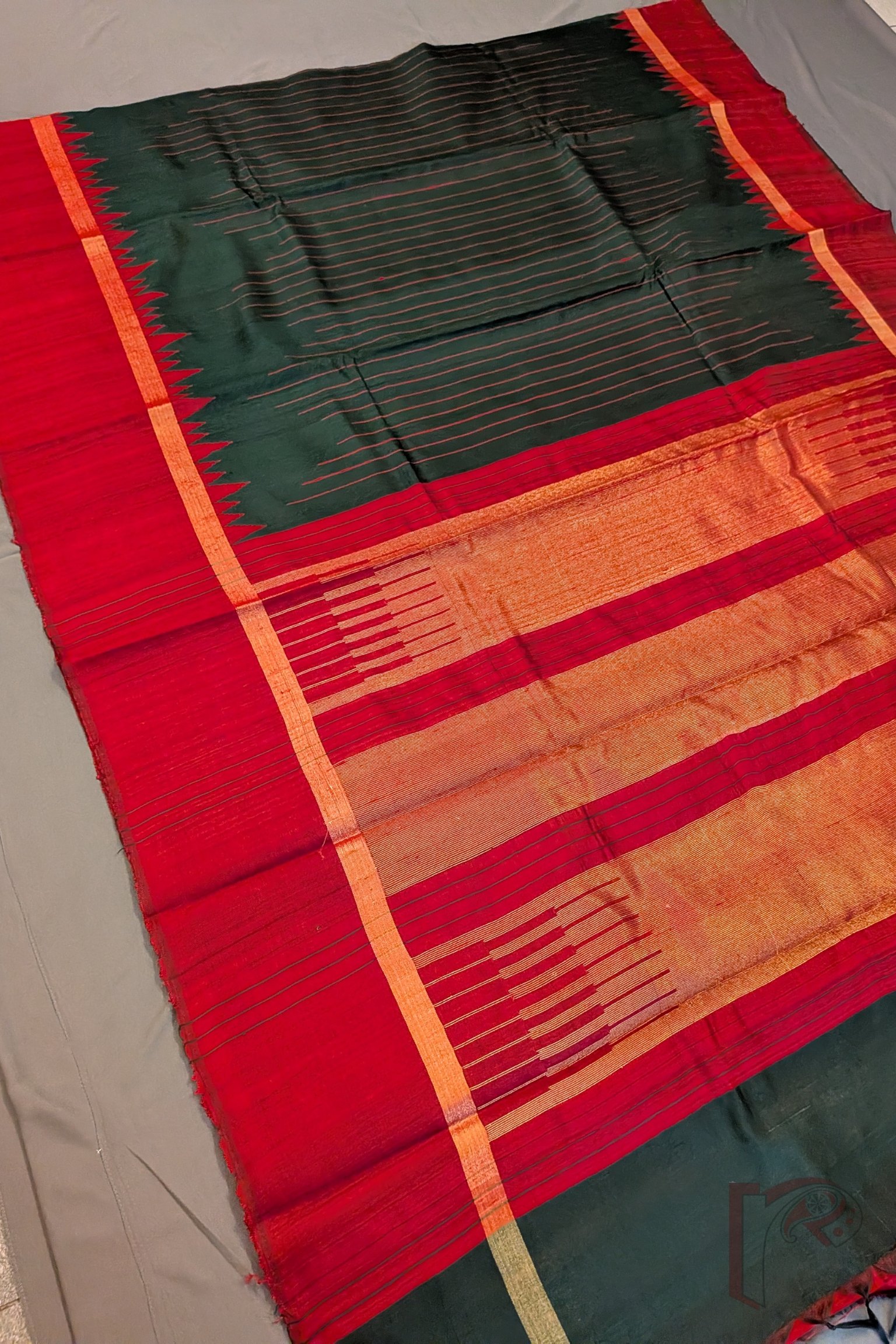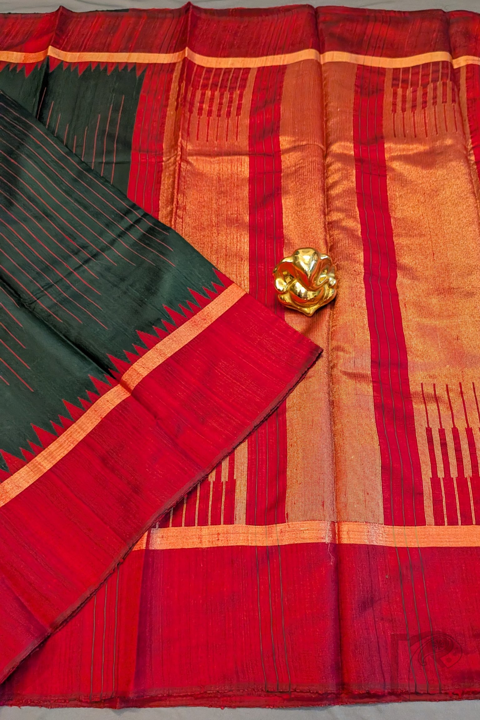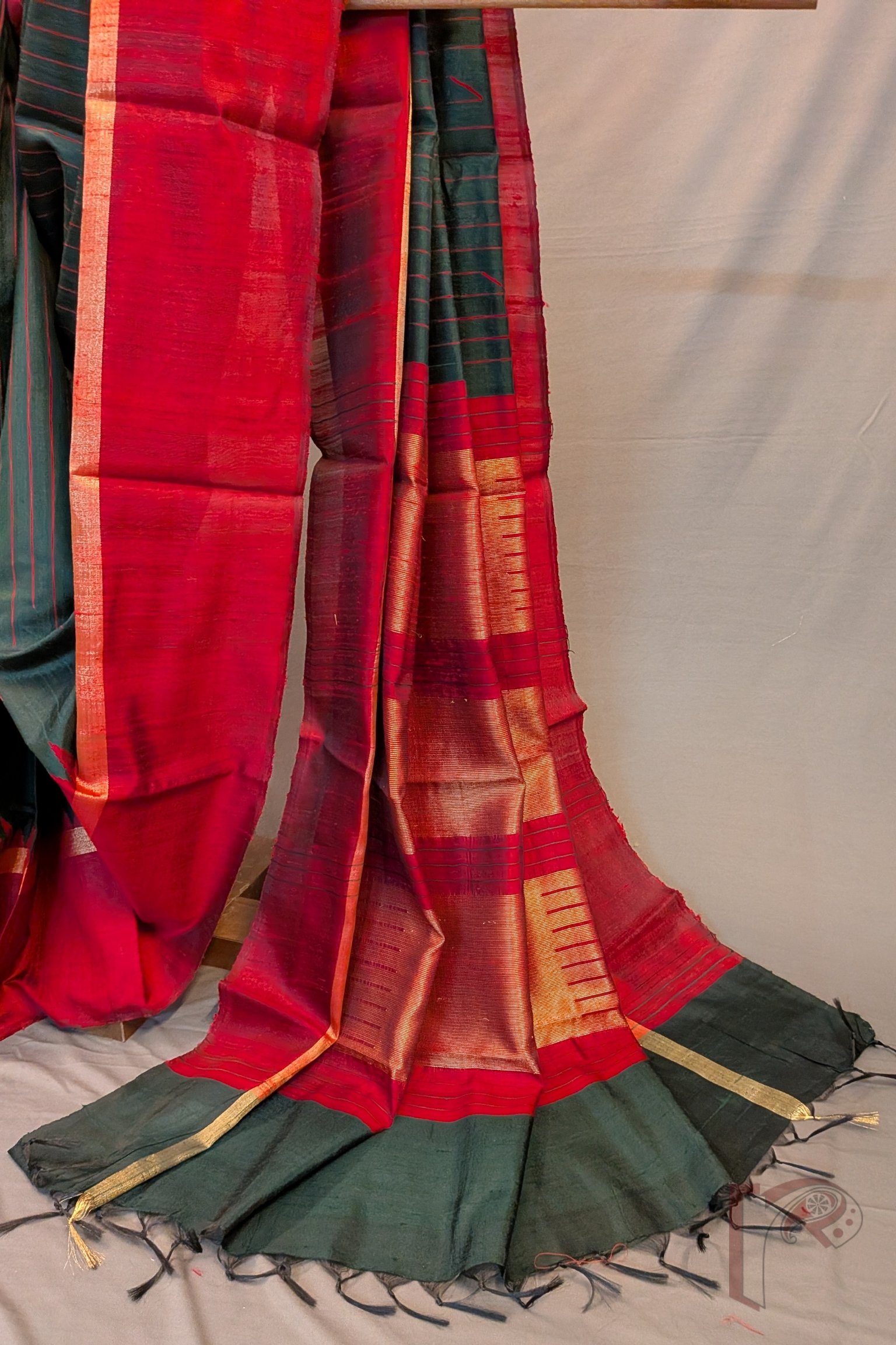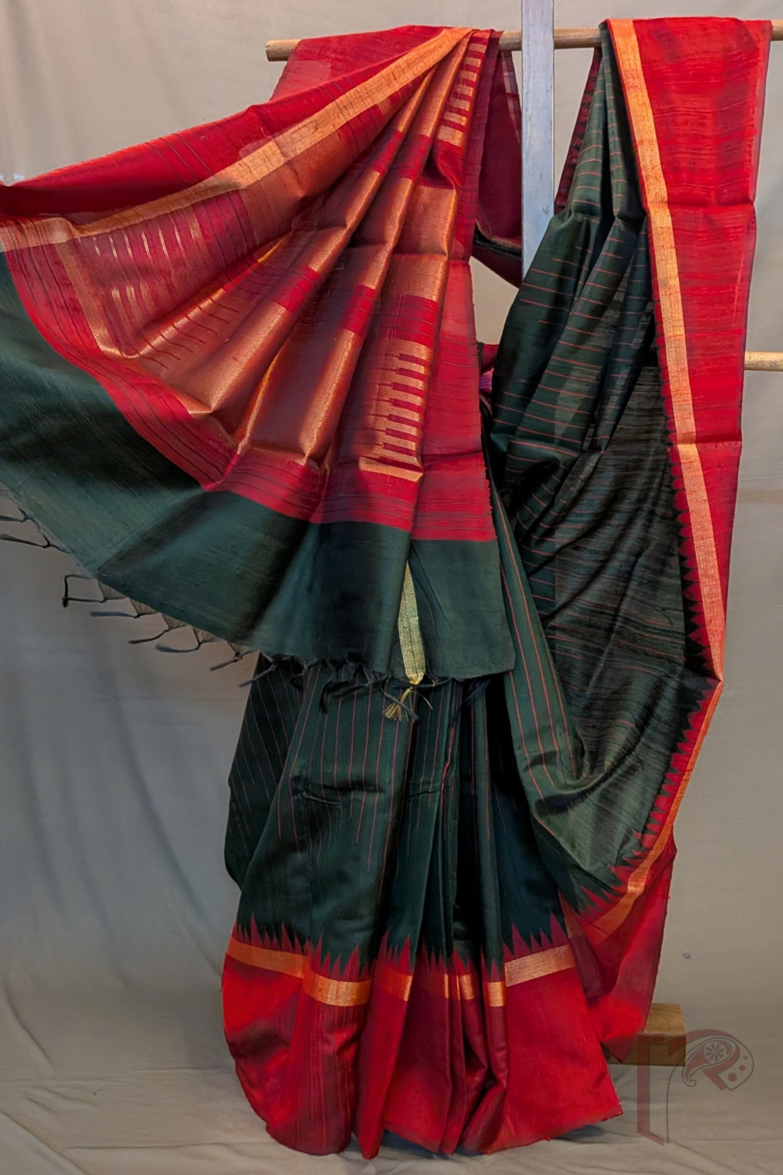 Tussar Tales – Bottle Green Raw Silk Tussar Saree with Maroon Temple Border and Gold Zari Pallu