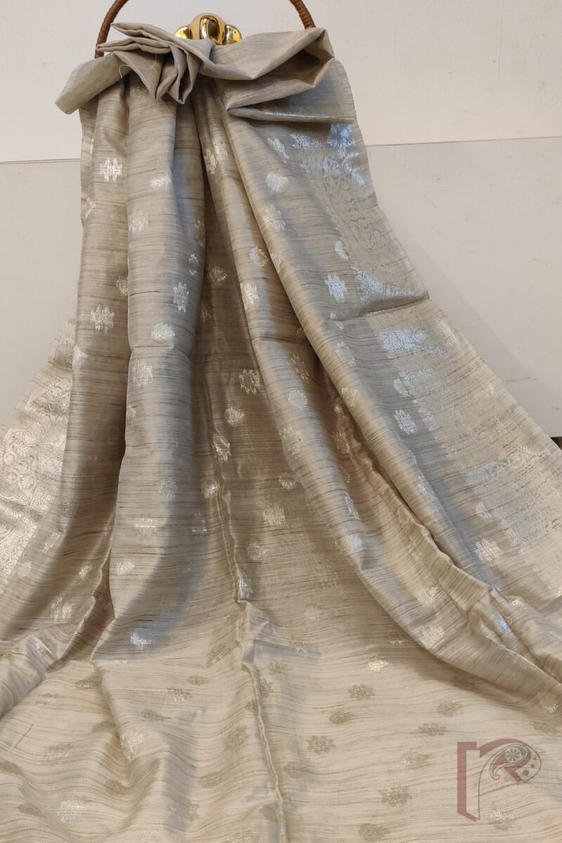 Tussar Tales – Cream Beige Semi Munga Tussar Silk Saree with Silverish Gold Jacquard Pallu and Woven Motifs