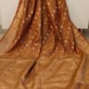 Elegant and ethereal, this cream beige semi munga tussar silk saree radiates timeless charm. The body is adorned with small woven motifs in silverish gold thread, while the fully jacquard pallu glows with intricate patterns in the same tone, creating a seamless flow of texture and light. The soft tussar silk lends a luxurious feel, making it both comfortable and graceful to drape. Its matching blouse, with fine motifs and delicate gold pinstripes, completes the look with quiet sophistication. Perfect for daytime elegance or evening celebrations, this saree captures the spirit of subtle festivity.