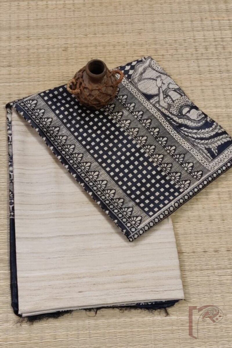 Tussar Tales – Cream Desi Tussar Silk Saree with Black Madhubani Fish and Peacock Print Pallu and Solid Black Blouse