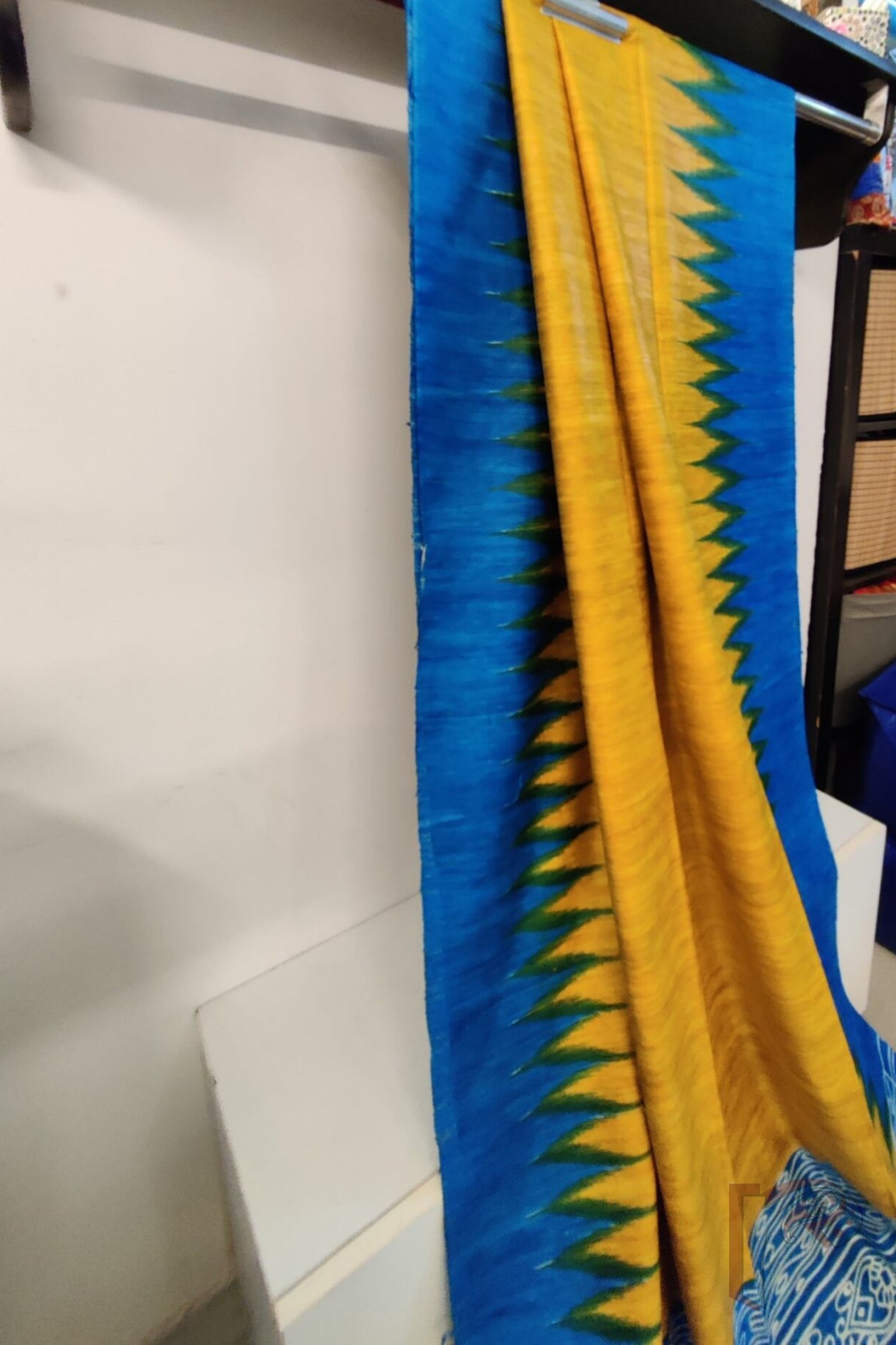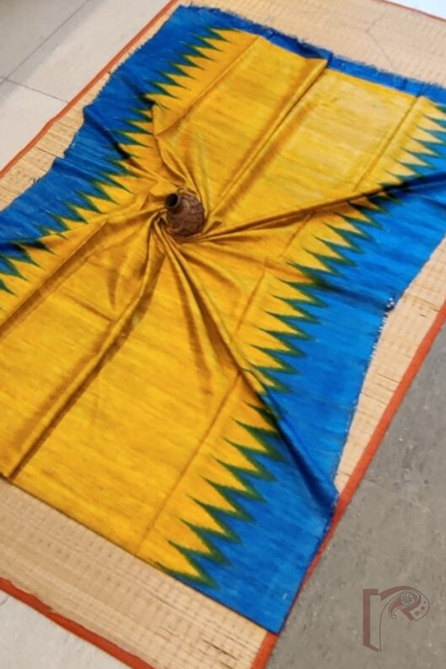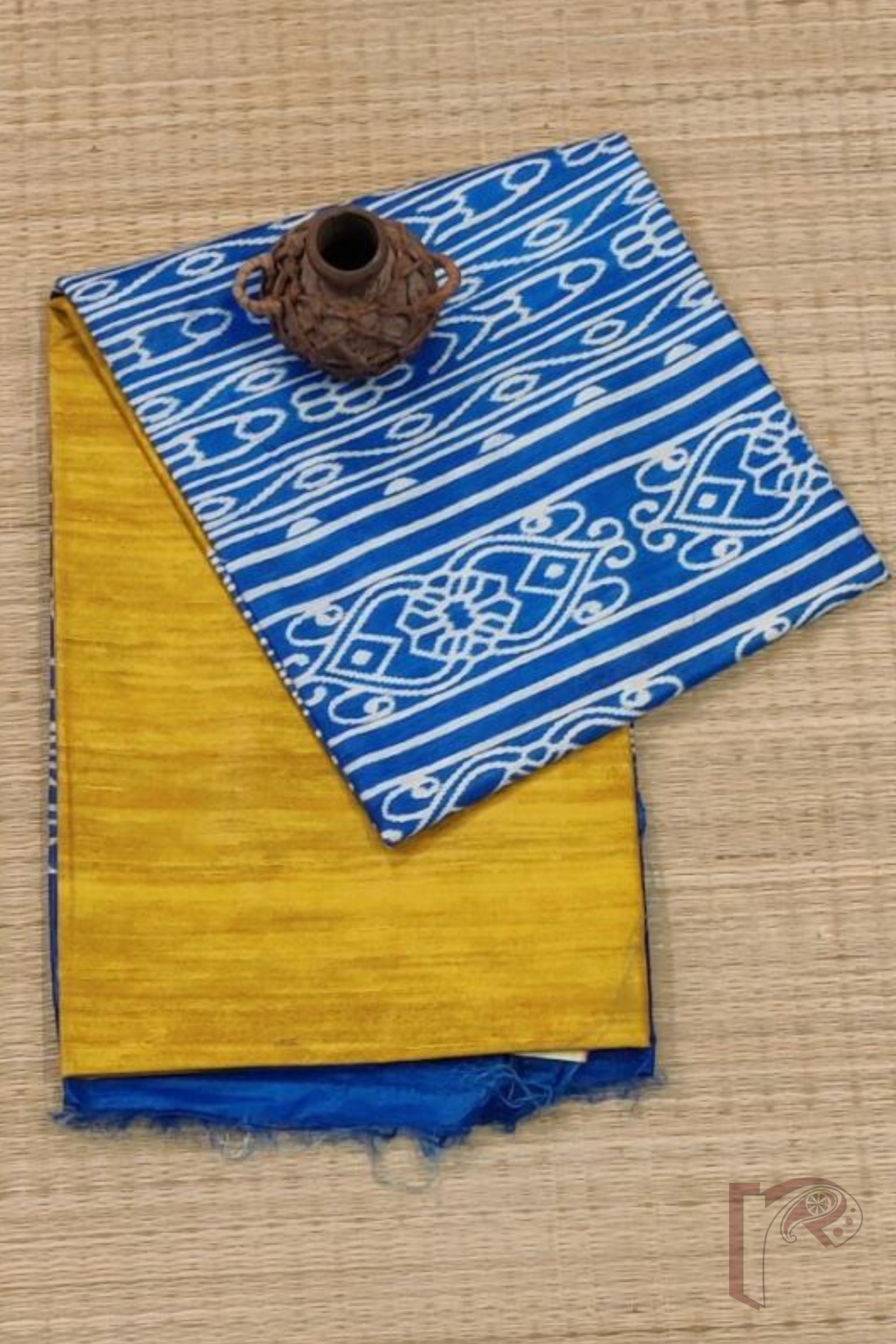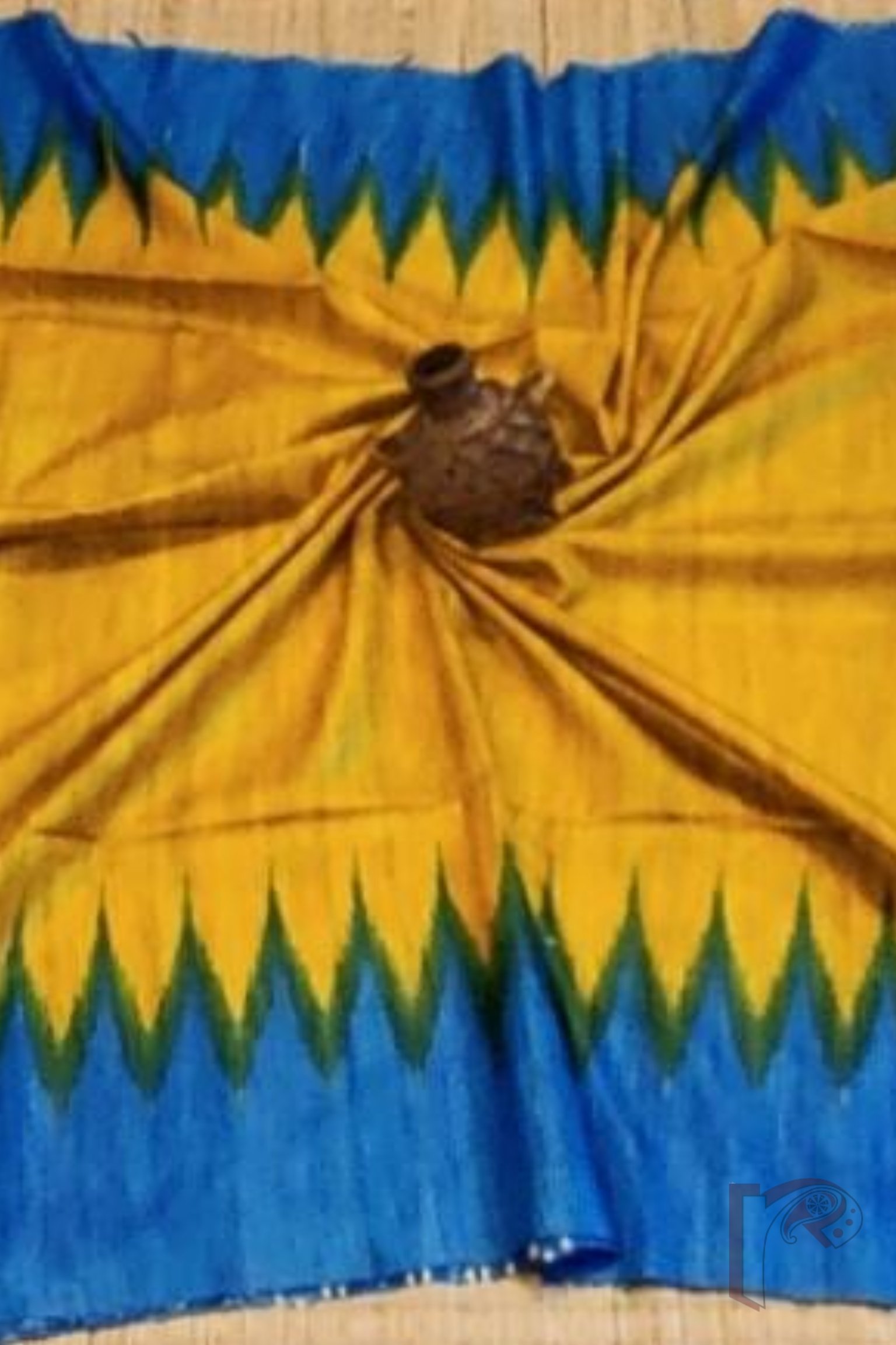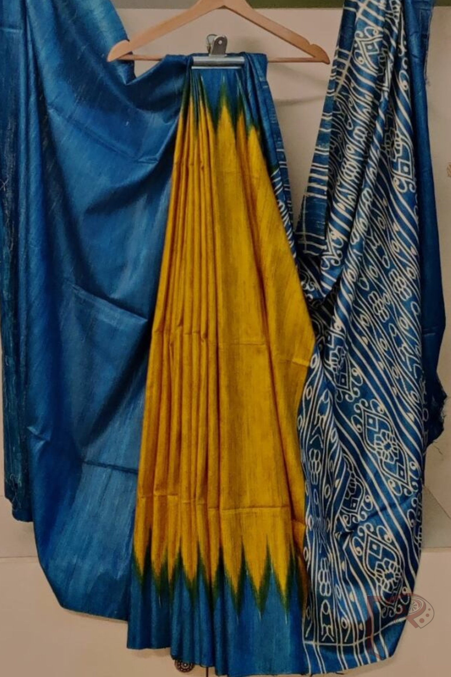 Tussar Tales – Golden Yellow and Copper Sulphate Blue Desi Tussar Silk Saree with Temple Border and Sambalpuri-Style Printed Pallu