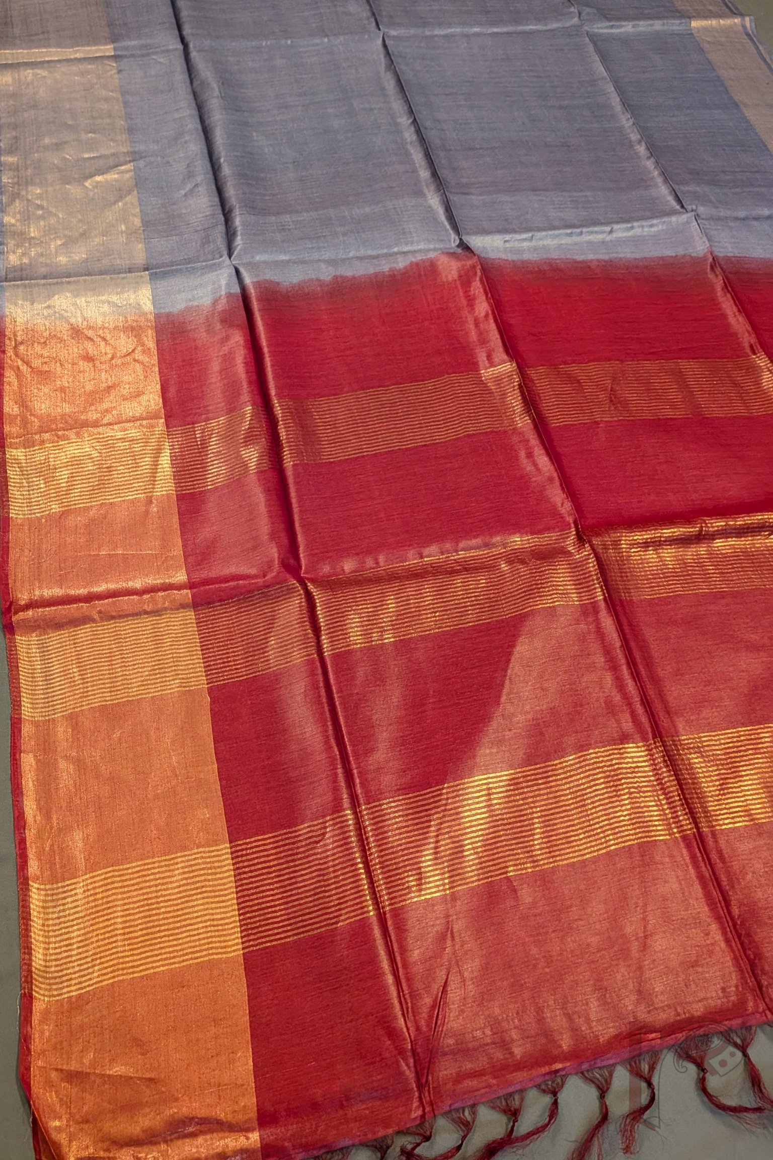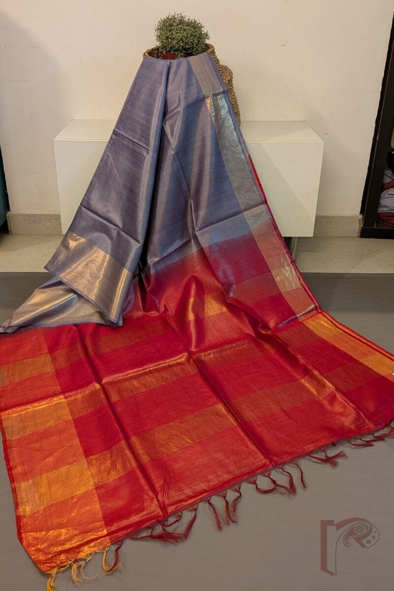 The beauty of these sarees lies in their solid, soothing body colours paired with striking contrast pallus and blouses, creating a graceful visual rhythm. Accentuated with **rich zari borders—broad at the bottom and delicately slimmer on the top—**these sarees frame the drape beautifully while enhancing the wearer’s silhouette. The pallus are thoughtfully detailed with consecutive gold woven stripes, lending a festive glow without overpowering the natural charm of tussar silk.
