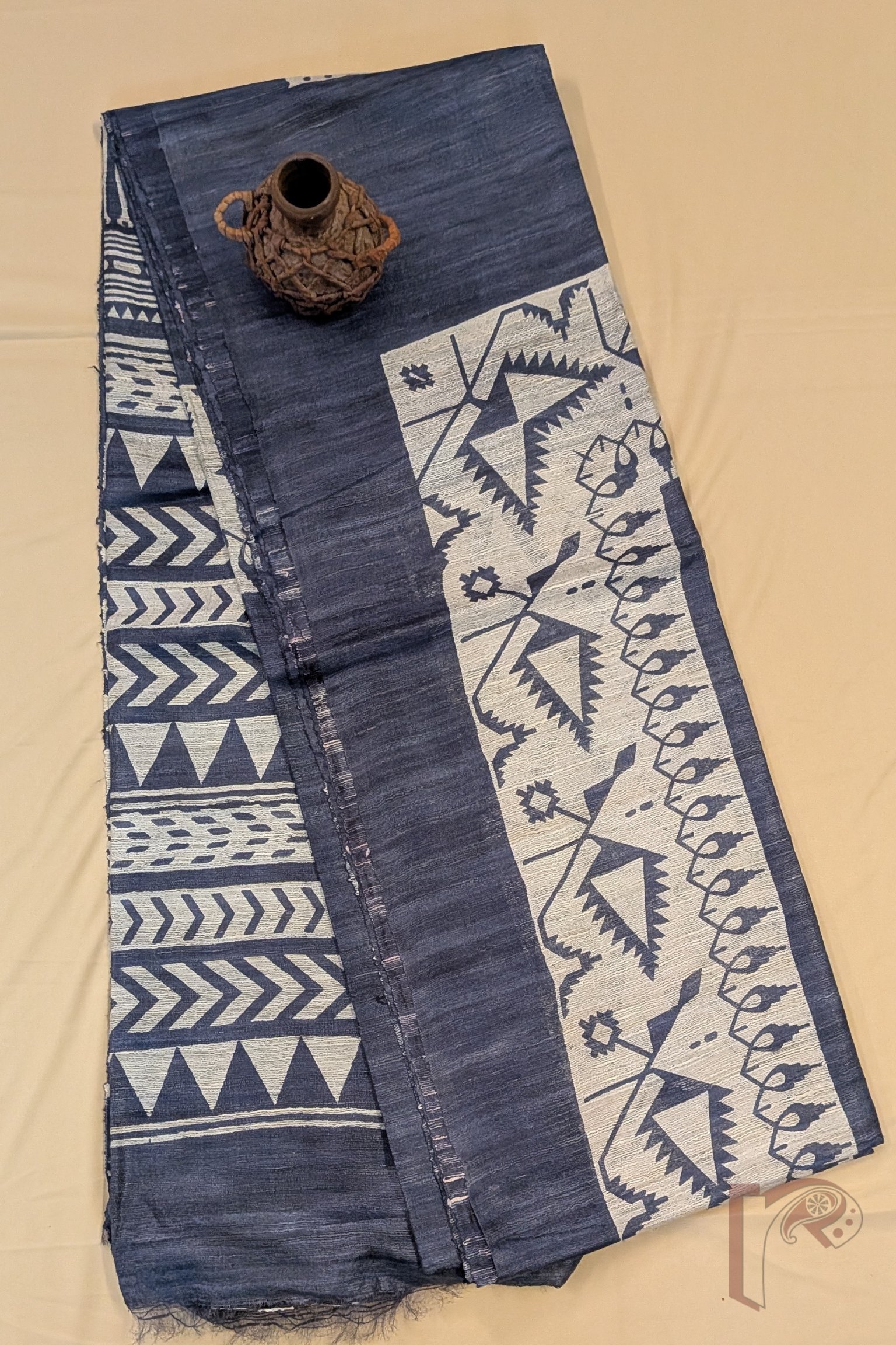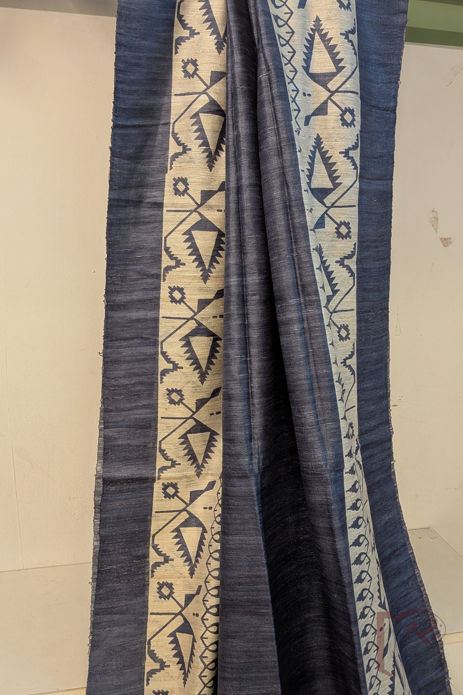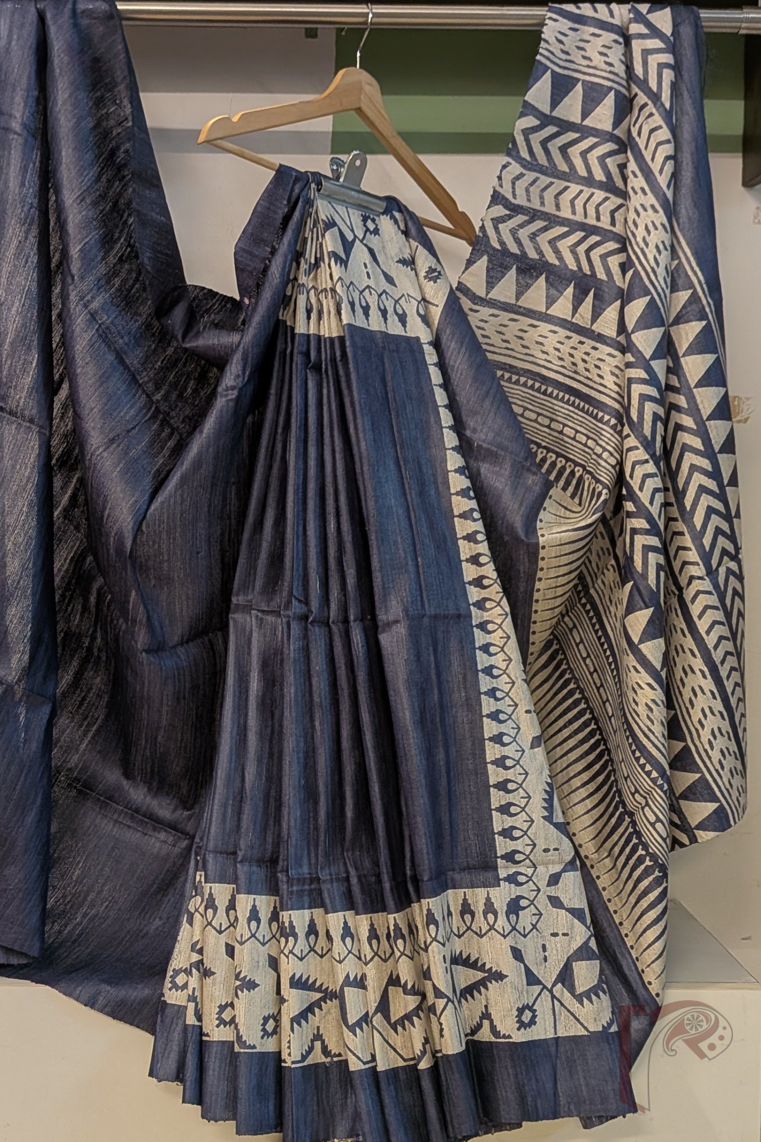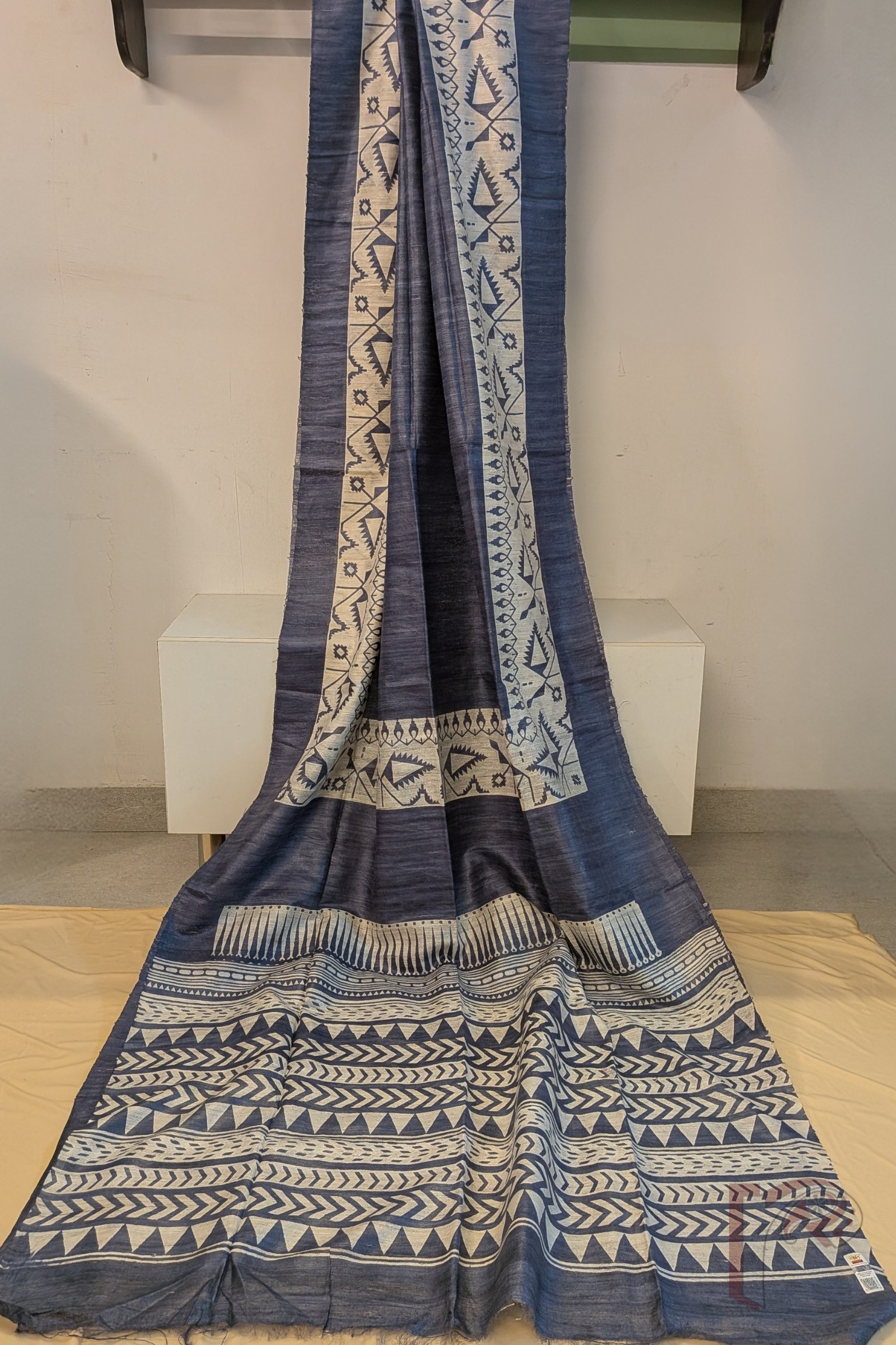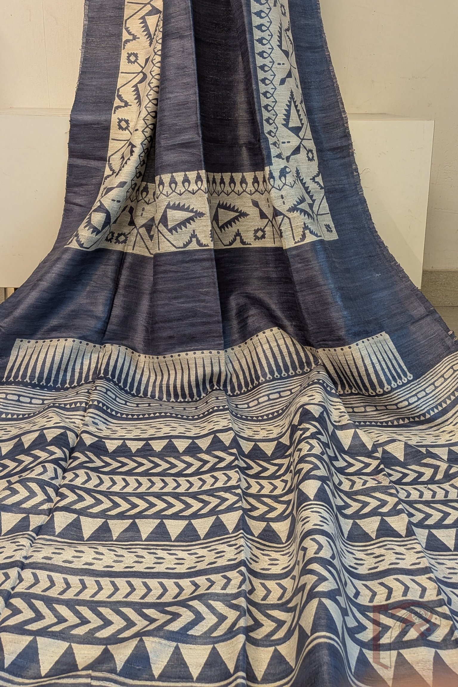 This smart grey Tussar silk saree stands out with its cream-beige tribal prints adorning both the border and pallu. The border showcases horizontal bands of triangles, chevron lines, and dotted motifs, while the pallu features abstract kite-inspired forms with triangular heads. Finished with a solid grey blouse, this saree reflects a contemporary tribal aesthetic rooted in traditional craftsmanship.