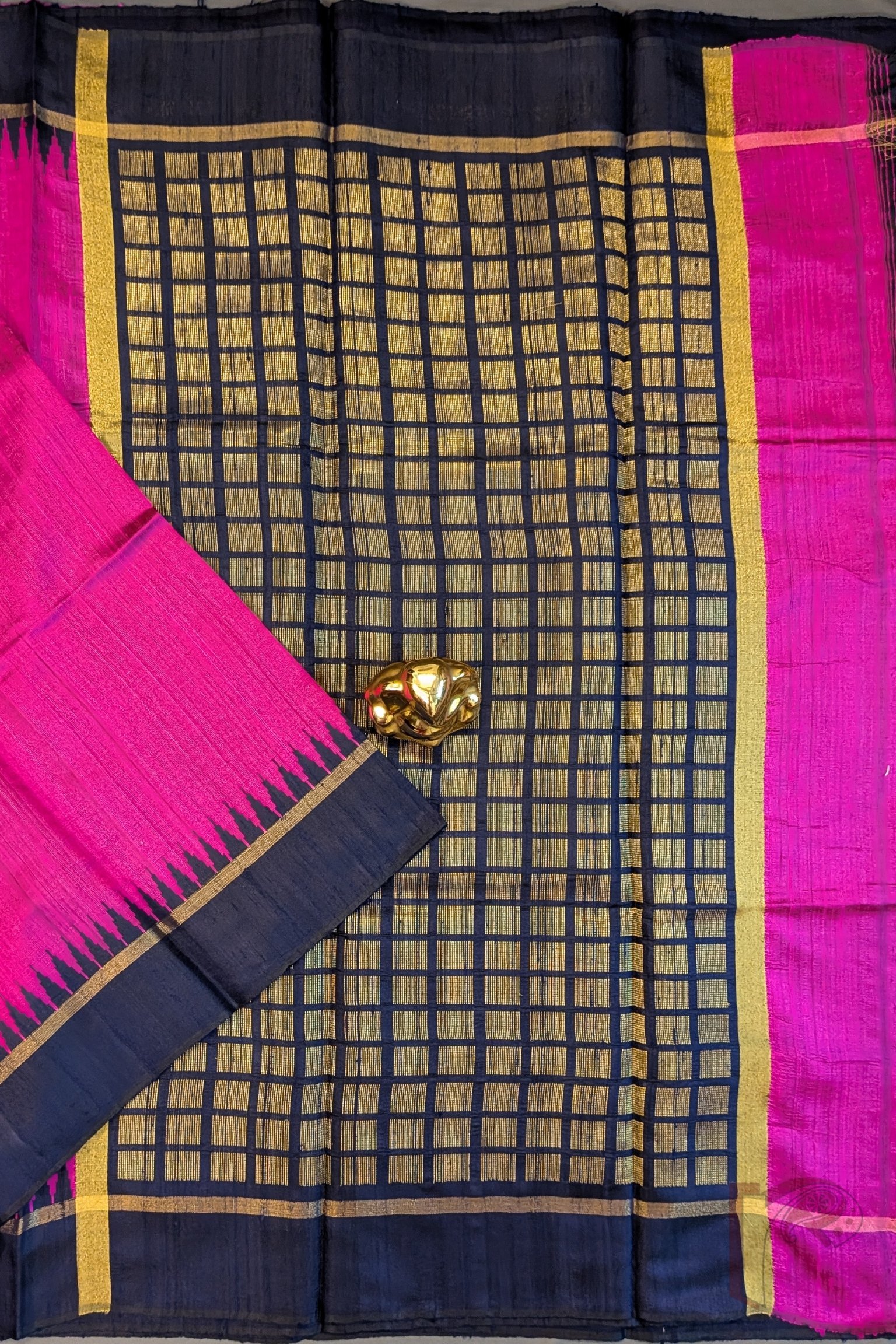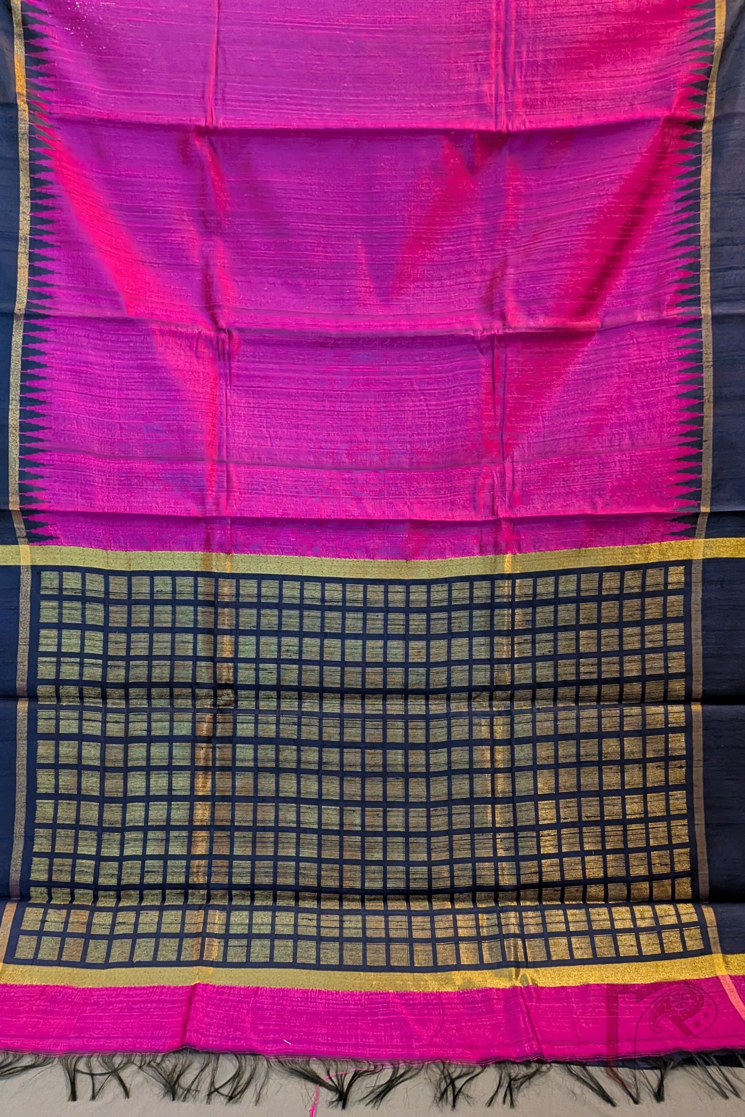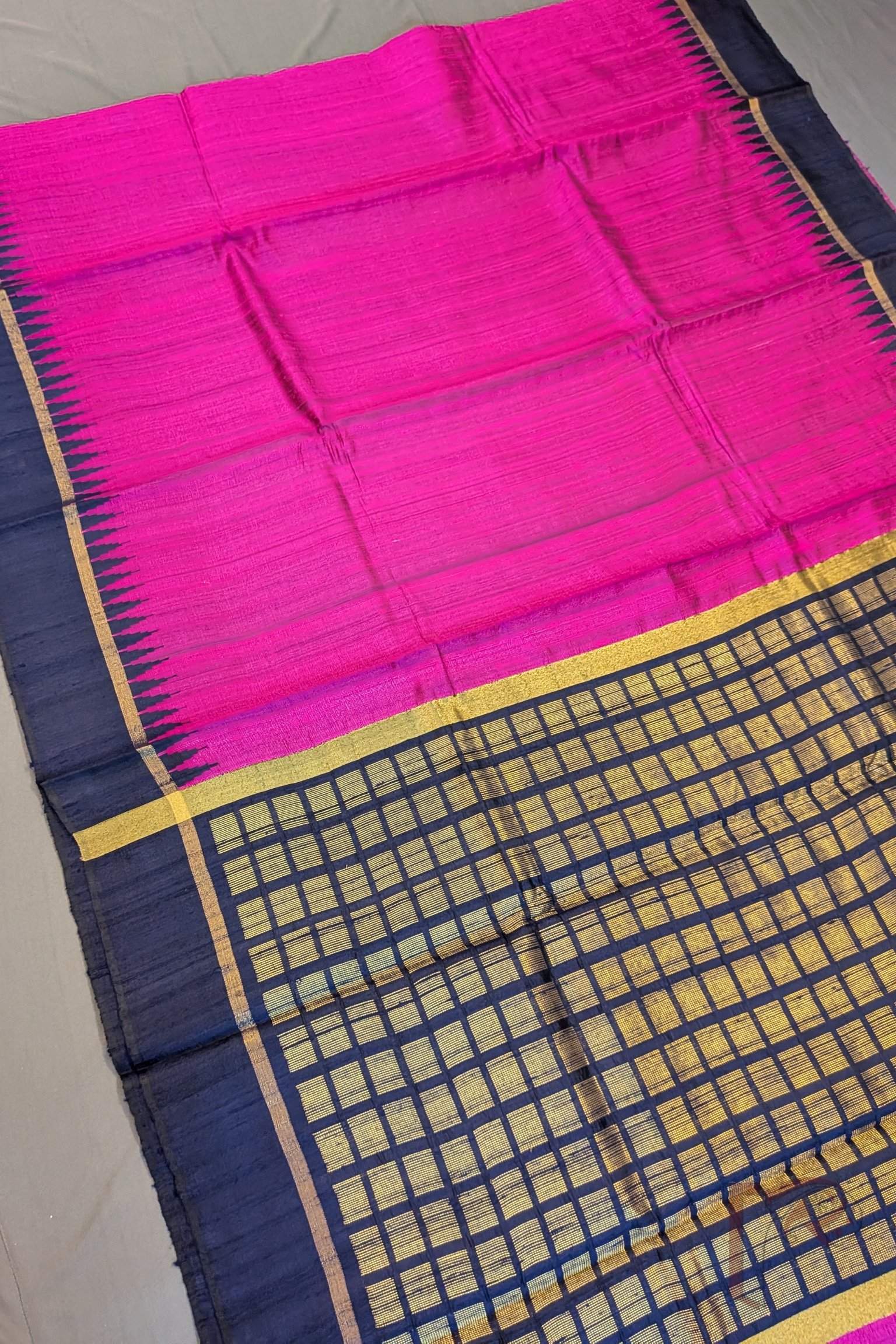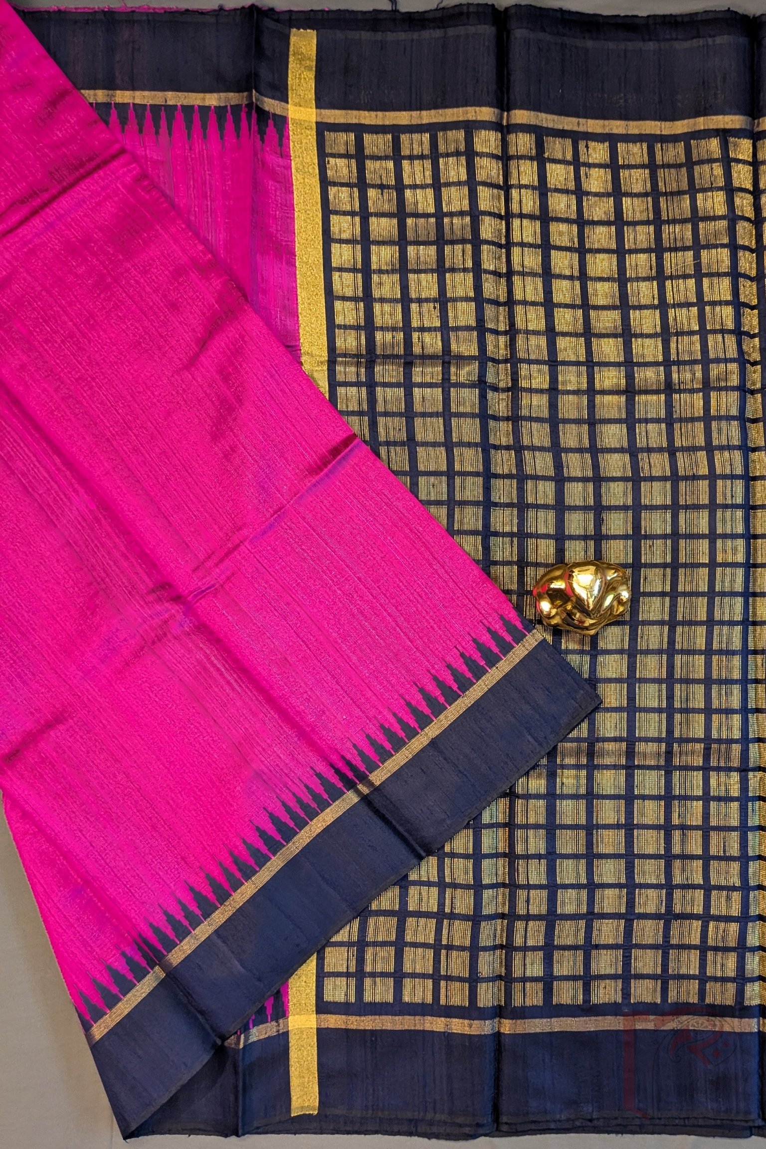 Tussar Tales – Hot Pink Raw Silk Tussar Saree with Navy Blue Temple Border and Gold Check Pallu