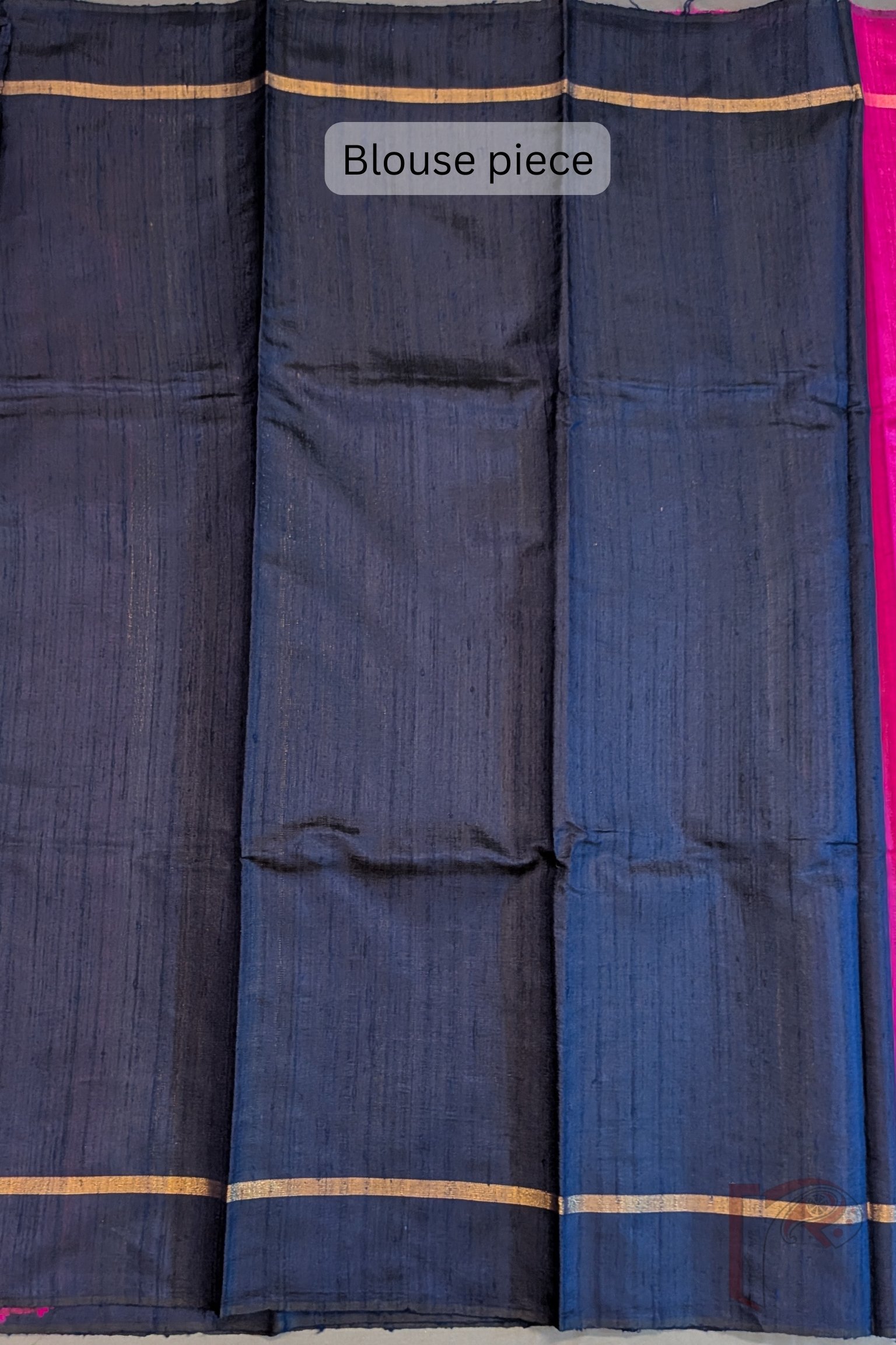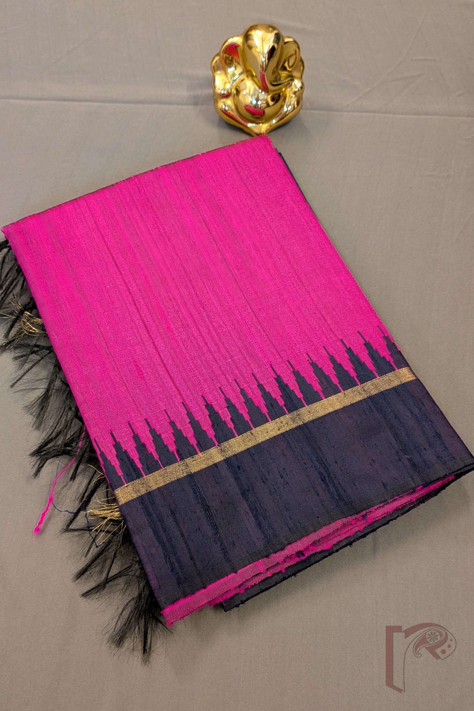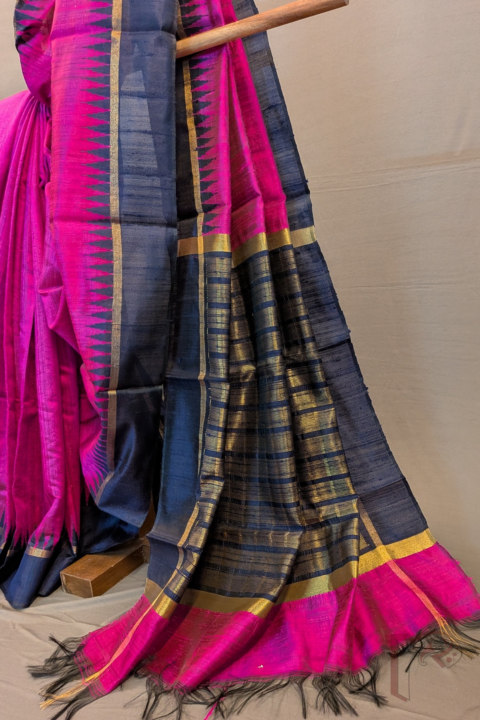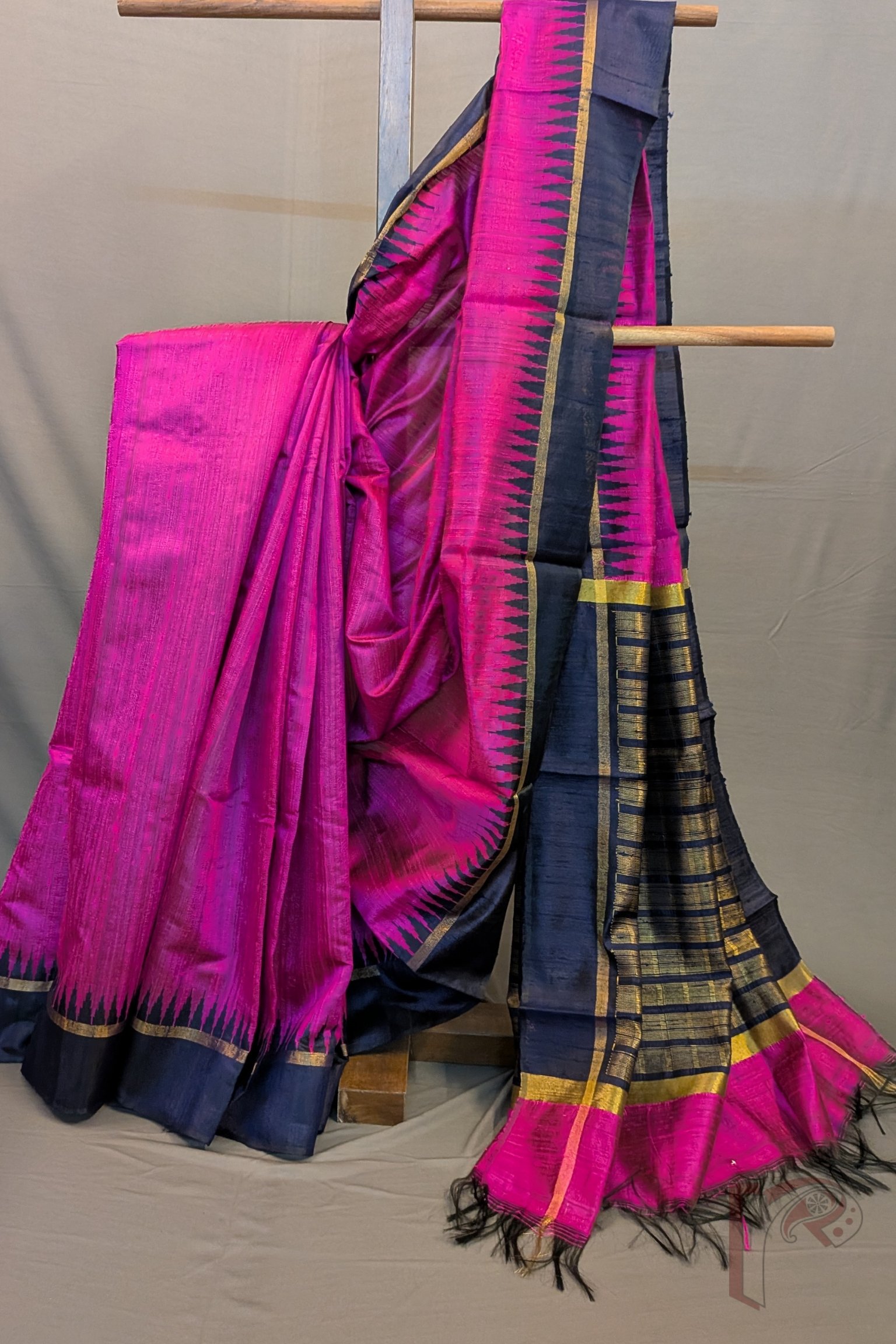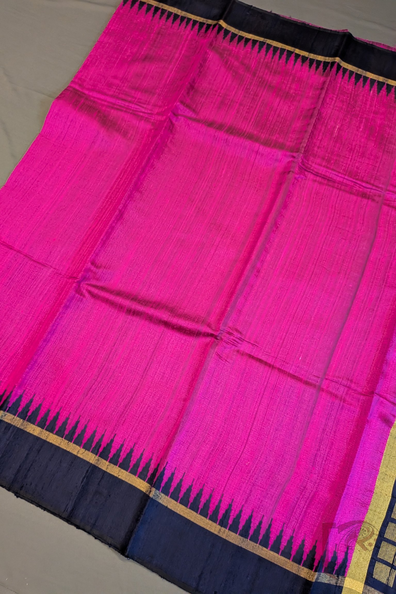 Tussar Tales – Hot Pink Raw Silk Tussar Saree with Navy Blue Temple Border and Gold Check Pallu
