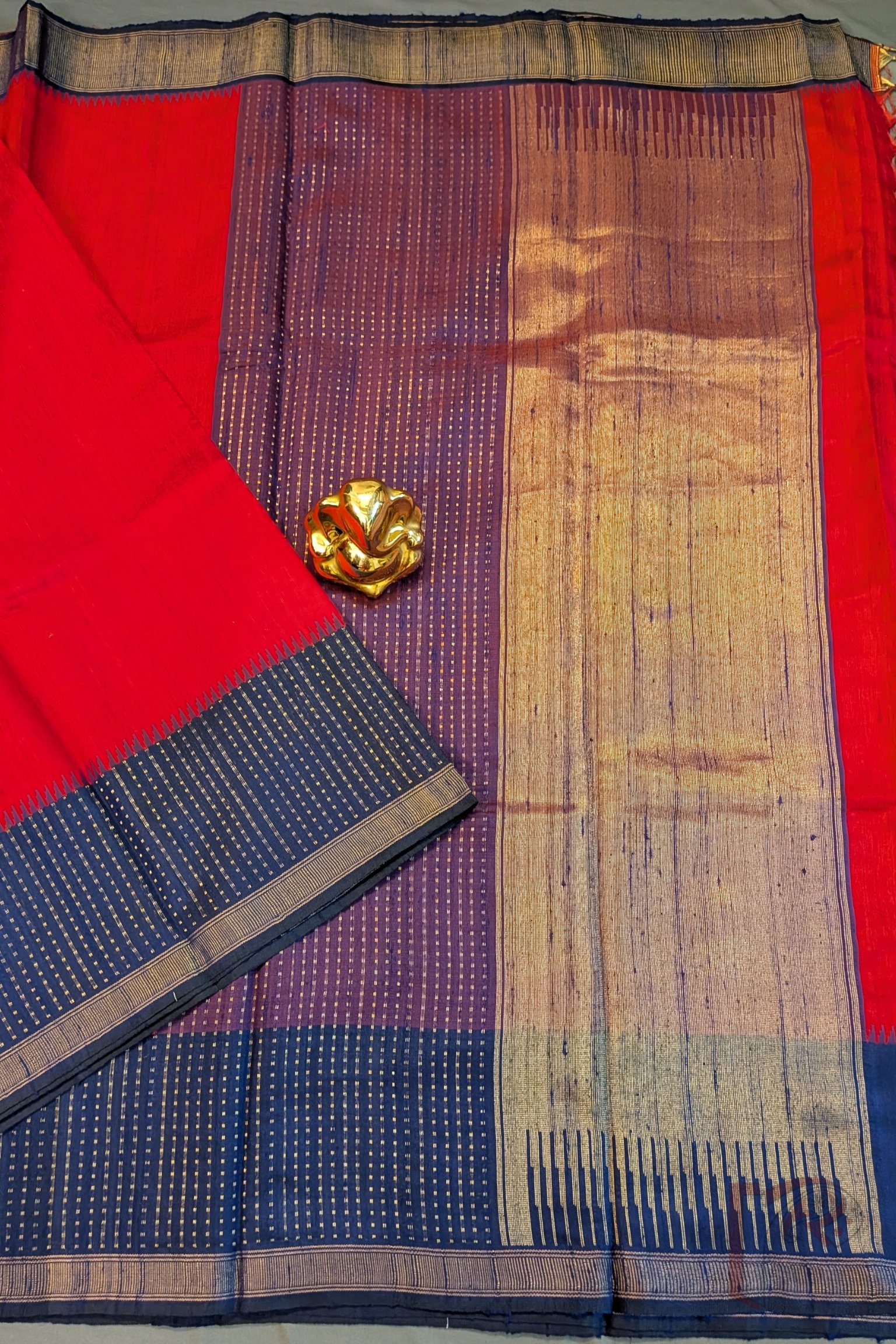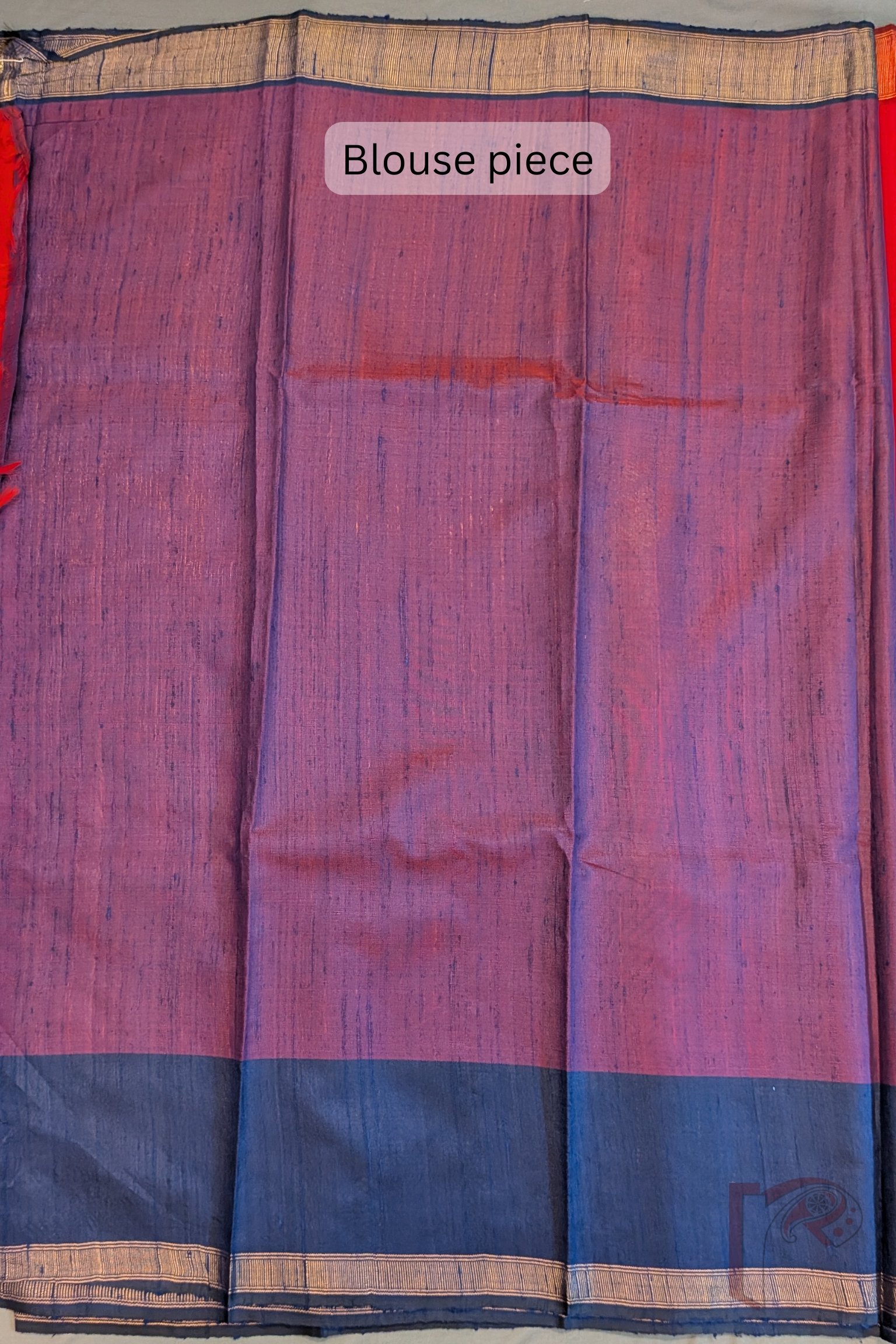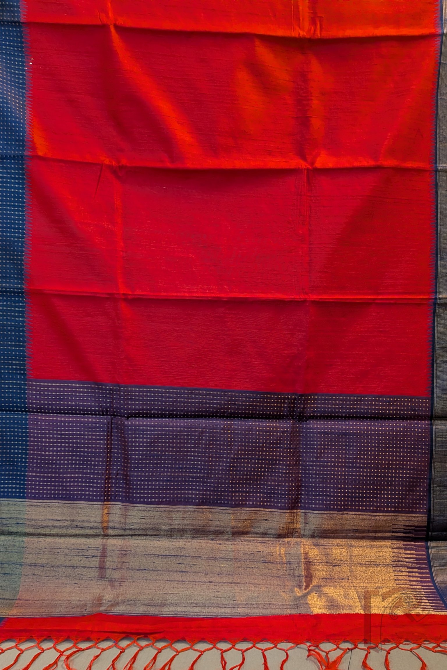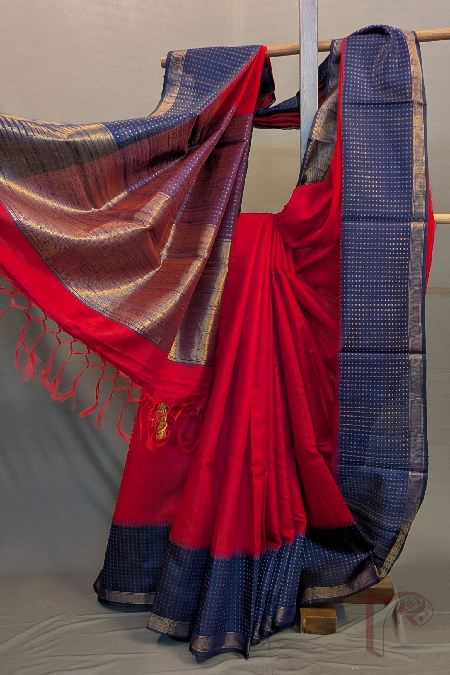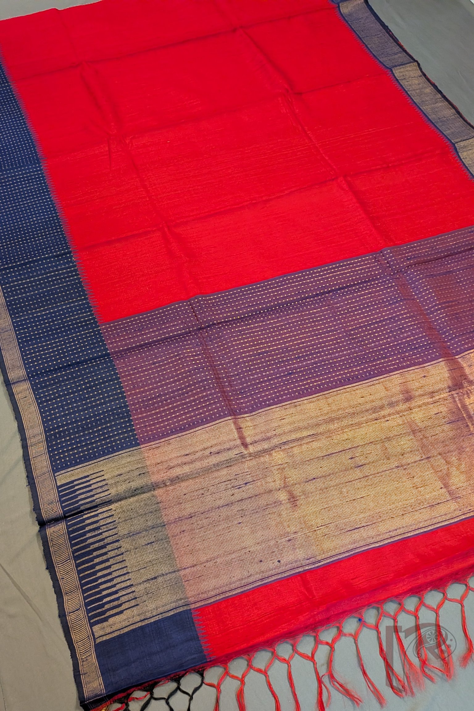 Striking and timeless, this red handwoven raw silk tussar saree captures the essence of traditional elegance with a festive soul. The vibrant red body is beautifully framed by a royal blue contrast border, delicately woven with small square gold thread booties that continue seamlessly across the entire pallu, creating a cohesive and luxurious look. Adding movement and grandeur, the pallu is further enhanced with a broad gold zari wave, lending a rich shimmer that stands out with every drape. The natural texture of raw tussar silk brings depth to the colour, while maintaining a graceful fall and breathable comfort. Finished with a plain blue raw silk blouse, this saree is a perfect choice for weddings, rituals, and celebratory evenings where tradition meets refined craftsmanship.