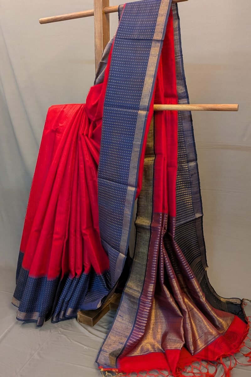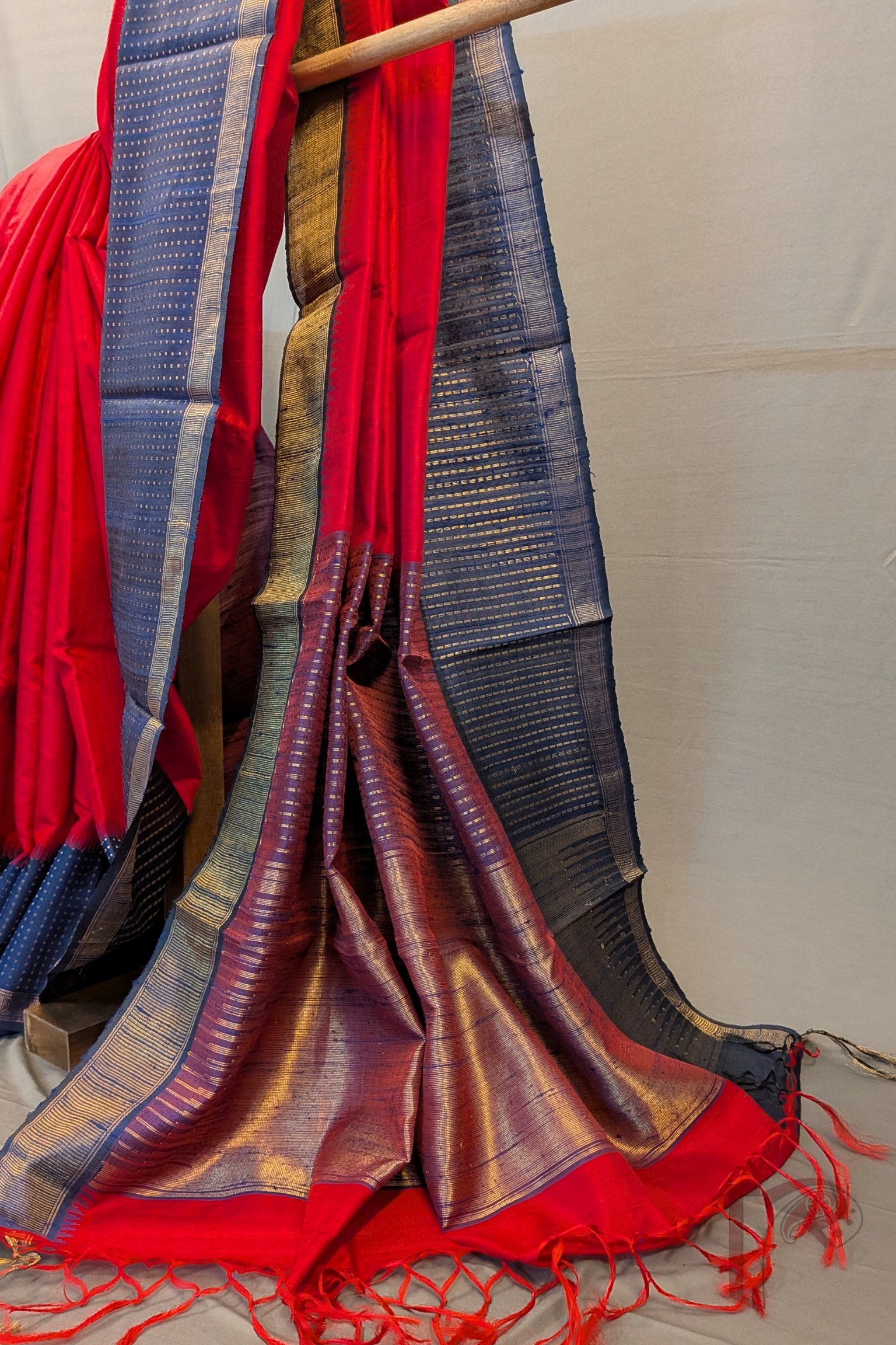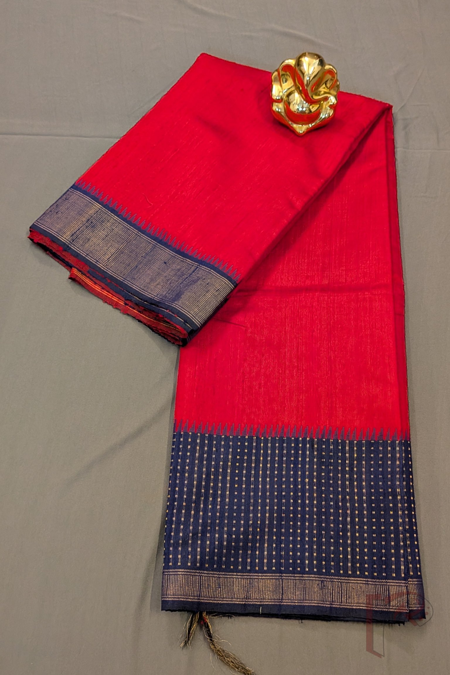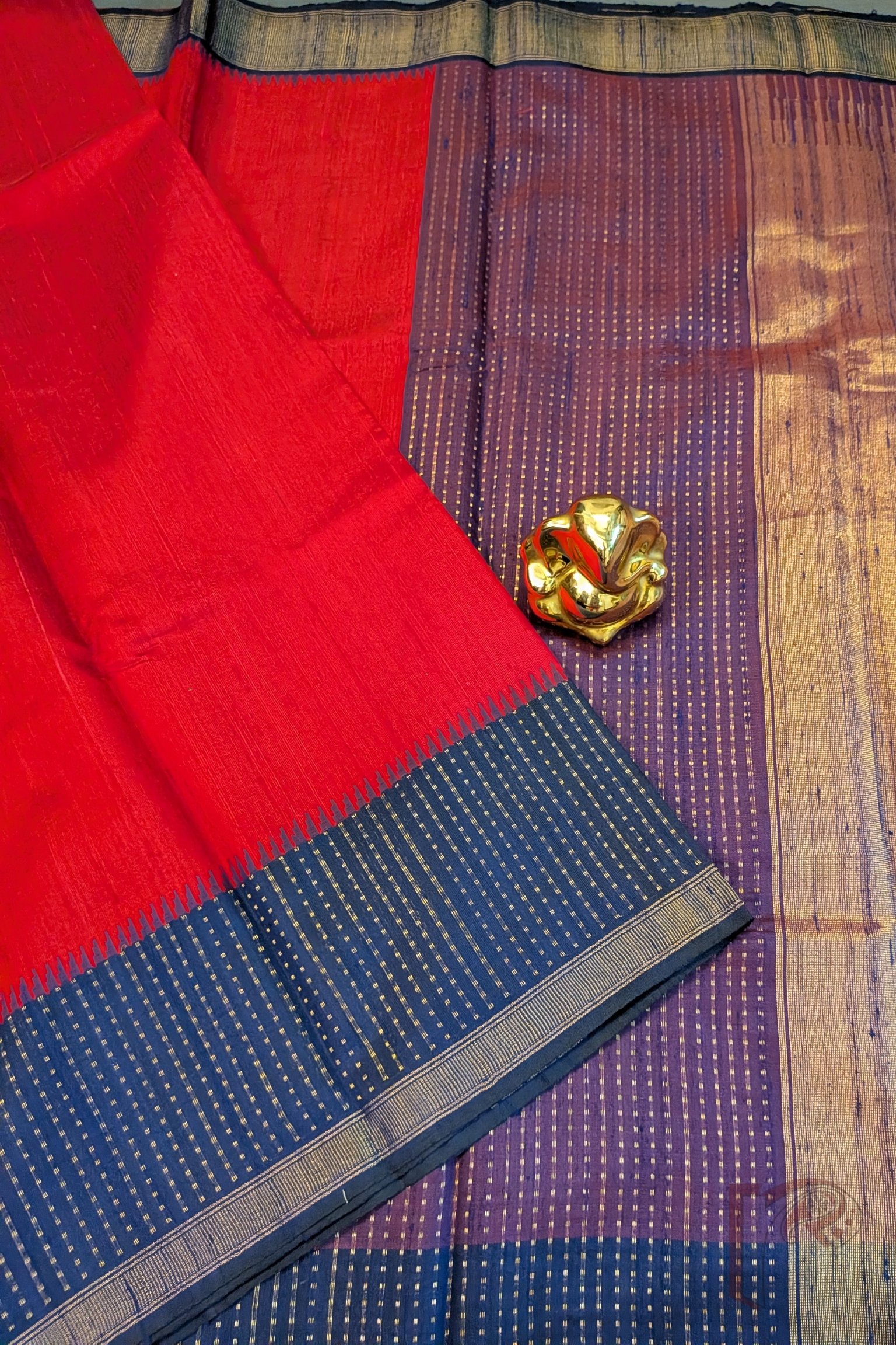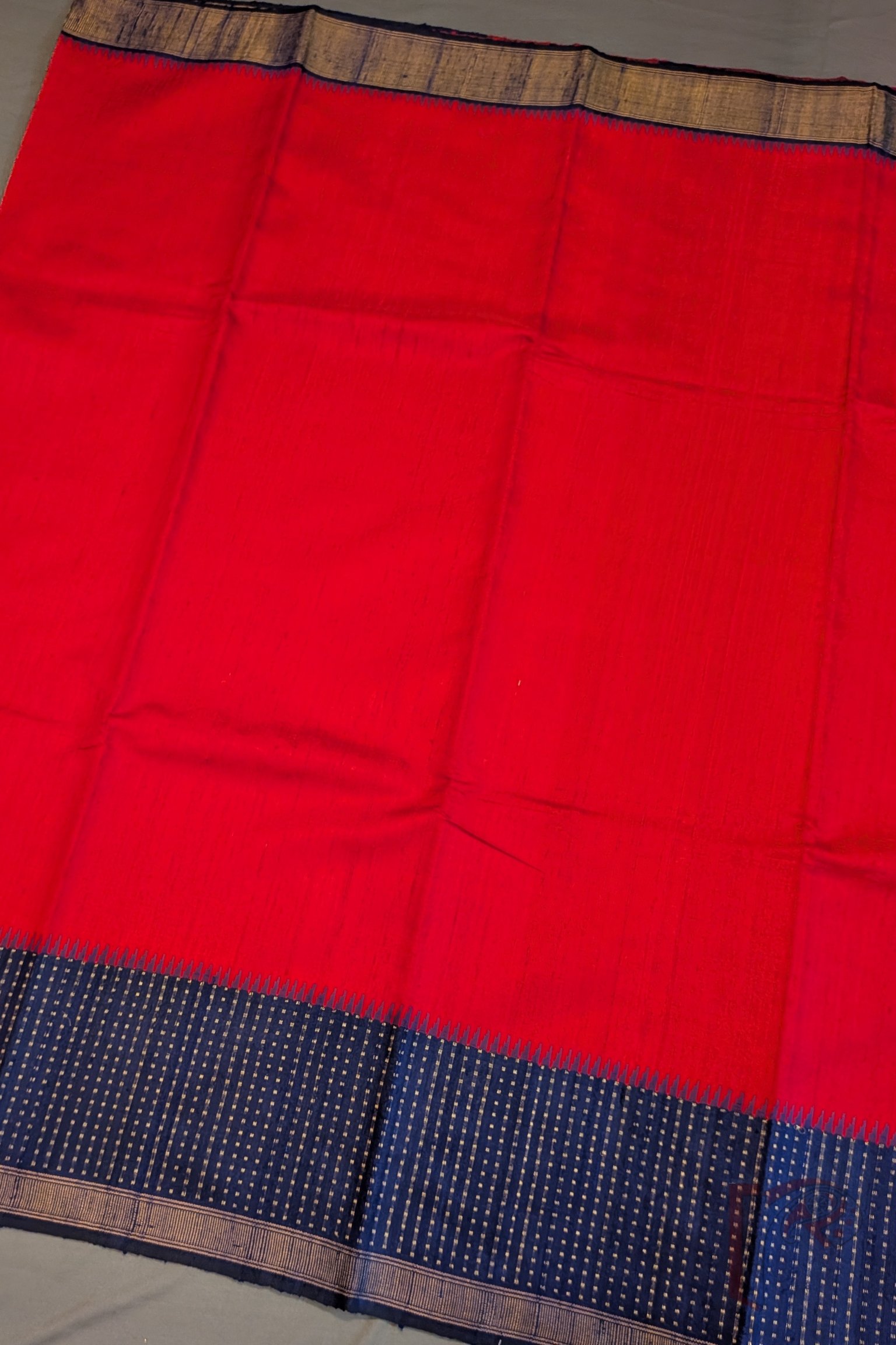 Striking and timeless, this red handwoven raw silk tussar saree captures the essence of traditional elegance with a festive soul. The vibrant red body is beautifully framed by a royal blue contrast border, delicately woven with small square gold thread booties that continue seamlessly across the entire pallu, creating a cohesive and luxurious look. Adding movement and grandeur, the pallu is further enhanced with a broad gold zari wave, lending a rich shimmer that stands out with every drape. The natural texture of raw tussar silk brings depth to the colour, while maintaining a graceful fall and breathable comfort. Finished with a plain blue raw silk blouse, this saree is a perfect choice for weddings, rituals, and celebratory evenings where tradition meets refined craftsmanship.