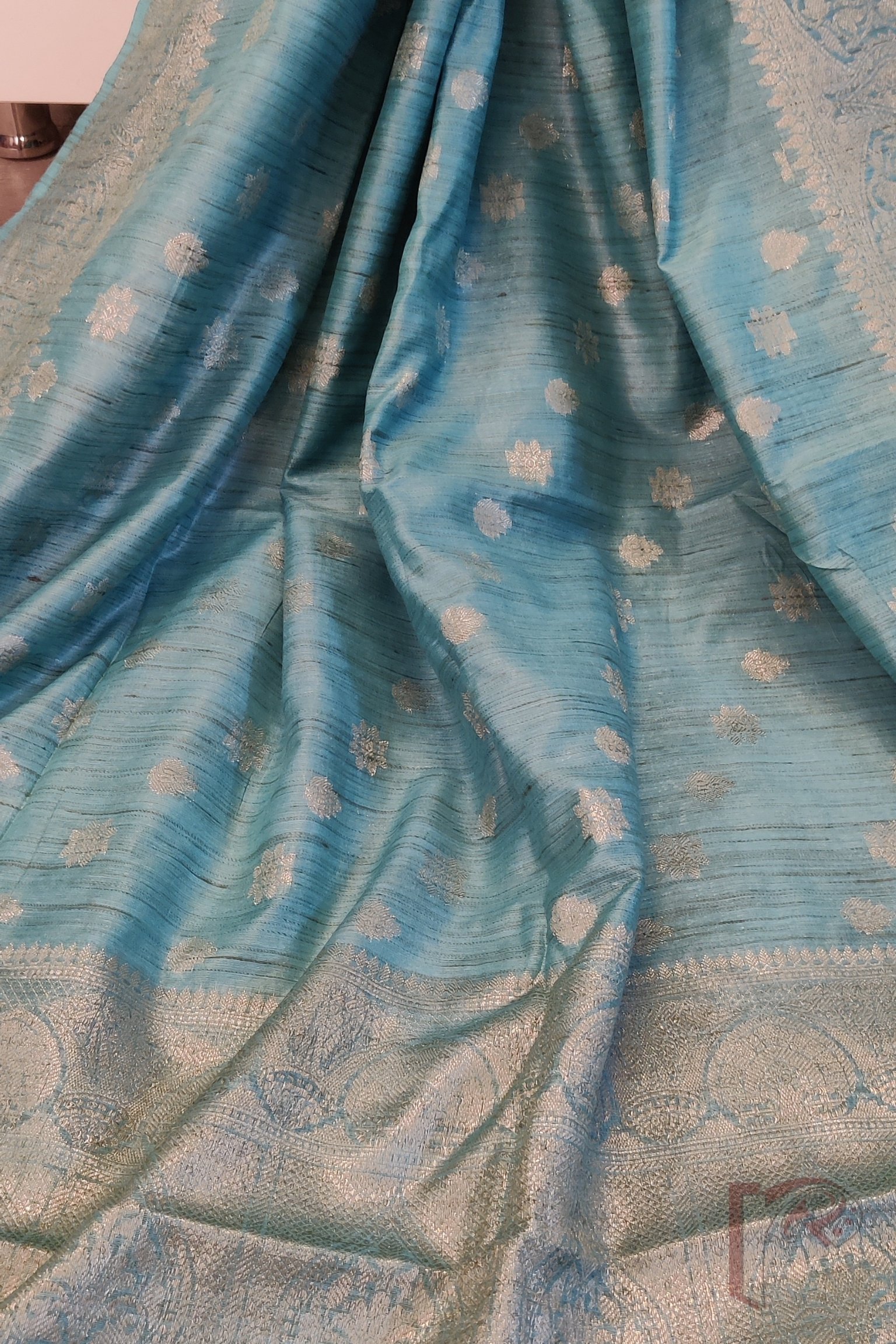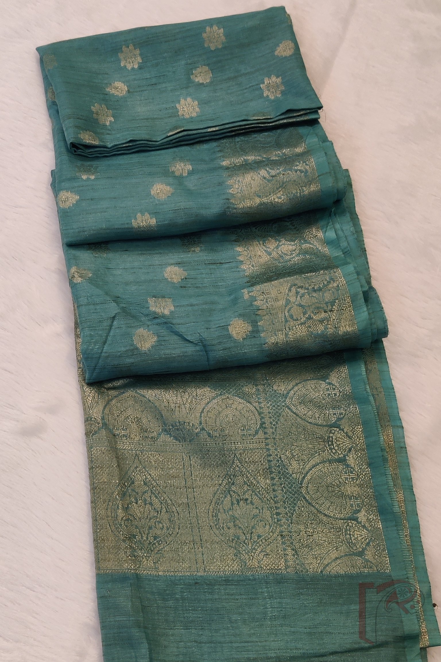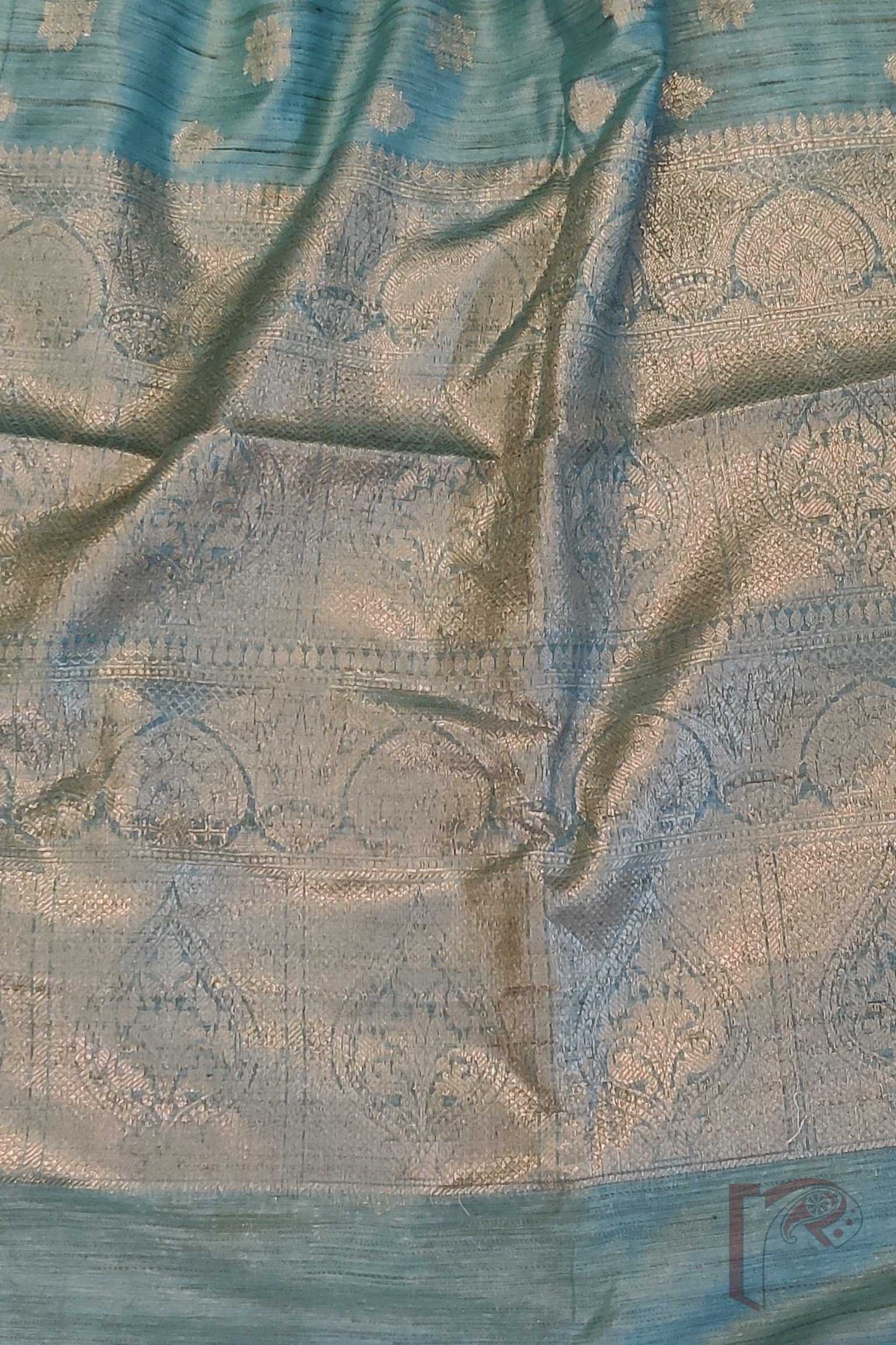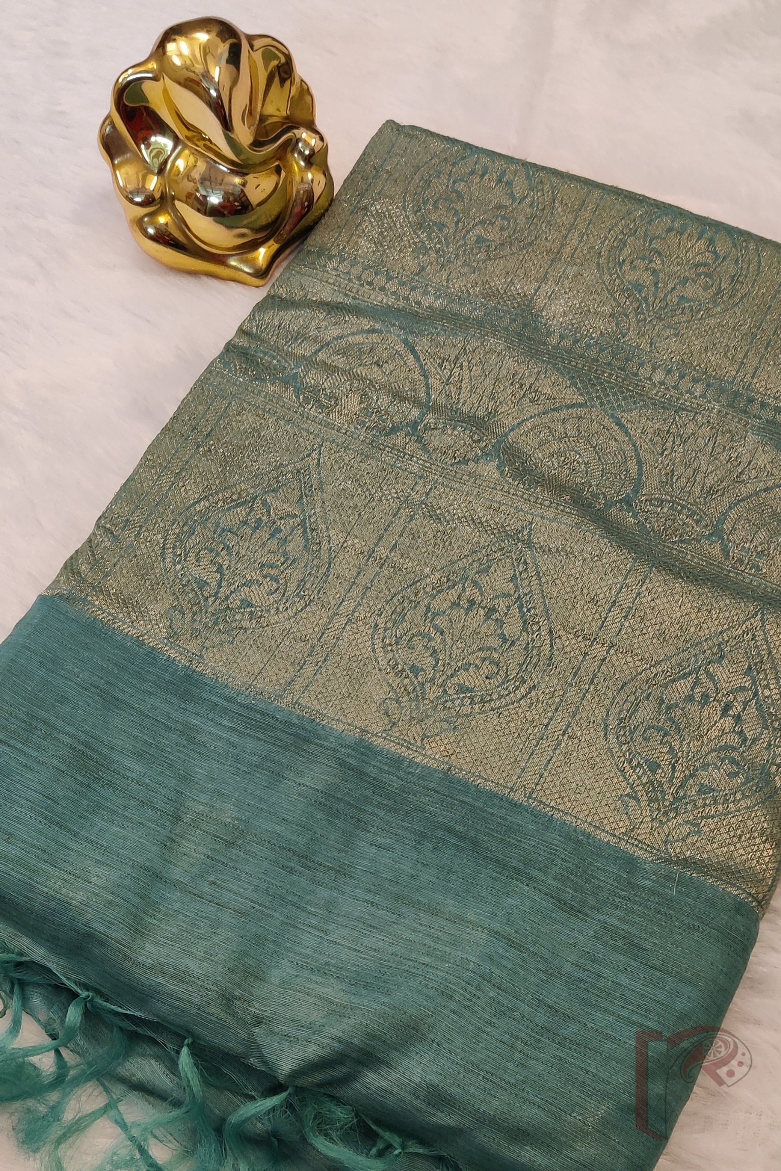 Tussar Tales – Sea Green Semi Munga Tussar Silk Saree with Golden Jacquard Pallu and Woven Motifs