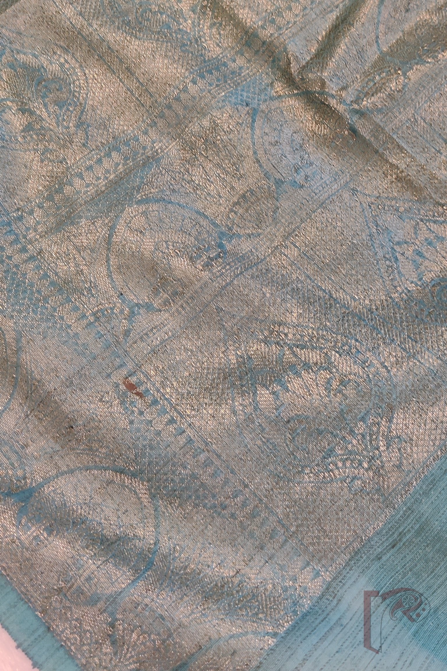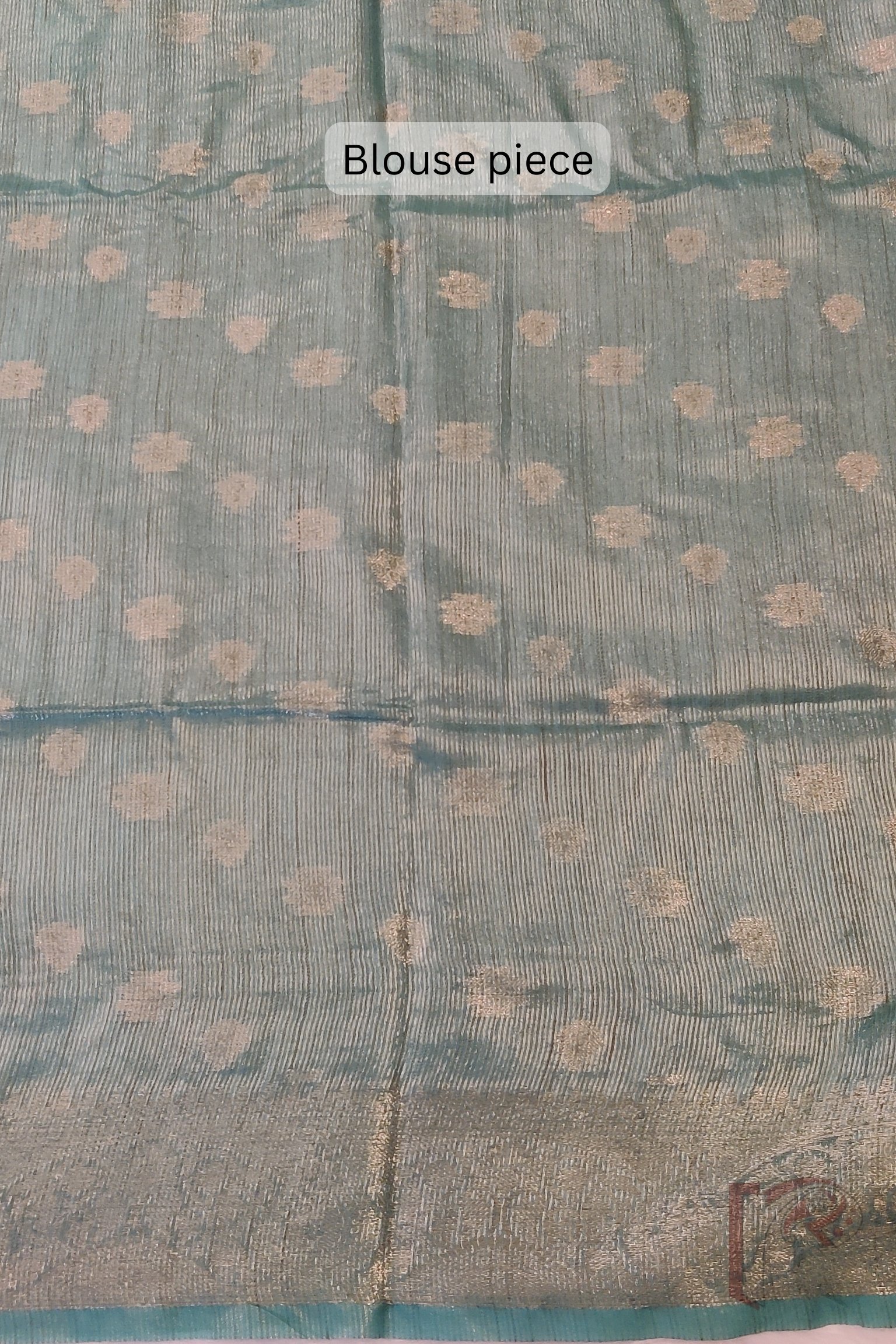 Refreshing and elegant, this sea green semi tussar silk saree brings together the serenity of nature and the brilliance of gold. The saree body is detailed with tiny golden woven motifs, while the jacquard pallu shimmers with intricate gold patterns, adding depth and grace. The matching blouse, featuring pinstripes and delicate motifs, completes the look with finesse. This saree is a beautiful choice for those who love light festive tones with a luminous finish.