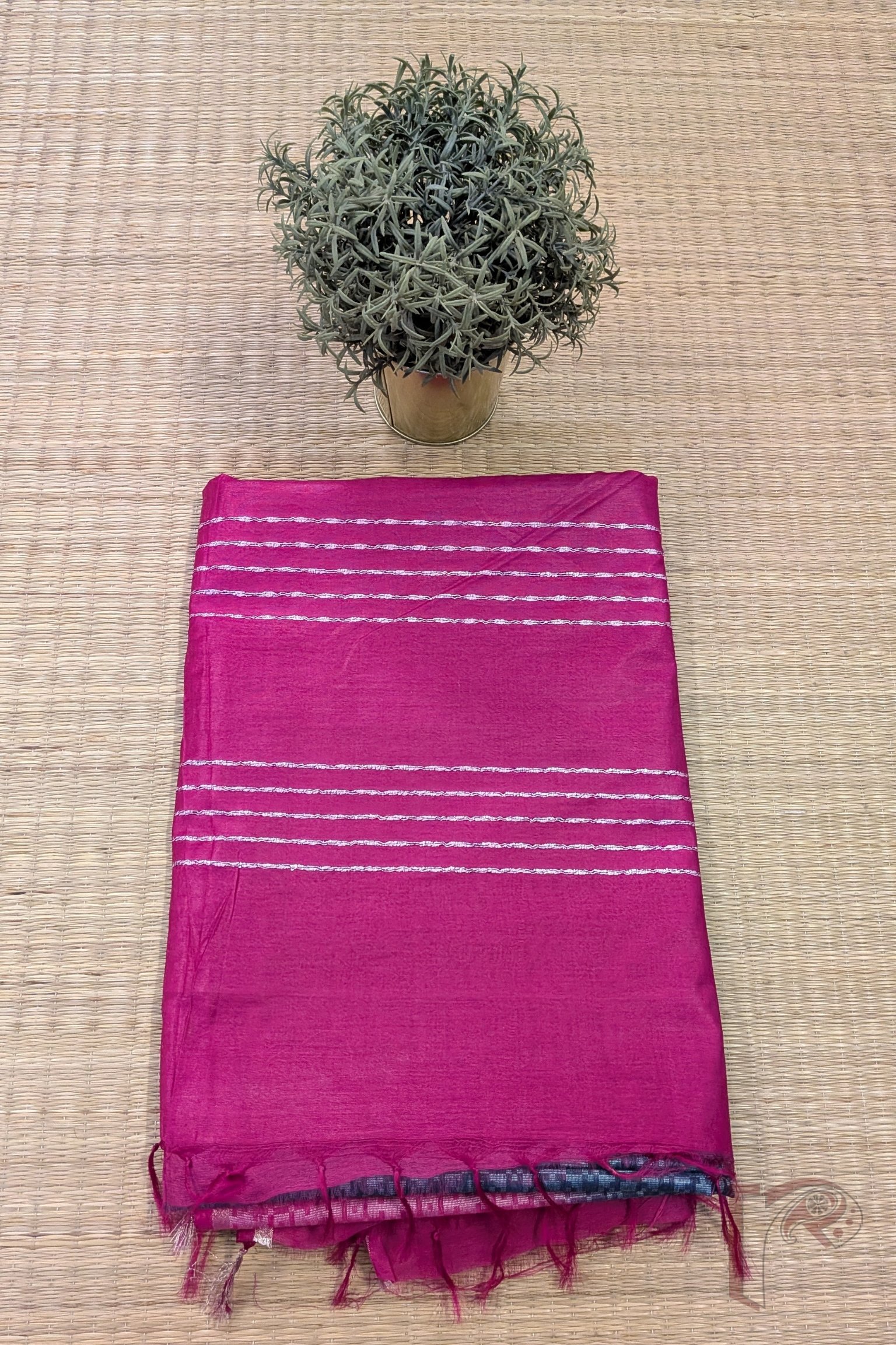 The Navy Blue and Bright Pink Linear Embroidery Kota Viscose Saree is a striking fusion of bold color and delicate craftsmanship. The navy blue body features parallel dull white thread lines, lending texture and finesse. The vibrant bright pink pallu with silver and white stripes brings a pop of festive vibrancy, beautifully matched with a plain pink blouse. The Kota viscose blend adds lightness and sheen, making it perfect for evening gatherings or festive occasions where modernity meets heritage.