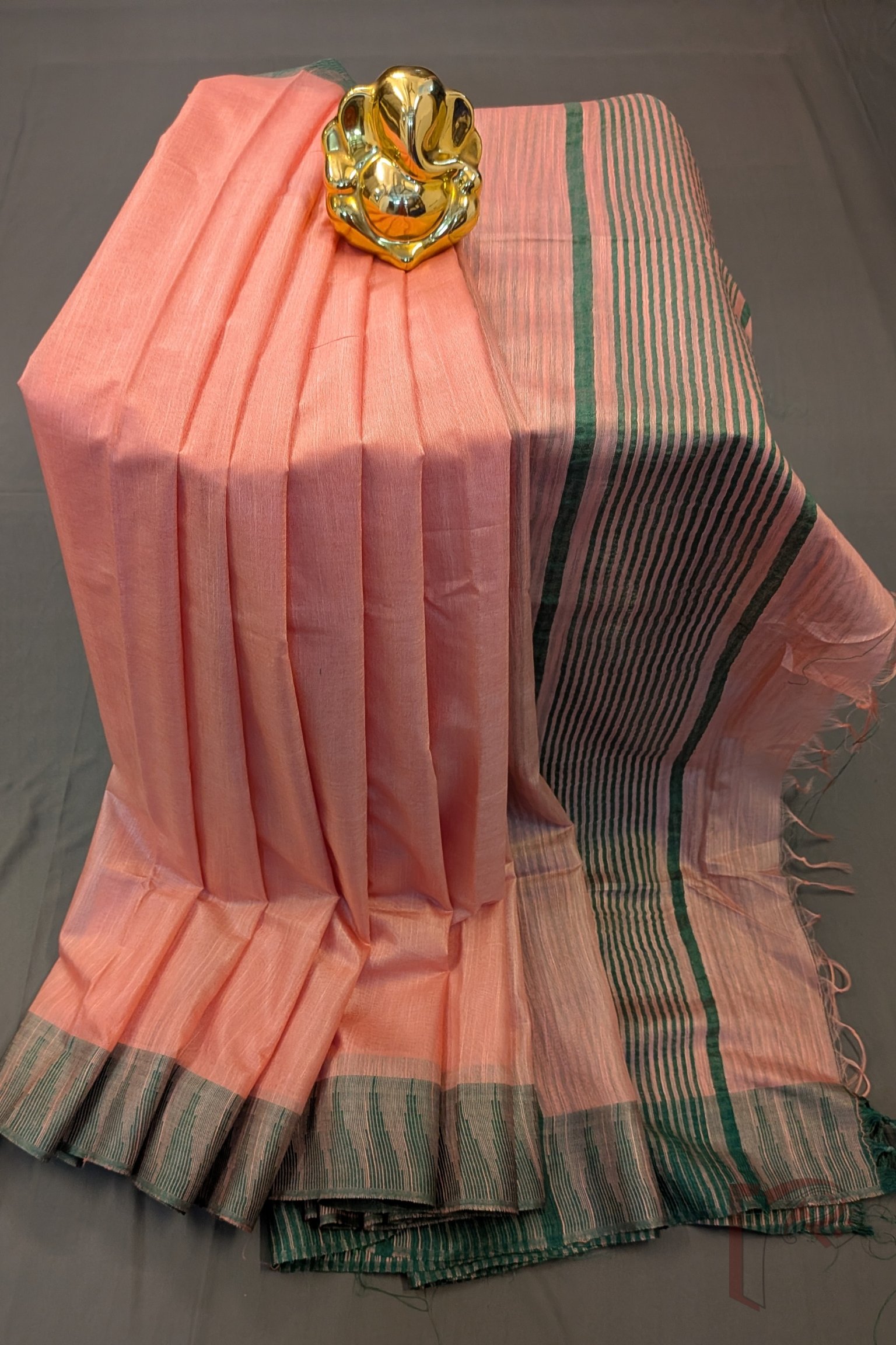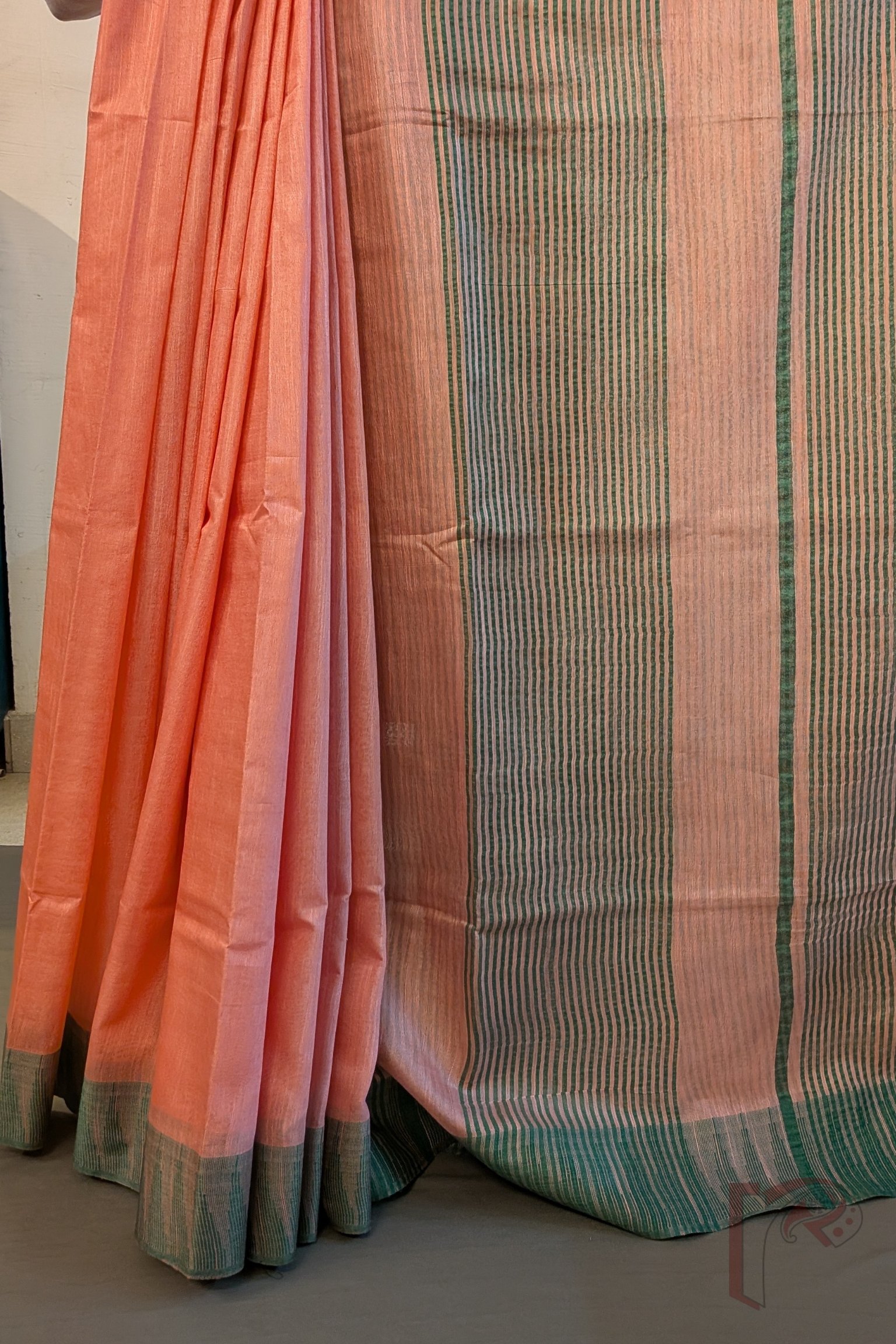 Delicate yet vibrant, the Peachish Pink and Green Temple Border Kota Viscose Saree radiates feminine elegance. The soft peach-pink body is uplifted by a fresh green temple border, creating a pleasing contrast. The green striped pallu and blouse piece add structure while maintaining visual lightness. Crafted from feather-light Kota viscose, this saree is perfect for festive mornings and graceful daytime occasions where subtle beauty takes center stage.
