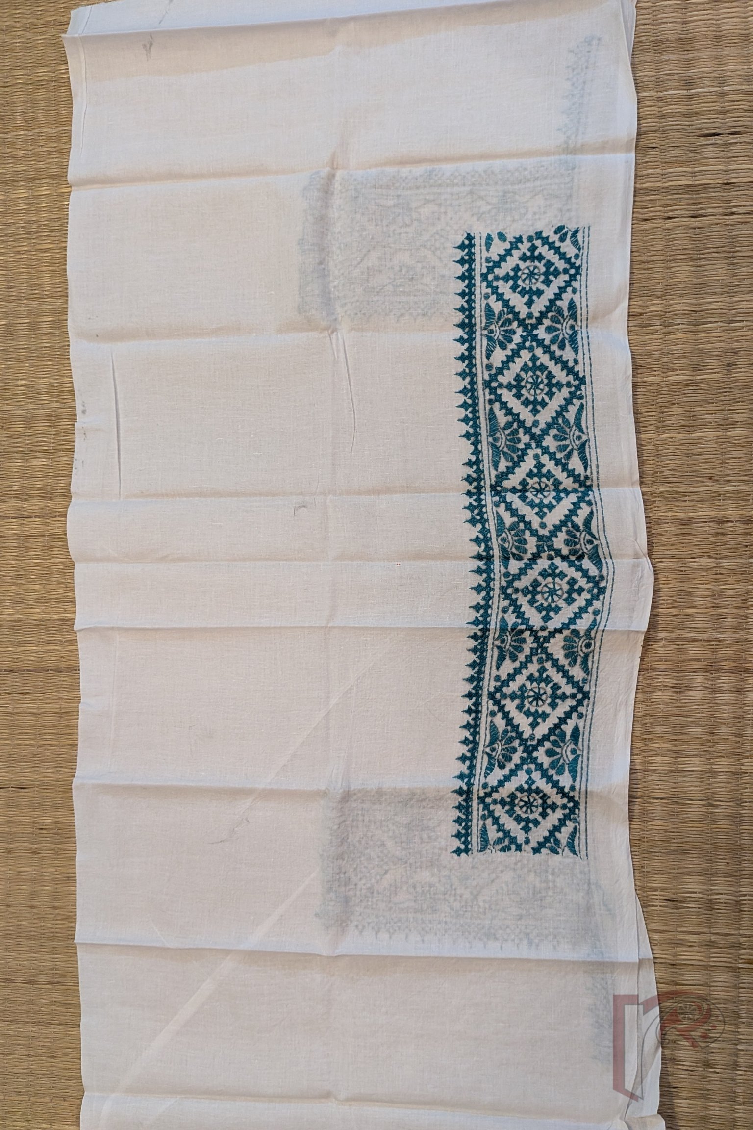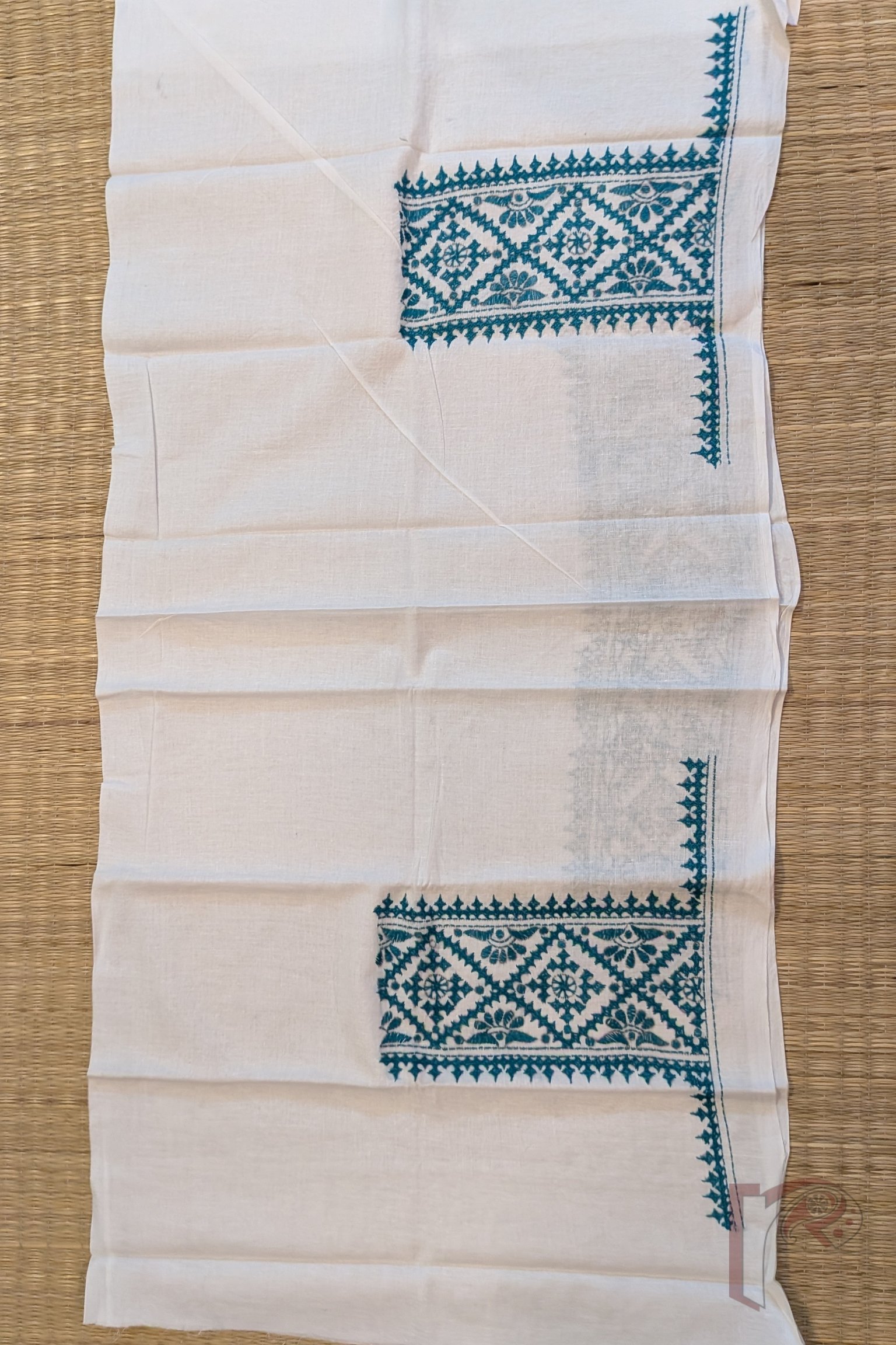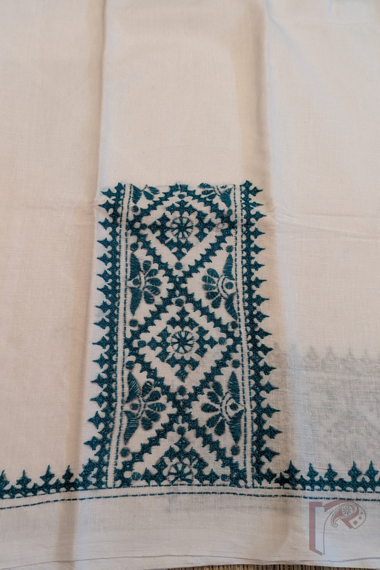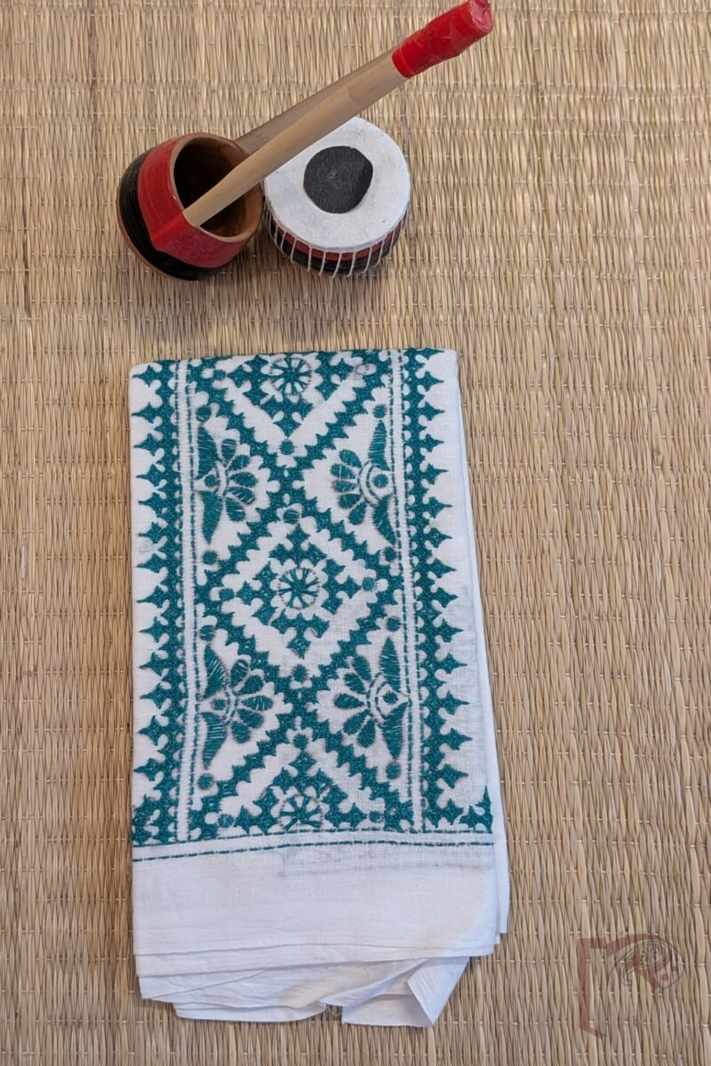 White Cotton Blouse with Sea Green Vertical Kutch Embroidery
